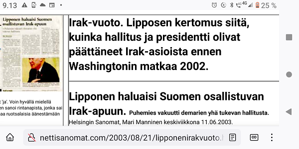 kaikki eivät pimitä! "Tasavallan presidentin ja johtavan hallituspuolueen puheenjohtajan turvallisuuspoliittiset sukset ovat pahasti ristissä. Tämä käy ilmi kahdesta kesällä ilmestyneestä lehtihaastattelusta." Iltalehti. Timo Hakkarainen. Keskiviikko 3.9.2003. Halosen ja Lipposen linjat pahasti ristissä. |