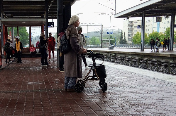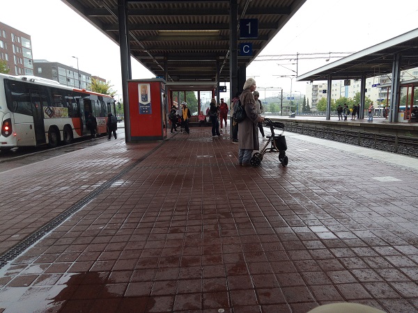Torstaina 31.8.2023. Monenlaisia ihmisiä asemalla. Sateen hiukan tauottua ihmiset odottavat junaansa tällä laiturilla Kirkkonummen suuntaan ja raiteiden toisella puolella Helsingin suuntaan. Uusimaa. Espoon asema. Torstaina 31.8.2023 13:34. Pertti Manninen.
