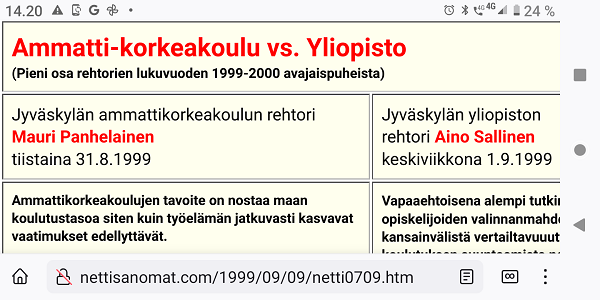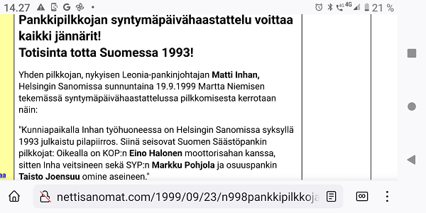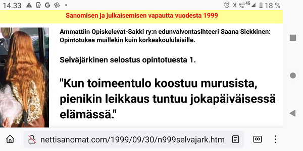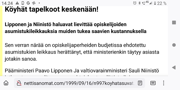 Sanomanetti - Sunnuntaina 8.10.2023. Nettisanomia heinäkuulta 1999 - elokulta 1999 - syyskuulta 1999. --- Arkisto. Keskiviikkona 27.9.2023. Selkänahka vaarassa! Lisää Leikkauksia tulossa? 12.8.1999- - Arkistosta 1999. Opiskelijoiden kurmuutus. Kurmuuttajat: 12.8.1999. Ben Zyskowicz, kokoomuksen eduskuntaryhmän puheenjohtaja Lue! 12.8.1999. Janne Virkkunen, Helsingin Sanomien vastaava päätoimittaja Lue! 16.9.1999. Paavo Lipponen, pääministeri Lue! 16.9.1999. Sauli Niinistö, valtiovarainministeri Lue! 16.9.1999. Ben Zyskowicz, kokoomuksen eduskuntaryhmän puheenjohtaja Lue! 16.9.1999. Suvi Linden, kulttuuriministeri Lue! 30.9.1999. Pekka Kettunen, Jyväskylän kaupunginjohtaja Lue! 30.9.1999. Suvi Linden, opetusministeri Lue! Puolustajat: 12.8.1999. Vertti Kiukas, Helsingin yliopiston ylioppilaskunnan hallituksen jäsen Lue! 30.9.1999. Saana Siekkinen, Ammattiin Opiskelevat-Sakki ry:n edunvalvontasihteeri Lue! - 24 vuotta sitten: torstaina elokuun 12. päivänä 1999 Köyhät opiskelijat, painukaa helvettiin! Ette maksa tarpeeksi pankinomistajien tukea! "Kokoomuksen lähtökohtana on ollut tiukka budjettilinja." Ben Zyskowicz, kokoomuksen eduskuntaryhmän puheenjohtaja lue lisää leikkauksista "Yksilöön näin voimakkaasti kohdistuville leikkauksille saa totisesti etsiä vertailukohtia sosiaaliturvamme historiasta." "Jos leikkaus toteutetaan, menettää opiskelijaperhe pahimmillaan yli 7000 markaa vuodessa, keskimäärinkin pitkälti yli 4000 markkaa. Vertti Kiukas, Helsingin yliopiston ylioppilaskunnan hallituksen jäsen lue lisää hallitusohjelmapetoksesta "Pienetkin leikkaukset tuntuvat opiskelijan kukkarossa pahalta, mutta kaikki on suhteellista." Helsingin Sanomien pääkirjoitus, (lehden vastaava päätoimittaja on Janne Virkkunen). lue lisää leikkauksista. ---Tiistaina 26.9.2023. Lähtöä odottaen. Joutsenet pellolla. Uusimaa. Kirkkonummi. Lapinkylä. Maanantai 25.9.2024 15:33. Kuva Pertti Manninen. - Kommentti: Orpo ja Purra yrittävät tökeröä taloustemppua, jolla Reagan ja Thatcherkin saivat aikaan mittavaa vahinkoa. Lue! Kommentti. Jan Hurri. Ilta-Sanomat Taloussanomat Sunnuntai 24.9.2023. Lue! "Tulonsiirrot köyhiltä rikkaille ovat tökeröä politiikkaa, mutta ne eivät ole Orpon tai Purran keksintöä. Samaa kokeilivat jo 1980-luvun ”suuret talous-uudistajat" Reagan ja Thatcher – surkein seurauksin." --- Sunnuntaina 24.9.2023. Syksyn lehdet metsäojassa. Lehdet ja risut odottavat talvea ja kevättä muhentaakseen uutta voimaa seuraavalle kesälle. Uusimaa. Kirkkonummi. Lapinkylä. Sunnuntai 24.9.2024 15:18. Kuva Pertti Manninen. - Näin paljon korkeakoulu- opiskelijoiden talous on heikentynyt: Yliopistoja valtaavien opiskelijoiden huoli on aito. Uusi Suomi. Kommentti. Sonja Mänty. Lue! --- Perjantaina 22.9.2023. Ajankohtaista narutusta? Narutusta Mansessa 2023 Narutusta Moskovassa 2022. - Keskiviikkona 20.9.2023. KALTSIN KALTSIT Valokuvaaja Aulis Nyqvist järjesti kirjaimet riviin ja niin syntyi slangikirja "KALTSIN KALTSIT (Bammailua Kaltsista) tunnelmiin liittyvin valokuvin. - HS: Kirjailija Torsti Lehtinen kuollut Kirjailija, filosofi ja kääntäja Torsti Lehtinen on kuollut lauantaina Helsingissa. Lehtinen oli 81-vuotias. Ylen tekstitv tiistaina 19.9.2023 16:20 Tuuli käy heidän ylitseen. RIP Torsti. Pertti Manninen. - Keskiviikkona 20.9.2023. Niinistön sanoja ja puheita tulkitaan ja ihmetellään. Ilta-Sanomat tiistai 19.9.2023 Venäjän media kuhisee ERIKOISIA TULKINTOJA NIINISTÖN SANOISTA Iltalehti tiistai 19.9.2023 Huippuasiantuntija IHMETTELEE NIINISTÖN YDINASEPUHEITA. --- Maanantaina 18.9.2023. Luottamusta. Ulkomaat Niinistö Putin HS 17.9. - Trump Putin Iltalehti 17.9. - Erdogan Ilta-Sanomat 16.9. - Ardern Støre Marin Trudeau HS 17.9.2023. Kotimaa Orpo Iltalehti 15.9. - Orpo Nettisanomat 20.6. Kuvasarja. - Orpo HS 15.9. - Orpo HS 15.9.2023. Luottamusta. --- Sunnuntaina 17.9.2023. Varrella viikon. Luontokuvia. Maanantaina 11.9.2023. ... Kurjet torstaina 14.9.2023 09:31. Uusimaa. Kirkkonummi. Lapinkylä. ---- Tiistaina 12.9.2023. Teuvo Suomisen vaikuttavat kuvat. Teuvo Suomisen vaikuttavat kuvat. Viisi vuosikymmentä kantaaottavan luonnonvalokuvan historiaa. --- Maanantaina 11.9.2023. Henrik Meinander: Itseään kunnioittava kansakunta ei siivoa historiaansa katukuvasta. HS Mielipide. 9.9.2023. Lue! - Arkisto 2022. Perjantai 27.5.2022. Lenin sai kyytiä Turusta. Turun kaupunginjohtaja Minna Arve (kok), Petteri Orpo, - 2011: Siittimen palautus Rakveressa. Kuvasarja! --- Sunnuntaina 10.9.2023. Arkisto 2005. Tulossa? 19.03.2005. George W. Bush ja Tony Blair sekä Saddam kahleissa. - Leif Salmén. Kolumni. Taas raha puhuu. Iltalehti keskiviikkona 13.4.2005. --- Perjantaina 8.9.2023. Sanna Marin paholaisen palkkalistoille Pääkirjoitus. Perjantai 8.9.2023 20:01 Kuva. --- Torstaina 7.9.2023. Arkistokuvat: Helsinki 1952: "Jenkkineekeri ei kuitenkaan saa sisään lopullista tyrmäysiskua". --- Maanantaina 4.9.2023. Narutusta Mansessa 2023. - Narutusta Moskovassa 2022 "... että Suomen ja Ruotsin taustalla naruista vetelee Yhdysvallat." -20 vuotta sitten 4.9.2003 - Hän ottaa vastuun - mutta mistä? Blair - Bergholm: Jäähyväiset Lipposelle! - Sarjakuva! Moe Ranskassa. Lue! --- Torstaina 31.8.2023. Monenlaisia ihmisiä asemalla. - Epätäydellinen maailma. Ylen A-talk torstaina 31.8.2023 21:05. Rasismikeskustelu puheentunnitusohjelmalla. --- Maanantaina 28.8.2023. Hetki: Kurjet lentävät. Lauantaina 27.8.2023 15:22. - Nettisanomat 20 vuotta sitten 28.8.2003. Helsinki 2003. Hirmuiset helteet jatkuvat. - Irak. - "Stop Women's Abduction & Killing". Raiskaukset kuuluvat Irakin arkipäivään. Bagdad. - Nettisanomat 20 vuotta sitten 28.8.2003. I have a dream. - Kuka hän on? - Nettisanomat 20 vuotta sitten 28.8.2003. - Pääkirjoitus. Onko mikään muuttunut? IS esittelee Niinistön uuden naisystävän. --- Torstaina 24.8.2023. Putin vs Prigožin. - Arkisto. Nettisanomat 20 vuotta sitten 21.8.2003. --- Keskiviikkona 16.8.2023. Arkisto 20 vuotta s