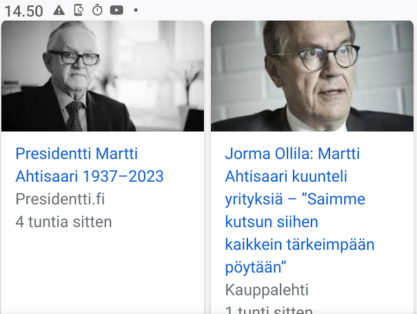 https://www.is.fi/paakirjoitus/art-2000009925817.html https://www.iltalehti.fi/jalkapallo/a/7aa22776-a5e2-428a-8137-a85ea246f8bd https://www.ess.fi/uutissuomalainen/6284364 https://www.presidentti.fi/uutinen/presidentti-martti-ahtisaari-1937-2023/ https://www.aamulehti.fi/ihmiset/art-2000009925789.html https://www.ksml.fi/paikalliset/6283462 Kuvat: Pertti Manninen. Maanantai 16.10.2023 |