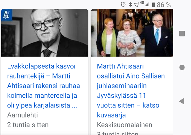 Sunnuntai 8.10.2023. Pääkirjoitus sunnuntaina 2008-10-12. Rauhanpalkintokaan ei rauhoittanut: Martti Ahtisaari haluaa yhä ydinaseita Suomeen. HBL Hufvudstadsbladet. Debatt. Nato. Aktualisera en kärnvapenfri zon igen. Stig Gustafsson. Curt Riberdahl. Tisdag 21 november 2006. (Käännös: Pertti Manninen). Ydinaseeton vyöhyke on tehtävä taas ajankohtaiseksi. Muut lehdet. Keskisuomalainen, ulkomaat perjantaina 29.11.2002. Washington, STT Bush nostaa Henry Kissingerin, 79, takaisin politiikan parrasvaloihin Ahtisaari ei kaipaa todisteita. "Tietäen, että noin miljoona ihmistä on tapettu Irakin hallinnon toimesta, minä en paljon niitä joukkotuhoaseita enää tarvitse." Helsingin Sanomat perjantaina 01.08.2003. Turkki. Ahtisaari asialla: Kurdit myytävänä. "Turkin EU-jäsenyyden edut painavampia kuin haasteet". Täysin kritiikitön ja epämääräistä toimikuntaa esittelemätön kirjoitus Helsingin Sanomissa maanantaina 06.09.2004. Nobelisti mielii yhä Natoon. Albaaaniperheelle Ahtisaari on rauhantekijä. Nobelisti mielii yhä Natoon Linkkejä ja kirjoituksia. 35 kpl http://www.nettisanomat.com/2008/10/12/etusivu.html#linkkeja |