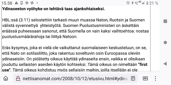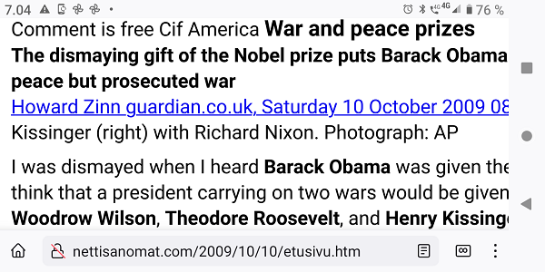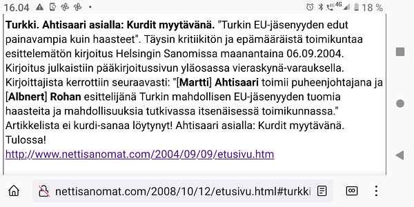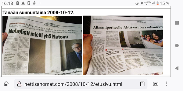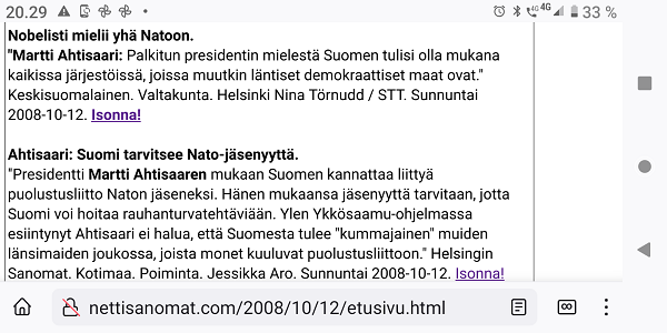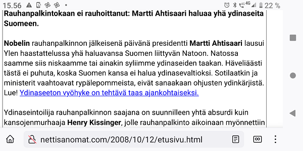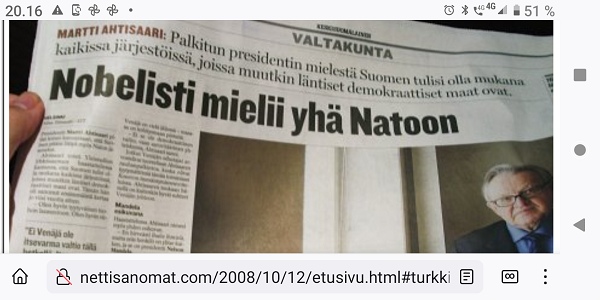 Sunnuntai 8.10.2023. Pääkirjoitus sunnuntaina 2008-10-12. Rauhanpalkintokaan ei rauhoittanut: Martti Ahtisaari haluaa yhä ydinaseita Suomeen. HBL Hufvudstadsbladet. Debatt. Nato. Aktualisera en kärnvapenfri zon igen. Stig Gustafsson. Curt Riberdahl. Tisdag 21 november 2006. (Käännös: Pertti Manninen). Ydinaseeton vyöhyke on tehtävä taas ajankohtaiseksi. Muut lehdet. Keskisuomalainen, ulkomaat perjantaina 29.11.2002. Washington, STT Bush nostaa Henry Kissingerin, 79, takaisin politiikan parrasvaloihin Ahtisaari ei kaipaa todisteita. "Tietäen, että noin miljoona ihmistä on tapettu Irakin hallinnon toimesta, minä en paljon niitä joukkotuhoaseita enää tarvitse." Helsingin Sanomat perjantaina 01.08.2003. Turkki. Ahtisaari asialla: Kurdit myytävänä. "Turkin EU-jäsenyyden edut painavampia kuin haasteet". Täysin kritiikitön ja epämääräistä toimikuntaa esittelemätön kirjoitus Helsingin Sanomissa maanantaina 06.09.2004. Nobelisti mielii yhä Natoon. Albaaaniperheelle Ahtisaari on rauhantekijä. Nobelisti mielii yhä Natoon Linkkejä ja kirjoituksia. 35 kpl http://www.nettisanomat.com/2008/10/12/etusivu.html#linkkeja |