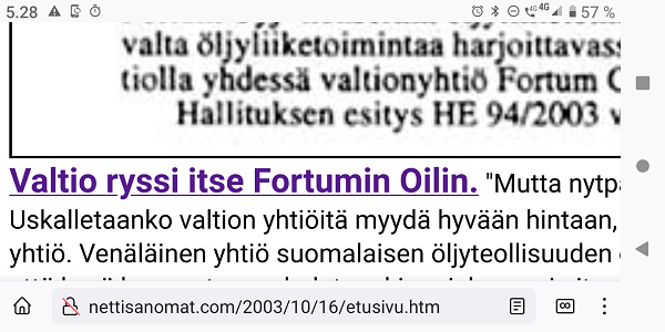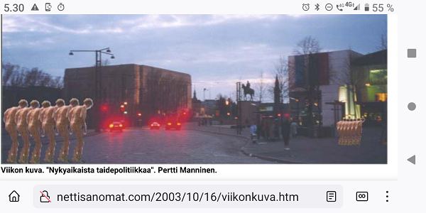 Torstai 19.10.2023. 16.10.2003. Pääkirjoitus. Ylen tv-uutiset valehteli ministerin puheenvuoron! 16.10.2003. Muut lehdet. Valtio ryssi itse Fortumin Oilin. Taloussanomat. Kolumni. Tapani Pitzen lauantaina 11. lokakuuta 2003. Viikon kuva. "Nykyaikaista taidepolitiikkaa". Pertti Manninen. |