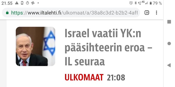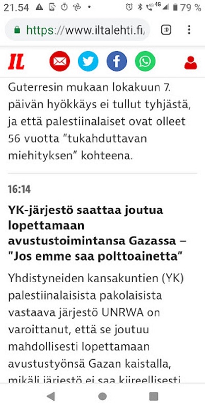 Sanomanetti - Tiistai 24.10.2023. Kuvia YK:n päivänä 2023. 08:33 Aurinko nousee muutaman hetken kuluttua. Uusimaa. Kirkkonummi. Kauhala. Tiistai 24.10.2023 08:33. Kuva Pertti Manninen. Kuvia YK:n päivänä 2023. Aamusta illansuuhun 08:33 - 15:59. Uusimaa. Kirkkonummi. Tiistai 24.10.2023. Kuvat Pertti Manninen. 18 kuvaa! Tiistai 24.10.2023. 19:51. Kaksi kuvaa Jopet-showsta vuodelta 2007. - Mutta miksi näitä ydinaseita ei poisteta kokonaan? - No on puhuttu niiden vaihtamisesta ritsoihin. Kaksi kuvaa Jopet-showsta vuodelta 2007. Kuvia YK:n päivänä 2023. Jope Ruonansuu, Mika Räinä ja Jukka Toivonen. Yle TV2 tiistaina 24.10.2023 19:51. Kuvat Pertti Manninen. Tiistai 24.10.2023. 21:55. YK:n päivänä 2023. Israel vaatii YK:n pääsihteerin eroa. Iltalehti. Guterresin mukaan lokakuun 7. päivän hyökkäys ei tullut tyhjästä, ja että palestiinalaiset ovat olleet 56 vuotta "tukahduttavan miehityksen" kohteena. YK-järjestö saattaa joutua lopettamaan avustustoimintansa Gazassa- "Jos emme saa polttoainetta" Iltalehti 24.10.2023 21:55. Kuvat Pertti Manninen. --- Maanantai 23.10.2023. Valtioneuvoston linnan sisäpihalla oleva 100-vuotias Painotalo halutaan purkaa ja rakentaa tilalle uutta. Ylen uutiset torstaina 19.10.2023 20:46. ... ovat saaneet rakennussuojelun asiantuntijat varpailleen. Lue! Kommentti. Lue! Pekka ja Pätkä salapoliiseina. Kuva Kimmo Kiljunen yhä vain vaatii muuttamaan taitettua indeksiä. Kuva --- Sunnuntai 22.10.2023. ETUSIVU4 - cnbc.com/2023/10/21/israel-hamas-war-updates FRI, OCT 20 2023 2:04 PM EDT --- 21 HOURS AGO --- 18 HOURS AGO --- 9 HOURS AGO --- 40 MIN AGO FRI, OCT 20 2023 2:04 PM EDT --- 21 HOURS AGO --- 18 HOURS AGO --- 9 HOURS AGO --- 40 MIN AGO --- Torstai 19.10.2023. Arvaa ketkä tai mitkä? SELVIÄVÄT? - METSÄT, RAAKA- AINEET, TALOUS Perjantaina 20.10.2023 klo 18-19 Jämsä, Kahvila-ravintola Akuliina Lauantaina 21.10.2023 klo 10.30-11.30 Konnevesi, Ravintola Mierontie Ravintola Sun Toive klo 14-15 Toivakka, Kahvitarjoilu. TERVETULOA! renew Vastaus täällä! - 20 vuotta sitten. 16.10.2003. Pääkirjoitus. Ylen tv-uutiset valehteli ministerin puheenvuoron! - 20 vuotta sitten. Muut lehdet. Valtio ryssi itse Fortumin Oilin. Taloussanomat. Kolumni. Tapani Pitzen. - 20 vuotta sitten. Viikon kuva. "Nykyaikaista taidepolitiikkaa". Pertti Manninen. --- Tiistai 17.10.2023. Asunnottomien yö 17.10. Arkistosta vuodelta 2005. - Maanantaina 17.10.2005 klo 08:50 Ylen radion aamulähetyksessä puhutaan asunnottomuudesta. Johdanto ja osa alkupuheenvuorosta puuttuu. Muitakin uutisia lopuksi. - Henkilöt esiintymisjärjestyksessä: Nainen: Kati, mies: Reijo, toimittaja: Kari Mäenpää, Ekokolon hoitaja: Markku Heino, Asunnottomien yö-kansalaisliikkeen organisaattori: Antti Honkonen, studiotoimittaja: Petri Kejonen ja kuuluttaja: Maaria Seppänen. Ääninauhalta purkanut Pertti Manninen, Nettisanomat, oikeinkuulemisvarauksin. Kuvat: Ruskea perhonen. Ruusut kukkivat, marjat punertavat ja lehdet vihertävät. --- Maanantai 16.10.2023. Tuuli käy heidän ylitseen. Martti Ahtisaari 1937- 2023. - Google-haku maanantaina 6.10.2023 14:47. Kuvat: Pertti Manninen. - Sunnuntaina 8.10.2023 täällä sivuilla etusivu - v20 - v24. 2008. Rauhanpalkinto 2008. Martti Ahtisaari. Nobelisti mielii yhä Natoon. Lue! 2008. Pääkirjoitus sunnuntaina 12.10.2008. Rauhanpalkintokaan ei rauhoittanut: Martti Ahtisaari haluaa yhä ydinaseita Suomeen. Lue! 2008. Ahtisaari: Suomi tarvitsee Nato-jäsenyyttä. Lue! 2008. Albaaaniperheelle Ahtisaari on rauhantekijä. Lue! 2003. Ahtisaari ei kaipaa todisteita. Lue! 2003. Ahtisaari vaatii puuttumista diktatuureihin. Lue! 25.09.2003. Pääkirjoitus. Uskaltaako Ahtisaari, USA:n juoksupoika mennä Bagdadiin? Lue! 2004. Turkki. Ahtisaari asialla: Kurdit myytävänä. Lue! 1999. Soitellen sotahan: tuho, jonka tahdoimme? Lue! --- Sunnuntai 15.10.2023. Kuvat MTV:n Kymmenen Uutisista 15.10.2023 22:01- 22:03. Gazassa ja Israelissa kuollut yhteensä jo 3750 ihmistä. Kuvat: Pertti Manninen. Sunnuntai 15.10.2023. JATKUU --- Tiistai 10.10.2023. Aleksis Kiven päivä 10.10. "Makeasti oravainen makaa sammalhuoneessansa." Kuva. - Kolme lippua liehuu Kirkkonummen uimahallilla kirjavan koulu taustanaan. Uusimaa. Kirkkonummi. Gesterbyntie. Tiistai 10.10.2023 13:36. Pertti Manninen. - Aleksis Kiven palkinto kirjailija Rosa Liksomille. --- Sunnuntai 8.10.2023. Rauhanpalkinto 2008. Martti Ahtisaari Lue! Rauhanpalkinto 2009. Barack Obama Lue! Rauhanpalkinto 2023. Narges Mohammadi Lue! --- Lauantai 7.10.2023. Rauhanpalkinto 2023. Nobelin rauhanpalkinto iranilaiselle naisten oikeuksien puolustajalle. Palkittu Narges Mohammadi on parhaillaan vangittuna Iranissa. Lehtien sivut perjantaina 6.10.2023 15:54- 16:07. --- Perjantai 6.10.2023. 20 vuotta sitten 25.9.2003. Moe haluatko miljönääriksi ohjelman juontajana. By Matti Reijonen Moe 20 vuotta sitten: 2.10.2023 - 3.10.2023 - 4.10.2023 - 5.10.2023 - 6.10.2023 - --- 20 vuotta sitten 2.10.2003. Pääkirjoitus. Puhetta. "Hyvät maanmiehet, tilanne on vakava. - Pääkirjoituksia. Linkit --- Sunnuntai 1.10.2023. Kurjet lentävät. Uusimaa. Kirkkonummi. Lapinkylä. Kuva Pertti Manninen. --- Lauantai 30.9.2023. Nettisanomat lauantai 2006-11-11. Aivoina Björn Wahlroos ja Ahti Hirvonen Lue! --- Veropakolainen Björn Wahlroos vuosien varrelta. Juoksupojasta pomoksi. --- Keskiviikkona 27.9.2023. Päivälleen 24 vuotta sitten: Katujuopottelu kuriin Helsingissä! Viina virtaa vain aidan sisäpuolella? Lue! - 24 vuotta sitten: torstaina elokuun 12. päivänä 1999 Köyhät opiskelijat, painukaa helvettiin! Ben Zyskowicz. Vertti Kiukas. Janne Virkkunen. ---Tiistaina 26.9.2023. Lähtöä odottaen. Joutsenet pellolla. Uusimaa. Kirkkonummi. Lapinkylä. Maanantai 25.9.2024 15:33. Kuva Pertti Manninen. - Kommentti: Orpo ja Purra yrittävät tökeröä taloustemppua, jolla Reagan ja Thatcherkin saivat aikaan mittavaa vahinkoa. Lue! Kommentti. Jan Hurri. --- Sunnuntaina 24.9.2023. Syksyn lehdet metsäojassa. Uusimaa. Kirkkonummi. Lapinkyl