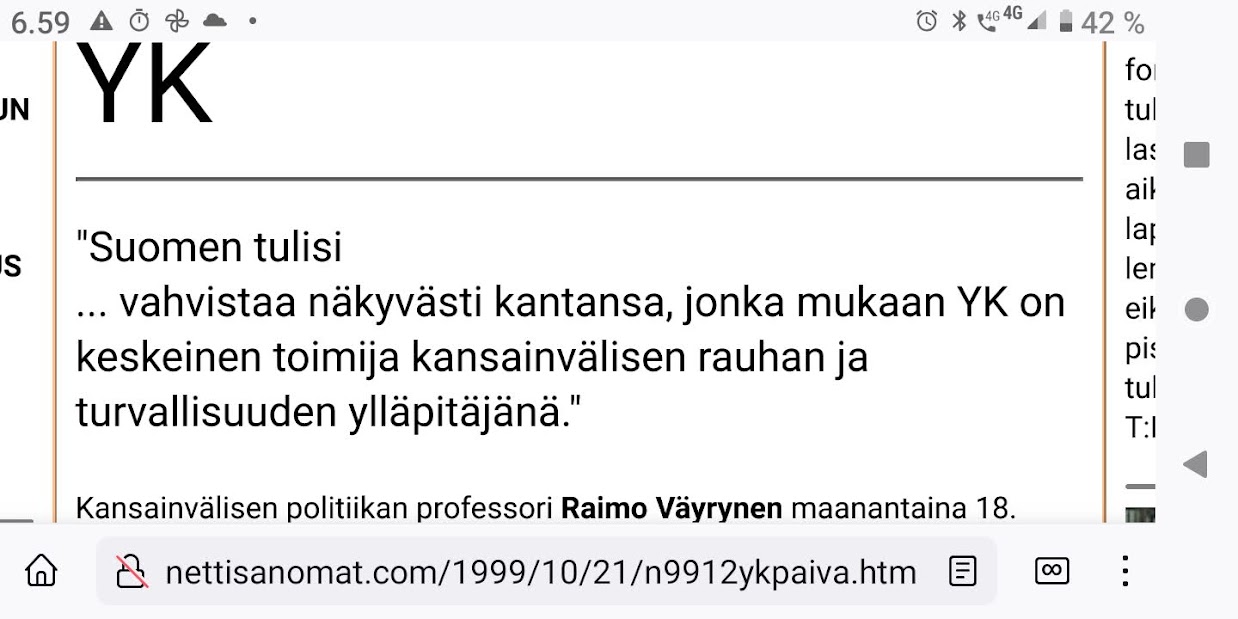 Sanomanetti - Tiistai 24.10.2023. - Arkisto 1999. NETTISANOMAT.COM YK:n päivänä 1999. - YK "Suomen tulisi ... vahvistaa näkyvästi kantansa, jonka mukaan YK on keskeinen toimija kansainvälisen rauhan ja turvallisuuden ylläpitäjänä." Kansainvälisen politiikan professori Raimo Väyrynen maanantaina 18. lokakuuta 1999 UKK-palkinnon jakotilaisuudessa. (nettisanomat.com torstaina 21. lokakuuuta 1999) - YK:n PÄIVÄ 24.10 - RAUHANPÄIVÄ Jyväskylä RAUHANKULKUE klo 13 Yliopiston päärakennuksen edestä. Ota mukaan julisteesi. Järj. Kansalaistoimikunta Jyväskylä - KESKUSTELUTILAISUUS Kouluviraston juhlasalissa (Asemak. 6, Jyväskylä) klo 14.00 NATO, FIN, EU, WEU, EMU, ETYJ, YK - MISTÄ LÖYTYVÄT RAUHAN TAKEET? Mukana: Kansanedustaja Mauri Pekkarinen Opetustoimenjohtaja Markku Suortamo, Majuri evp. Lars-Olof Fredriksson, Kaupunginvaltuutettu Tuulikki Väliniemi, Opiskelija Toni Puranen, Päätoimittaja Tapani Markkanen, Kirvesmies Valto Holopainen Musiikkia: Outi Kallonen ja Ykä Mattila Kahvitarjoilu. Järj. K-S Rauhanpuolustajat - TIEDOTUSVÄLINEILLE 16.10.1999 Vapaa julkaistavaksi heti MIELENOSOITUS KOKOSI YHTEEN LINNAKE-EUROOPAN VASTUSTAJIA Laaja joukko kansalaisaktiiveja osoitti tänään Tampereella mieltään solidaarisen Euroopan ja liikkumisvapauden puolesta Linnake-Eurooppaa vastaan. Mielenosoittajat arvostelevat Euroopan Unionin pakolais- ja siirtolaispolitiikkaa sekä kansalaisiin kohdistuvan yhteiskunnallisen kontrollin lisäämistä. Kansalaisryhmä vapaan ja solidaarisen Euroopan puolesta - Viikonloppuisin formuloita ei saisi tulla aamun lastenohjelmien aikaan koska lapset ei näe lempiohjelmiaan eikä niitä viititä pistää illalla tulemaan. T:Erika 9v. - Kuvat. Yhdeksän (9) kuvaa. - Kirjoita mielipiteesi suoraan lomakkeelle! Aiemmat jutut ja kuvat --- Kuvia YK:n päivänä 2023. 08:33 Aurinko nousee muutaman hetken kuluttua. Uusimaa. Kirkkonummi. Kauhala. Tiistai 24.10.2023 08:33. Kuva Pertti Manninen. Kuvia YK:n päivänä 2023. Aamusta illansuuhun 08:33 - 15:59. Uusimaa. Kirkkonummi. Tiistai 24.10.2023. Kuvat Pertti Manninen. 18 kuvaa! Tiistai 24.10.2023. 19:51. Kaksi kuvaa Jopet-showsta vuodelta 2007. - Mutta miksi näitä ydinaseita ei poisteta kokonaan? - No on puhuttu niiden vaihtamisesta ritsoihin. Kaksi kuvaa Jopet-showsta vuodelta 2007. Kuvia YK:n päivänä 2023. Jope Ruonansuu, Mika Räinä ja Jukka Toivonen. Yle TV2 tiistaina 24.10.2023 19:51. Kuvat Pertti Manninen. Tiistai 24.10.2023. 21:55. YK:n päivänä 2023. Israel vaatii YK:n pääsihteerin eroa. Iltalehti. Guterresin mukaan lokakuun 7. päivän hyökkäys ei tullut tyhjästä, ja että palestiinalaiset ovat olleet 56 vuotta "tukahduttavan miehityksen" kohteena. YK-järjestö saattaa joutua lopettamaan avustustoimintansa Gazassa. "Jos emme saa polttoainetta" Iltalehti 24.10.2023 21:55. Kuvat Pertti Manninen. --- Tiistai 17.10.2023. Asunnottomien yö 17.10. Arkistosta vuodelta 2005. --- Tiistai 10.10.2023. Aleksis Kiven päivä 10.10. "Makeasti oravainen makaa sammalhuoneessansa." Kuva. --- --- Lauantai 7.10.2023. Rauhanpalkinto 2023. Nobelin rauhanpalkinto iranilaiselle naisten oikeuksien puolustajalle. Palkittu Narges Mohammadi on parhaillaan vangittuna Iranissa. --- Perjantai 6.10.2023. 20 vuotta sitten 25.9.2003. Moe haluatko miljönääriksi ohjelman juontajana. By Matti Reijonen Moe 20 vuotta sitten: 2.10.2023 - 3.10.2023 - 4.10.2023 - 5.10.2023 - 6.10.2023 - --- Sunnuntai 1.10.2023. Kurjet lentävät. Kuva Pertti Manninen. --- Nettisanomat 20 vuotta sitten 28.8.2003. I have a dream.Keskiviikkona 16.8.2023. Arkisto 20 vuotta sitten 14.8.2003. - USA. Hullut vaalit. - Valtauksen merkki. Vaikea kuva 2003. 10.04.2003. Kaleva. - Ahtisaari ei kaipaa todisteita. 01.08.2003. --- Sunnuntaina 13.8.2023. Uusi sukupolvi hippasilla. Kuva. --- Arkisto 6.9.2001. Pääkirjoitus. --- SYYSKUU 2016. ORAVA TAMMESSA. - Vuosisadan kuva: Sirkka Hämäläinen, Sauli Niinistö, Johnny Åkerholm. - SMILE from MODERN TIMES - "Förbjud atomvapnen". 1957 KUVA - YK:n päivä 1999 - Tiistai 24.10.2023. - Kuvasanomat - Sanomatori - Viikkosanomat - Härkää sarvista - 12.fi -
