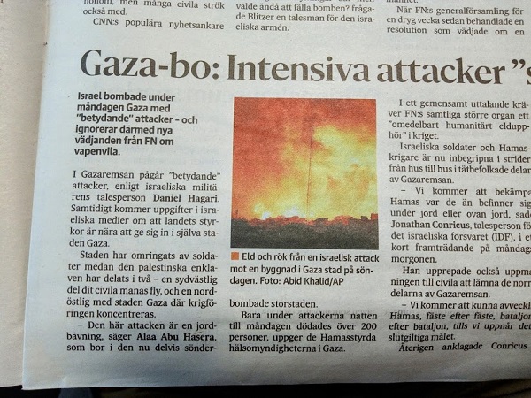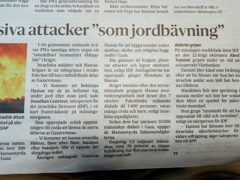 Käännös: Pertti Manninen. Från beundransvärt rättesnöre till makaber floskel Vi har nått den punkten. Omkring 10 000 palestinier har mist livet i bombardemangen. Omkring 6 000 av dem barn och kvinnor. BBC rapporterade nyligen om Khalil Khader, en 36-årig it-expert, som stod i rasmassorna i Rafah efter en färsk Israelisk bombräd. I sina händer höll han en dammig blå pyjamas. Det var allt han hade kvar av sina barn. Alla fyra dog i bombanfallet. Nio- åriga Ibrahim, femåringen Amal, Kinan som fyllt två, och Rosa den yngsta. Den blåa pyjamasen var hennes. När Israel bombade flyktinglägret Jabalia på Gazaremsan förra veckan var de ute efter en Hamasledare. Enligt Israel lyckades de döda honom, men många civila strök också med. CNN:s populära nyhetsankare Wolf Blitzer, vars föräldrar överlev de förintelsen, hade svårt att dölja sin vrede. - Ni visste att det fanns civilbefolkning och flyktingar där men valde ändå att fälla bomben? frågade Blitzer en talesman för den israeliska armén. Det är krigets tragedi, Wolf, besvarade talesmannen med en ärlighet man ännu inte sett från USA, Finland eller västvärlden i allmänhet. När FN:s generalförsamling för en dryg vecka sedan behandlade en resolution som vädjade om en humanitär vapenvila, röstade USA emot och Finland blankt. - Den här resolutionen nämnde inte ens Hamas och därför valde vi att inte rösta, sade statsminister Petteri Orpo. Både utrikesminister Elina Valtonen och Orpo har betonat Israels rätt till självförsvar, men i samma veva tillagt att den palestinska civilbefolkningen måste beskyddas. Upprepningen av detta mantra på bägge sidor om Atlanten har förvandlat det beundransvärda rättesnöret till en makaber floskel. Efter 10 000 dödsoffer går det inte längre med hedern i behåll att tala om att beskydda civilbefolk ningen. I sin legitima jakt på Hamas antingen kan eller vill Israel inte undvika civila dödsoffer. The Washington Post skrev på söndagen att den israeliska armén, i sina interna regler för användningen av våld, valt att acceptera en högre nivå av civila dödsoffer än i tidigare krig med Hamas. - Ju större den militära nyttan är, desto fler civila offer kan anses proportionerligt, säger den israeliska arméns juridiska rådgivare Pnina Sharvit Baruch till The Washington Post. Så länge som USA, väst och Finland bland dem, inte ställer krav på Israel, eller försöker sätta tyglar på deras krig i Gaza, verkar det som om man tänker lika - att utplånandet av Hamas är ett så viktigt mål att det är värt många oskyldiga palestiniers liv. Jag hoppas någon skulle våga säga exakt hur många. Juri von Bonsdorff är HBL:s medarbetare i Washington DC Bild från Israels militär som uppges visa markoperationer i Gazaremsan under söndagen. FOTO: IDF/TT-AP