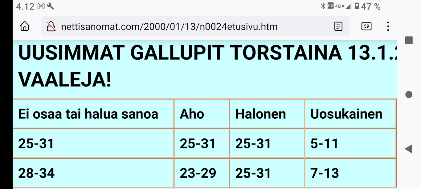 UUSI GALLUP: "Halla-aho noussut Stubbin ja Haaviston kannoille." (HS 22.1.2024 16:31). "Halla-ahon kannatus kovassa nousussa." (HS 22.1.2024 18:15, muutettu otsikko.) |