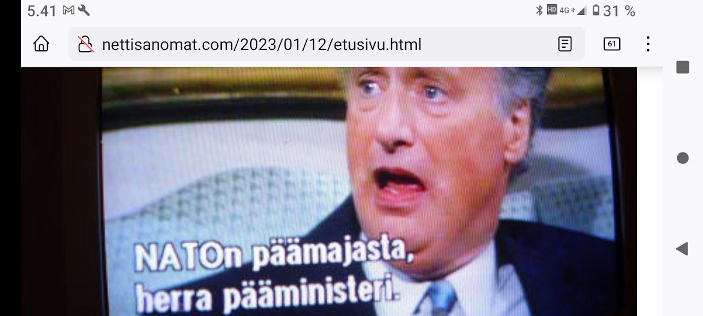 SANOMANETTI - N:o 2865 - Sunnuntaina 4.2.2024 - Presidenttiehdokkaiden rakkaustarinat. (Ilta-Sanomat) - Näin Putin voi testata uutta presidenttiä. (Iltalehti). Sunnuntai 4.2.2024 15:20. Uusimaa. Kirkkonummi. Lapinkylän kyläkauppa. Kuva Pertti Manninen. Kulkijan kuvia sunnuntaina 4.2.2024. Aurinkokin pilkistää hiukan. Fasaani on tepastellut ihmettelemään kissan ulkoaluetta. 12:08. Ihmettely jatkuu 12:09. Närhi tammen oksalla 12:49. Yksinäinen kulkija lumisella pellolla auringon ja varjon rajamailla 14:39. Yksinäinen pyöräilija pysyy välillä pystyssä aika jäisellä tiellä 14:47. Lehtien lööpit ajankohtaisilla rakkaus- ja asialinjoilla 15.20. Kirkkaus pimentää kylänraitin 15:43. Kuvat sunnuntaina 4.2.2024- Uusimaa. Kirkkonummi. Björkdal - Rajontie - Lapinkylä. Kuvat Pertti Manninen. Lauantaina 3.2.2024. --- Ydinaseet. Niinistö ja Stubb: Kyllä, Haavisto: Ei - Kuva. Ydinasekieltosopimuksen puolesta kampanjoitiin New Yorkissa. KU 16.12.2023. Tuula Kärki - Suomen suhtautuminen ydinaseisiin muuttui: ”Nyt piiloudutaan Naton selän taakse” ”Missä olosuhteissa Suomen ulkopoliittisen johdon mielestä ydinaseita voisi käyttää?” Kati Juva on pettynyt Suomen toimintaan ydinasekiellon suhteen. Juva on suomalainen lääkäri, joka oli kansalaisjärjestön edustajana seuraamassa runsas viikko sitten päättynyttä Yhdistyneitten kansakuntien eli YK:n ydinasekieltosopimuksen sopijaosapuolten kokousta New Yorkissa. Tämä oli toinen kokous ja Suomi ei osallistunut siihen lainkaan, vaikka oli ensimmäisessä kokouksessa tarkkailijana. Tätä Juva pitää valitettavana. Juva arvioi, että Suomi on muuttanut suhtautumistaan ydinaseisiin ja aseistariisuntaan viime vuosina. ”On epädemokraattista, että muutama henkilö voi vastata koko ihmiskunnan henkiinjäämisestä.” – Kanta on muuttunut aiempaa kielteisemmäksi ydinasekiellolle. Nyt piiloudutaan Naton selän taakse ja Naton ydinasesateenvarjon alle, hän sanoo. KU 16.12.2023. - Året var 1957. Dokumentär av Jonas Fohlin, Olle Häger och Kjell Tunegård. SVT2. Kuvia sunnuntaina 2007-01-07. Klo 21.15- 21.35. Kuvat. Pertti Manninen - "Förbjud atomvapnen", Uimarannalla ja Professori elokuvasta Mansikkapaikka .Igmar Bergman 1957. Ohjelmassa näytettiin myös Laika-koira, ensimmäinen elävä olento avaruudessa. Vuosi oli 1957. --- Perjantaina 2.2.2024. Arkisto. Viisitoista vuotta sitten maanantaina 02.02.2009. - Pääkirjoitus-blogi. - Kuvia Suomessa. Tänään. Kuvat. - Maanantai 2009-02-02,. Pääkirjoitus-blogi. Suomi – Oikeusvaltio? ---Torstaina 2.1.2024 - Niinistökin joutui vielä viime hetkillä myrskyn silmään, tahtoen tai tahtomattaan? IL torstaina 1.2.2024 13:04. - Pääkirjoitus. Niinistön perintö. - Vihdoinkin kaksintaistelu? - 2006:n tapahtumia. --- Keskiviikkona 31.1.2024 - Lopullista ratkaisua kohti. Alun kolme päivää. Kuvat. - Pikkupeurat. Uusimaa. Kirkkonummi. Björkdal. Sunnuntaina 28.1.2024 15:00 ja 15:31. Kuvat Pertti Manninen. --- Viimeinen tv-tentti lopusta. Yle 25.1.2024. --- Torstai 25.1.2024 - Viimeinen gallup. Yle 25.1.2024. --- Uusi virkavastuulla tehty gallup. Åbo Akademi 23.1.2024. --- Tiistai 23.1.2024 - Kuva. Jutta ja Aaltola riekaleina. Paikka: Uusimaa. Kirkkonummi. Keskusta. Asematie. Aika: Tiistai 23.1.2024 12:03. Kuva Pertti Manninen. Tiistaina 23.1.2024. - --- Tasavallan presidentti Sauli Niinistö: "Ei tänne kukaan ollut drooneja lähettämässä. En näe,että Suomi tulisi osalliseksi." "Sauli Niinistön presidenttikausi on päättymässä." Yle sunnuntaina 21.1.2024 16:56. " --- Lauantai 20.1.2024 - www.theguardian.com World news Friday 19 January 2024 07:54 --- Torstaina 18.1.2024. - STOP RUSSIAN AGGRESSOR - HANDS OFF UKRAINE - SLAVA UKRAINI - Слава Україні Kulkijan kuvia. - YHDISTÄVÄ TEKIJÄ FÖRENANDE KRAFT Alexander Stubb 11:20 ja 14:14 --- Tiistai 16.1.2024 - Uni ja sen tulkinta 16.1.2024. Kirkkautta. Uusimaa. Kirkkonummi. Kirjasto Fyyri. Tiistai 16.1.2024 12:45. Pertti Manninen. --- Tiistai 16.1.2024. --- Sunnuntai 14.1.2024 - Kuvat. 13.1. Kuusi vuotta sitten "päätöntä menoa". --- Perjantai 12.1.2024. Kuva. - Kiekkofaneja 2013. Video Hjallis haista vittu!! - "Emme hyväksy tilannetta" - JYPin kannattajayhdistys. Keskisuomalainen perjantaina 5.1.2024. --- Torstaina 11.1.2024 - Kuva. Jänönenkin on loikkinut. --- Sunnuntai 7.1.2024 Loppiaismatkalla 2000-2024. Kuvat ja linkit. --- Lauantai 6.1.2024, Loppiainen. - ---- Keskiviikko 3.1.2024 - - Lintuja pitkin päivää. Kuvat - Auld Lang Syne. Kuvat - HAPPY NEW YEAR - ONNELLISTA UUTTA VUOTTA --- Perjantai 29.12.2023 - Raketti, suihku vai tussahdus? --- Torstaina 28.12.2023 --- Sunnuntaina 24.12.2023 - Matti Nykäsen muistomerkki lumesssa. - ---Tiistai 19.12.2023. - Pyryn jälkeen. Vihdoinkin lunta, reilusti. --- Maanantaina 18.12.2023 - Saarisesta 27.3.2008 --- Lauantaina 16.12. 2023 - Niinistöstä 1.11.2023. Atomi-pommista 1.11.2023. - Urpilaisesta 17.5.2013. Toukokuu 2013. - Haavistosta 26.1.2012. - Stubbista 23.11.2014. --- Keskiviikko 13.12.2023 - Minne tuuli kuljettaa? Yle keskiviikkona 13.12.2023. - Mutustelu . Suunta edelliseen Ylen gallupista tänään. --- Sunnuntai 10.12.2023. --- SYYSKUU 2016. ORAVA TAMMESSA. - Vuosisadan kuva: Sirkka Hämäläinen, Sauli Niinistö, Johnny Åkerholm. - SMILE from MODERN TIMES - "Förbjud atomvapnen". 1957 KUVA - etusivu - Sunnuntai 4.2.2024 - Kuvasanomat - Sanomatori - Viikkosanomat - Härkää sarvista - SANOMANETTI - N:o 2865. Vastaava päätoimittaja Pertti Manninen. Yhteys: nettisanomat @hotmail.com