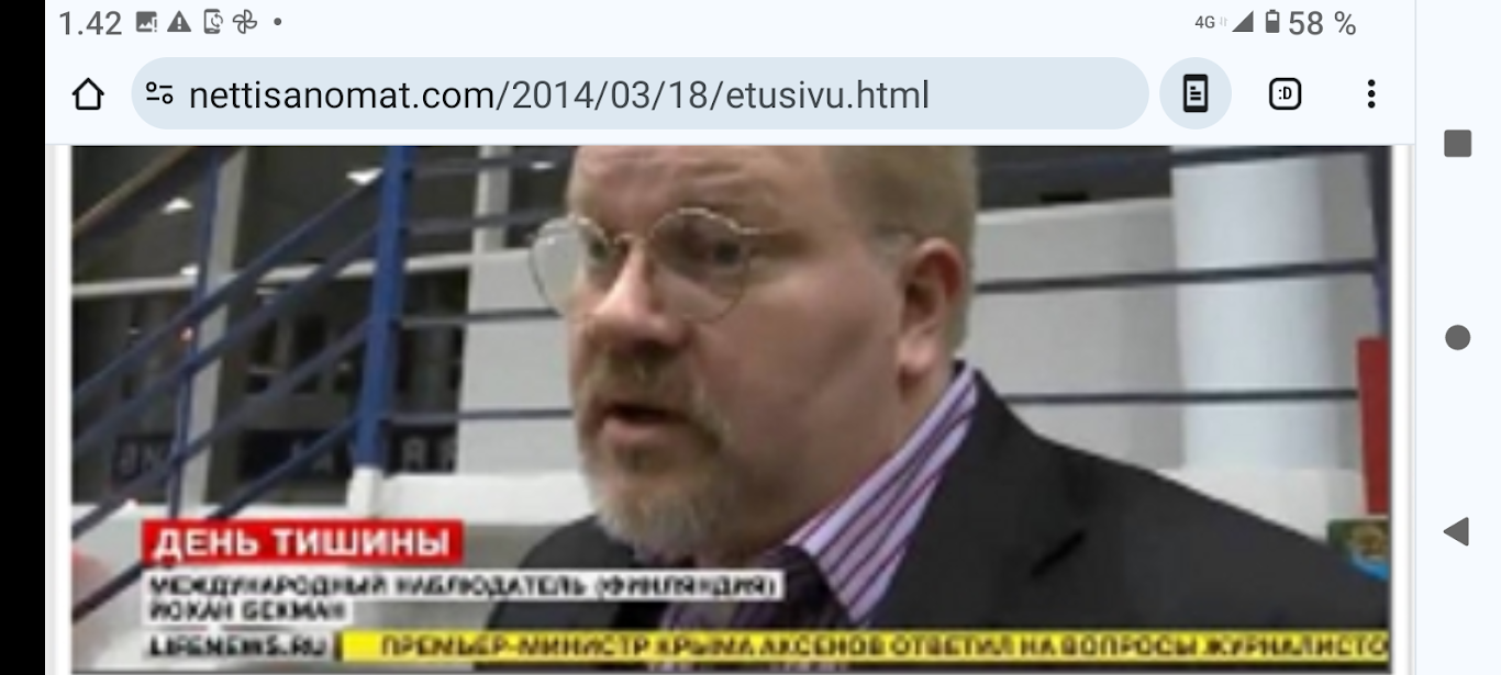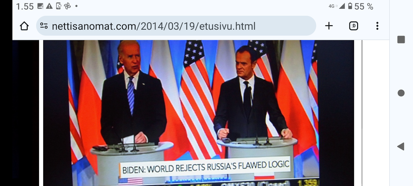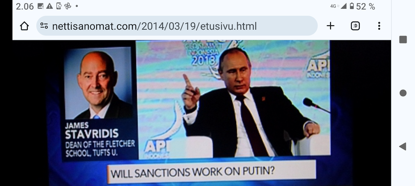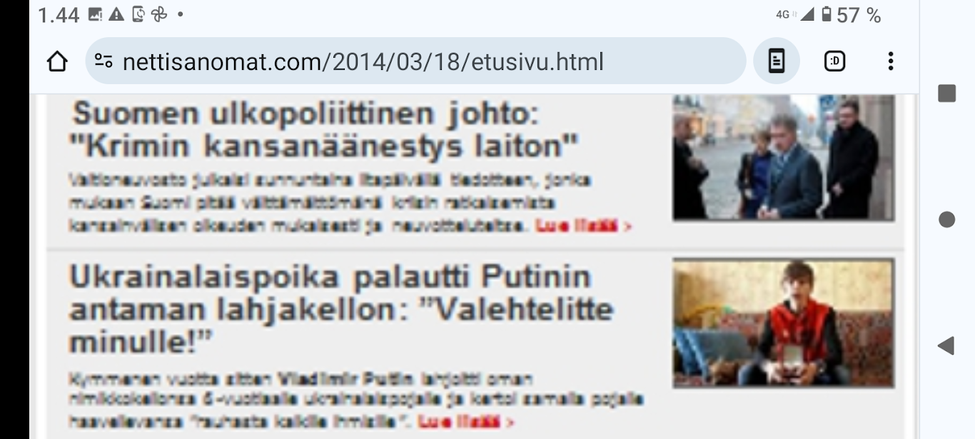 Krim maaliskuussa 2014. "Haag. Suomen ja Kiinan presidenttien mukaan on pidettävä huoli siitä, ettei Ukrainan kriisi horjuta Euroopan vakautta. Presidentit Sauli Niinistö ja Xi Jinping keskustelivat Ukrainan tilanteesta kahdenkeskisessä tapaamisessa Hollannissa sunnuntai-iltana, laajan ydinturvahuippukokouksen aattona." Tiesit sä, että sillä oli vaimo? - Noin nuori, ihan kauheeta. http://www.nettisanomat.com/2014/03/25/etusivu.html Krim maaliskuussa 2014. |