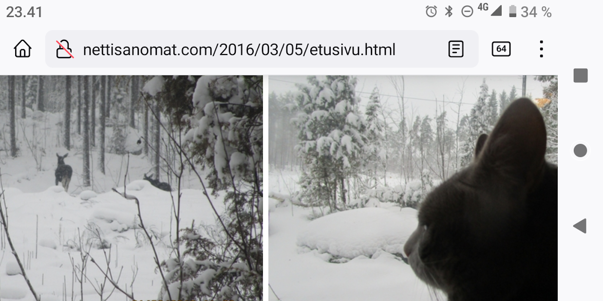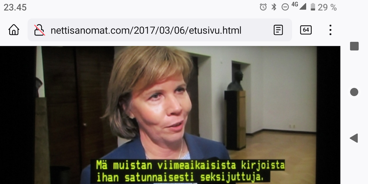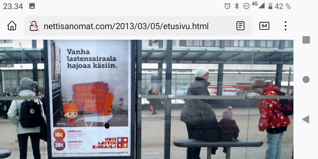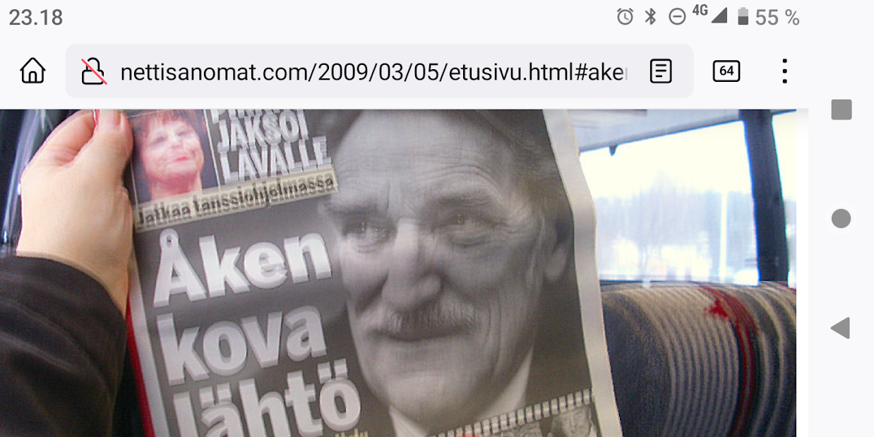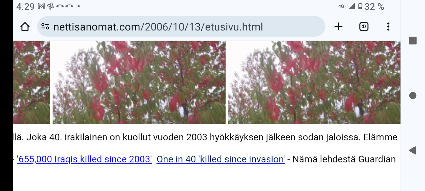 SANOMANETTI - N:o 2887 - 20 vuotta sitten 11.3.2004. - Arkisto Madrid 11. maaliskuuta 2004. Hirveitä pommiräjähdyksiä työmatkajunissa. Lähes 200 kuollutta tuhoisassa terrori-iskussa tänään torstaina 11. maaliskuuta 2004. Kuva: "Tuuli käy heidän ylitseen." --- Sunnuntai 10.09.2024 - Arkisto 1999. NYKYAIKA CHARLES CHAPLIN 1936 Nykyaika nyt! Tule tekemään yhteisen tajun kokemusta! Versio 1.0 on nyt valmis. NYKYAIKA CHARLES CHAPLIN 1936 perjantaina 26.11.99 tiistaina 30.11.99. --- Lauantai 09.03.2024 - Työtä! Pääkirjoitus. - Kuva. Kahdessa kerroksessa. Linnutkin kahdessa kerroksessa. Ne, jotka pystyvät syömään suoraan ja ne, jotka joutuvat odottamaan ylempää pudonneita murusia, kyllähän täytettäessä heillekin tulee siroteltua, suoraan. Uusimaa. Kirkkonummi. Björkdal. Perjantai 08.03.2024 11:06. Kuva Pertti Manninen. --- Perjantai 08.03.2024 - Kansainvälinen naistenpäivä, perjantai, 8. maaliskuuta. Kansainvälisen naistenpäivän pyöräilyä kirkkaan kirpeänä pakkaspäivänä Suomessa. 08.03.2006 maaliskuun keskiviikkona klo 15.13. Kuva Pertti Manninen, Jyväskylä. /2006/03/08/etusivu.htm. - Naisten palkkaa, veroalea ja Lipposen Stasi-kantaa sekä Ruotsin hallituksen toimintaa Irak-asiassa! Tulossa! Kuvat Pertti Manninen. ... Kuva 08.03.2006. "Naisen palkka 1". Iltalehti. Kolumni. Kalle Isokallio. Maanantaina 06.03.2006. Myyttejä ja mainoslauseita. Kuva 08.03.2006. " Naisen palkka 2". Aamulehti. Kotimaa. Keskiviikkona 08.03.2006. Kun mies ansaitsee euron, nainen saa 96-97 senttiä. Kuva 08.03.2006. "Naisen palkka 3". Aamulehti. 3. pääkirjoitus. Keskiviikkona 08.03.2006. Jatkuvaa palkkahurskastelua. Aamulehden vastaava päätoimittaja on Matti Apunen. - Elokuvalipulla kohtuuton hinta. --- Torstai 07.03.2024 - Päivän pienimmät. Metsämyyrät puikkelehtivat tammen ympärillä aurinkoisessa iltapäivässä. Uusimaa. Kirkkonummi. Björkdal. Torstai 7.3.2024 16:30. Kuva Pertti Manninen. - Valitut viikot. 2000-2024. Maaliskuun alku. 2000. Nihkeä Niinistö. Kuvasarja --- Tiistai 05.03.2024 Päivän pupu - Vielä vaalea pupu syömässä auringonkukan siemeniä illan hämärässä. Uusimaa. Kirkkonummi. Björkdal. Tiistai 5.3.2024 17:55. Kuva Pertti Manninen. --- Sunnuntai 03.03.2024 - "Sinä lähdit pois ... Minä katselin parvekkeelta, Loittonevaa selkääsi, Kiersit vesilammikot, Ja arvaan ettet murehdi tätä eroa, eroa, eroa." - Kansa hurrasi presidenttiparille "Kiitos Sauli Kiitos Jenni" - Iltalehden lööppi Lapinkylän kyläkaupan ovella sunnuntaina 3.3.2024 15:51. Pertti Manninen. --- Perjantai 01.03.2024 - Tässä ajassa ja ympäristössä 1. maaliskuuta 2024. Vaihto. - Yle teksti-tv 01.03. 11:53:23 Stubb aloittaa presidenttikautensa - Gazan verilöyly halutaan tutkia - Navalnyi haudataan Moskovassa - Tulivuoriturman uhreille korvauksia - Kriznar voittoon, Rautionaho viides - Sähkön hinta 12:02:27 Yle teksti-tv 01.03. 12:08:51 Kotimaa Perjantai - Stubb aloittaa presidenttikautensa - Koirat pidettävä kytkettyinä - STM: Syyhyhoitoon etsitään keinoja - Nylon Beat tekee paluun kesällä - Talvi oli tavanomaista kylmempi - Torstain uutisia: "Lakkolait" etenevät eduskuntaan - Turkistarhoille miljoonakorvaukset - Suomessa paikallisia syyhyryppäitä - Koirat pidettävä kytkettyinä - STM: Syyhyn hoitoon etsitään keinoja - Nylon Beat tekee paluun kesällä - Talvi oli tavanomaista kylmempi - "Lakkolait" etenevät eduskuntaan - Turkistarhoille miljoonakorvaukset - Suomessa paikallisia syyhyryppäitä - Sähköpotkulaudoille liikennevakuutus - Yle teksti-tv 01.03. 12:12:18 Navalnyi haudataan Moskovassa - uusittu 12.05 - Iranissa tänään parlamenttivaalit - Tulivuoren turman uhreille korvauksia - Gazan verilöyly halutaan tutkia - Biden ja Trump Texasissa - USA vältti hallinnon sulun - Torstain uutisia - Ruotsissa pysäytettiin reaktori - Navalnyin ruumiille ei kuljetusta - YK:n turvallisuusneuvosto koolle - Norjan kuningas kuljetetaan kotiin - Navalnyi haudataan Moskovassa - Iranissa tänään parlamenttivaalit - Tulivuoriturman uhreille korvauksia - Gazan verilöylystä halutaan tutkinta - Biden ja Trump Texasissa - USA vältti hallinnon sulun - Ruotsissa pysäytettiin reaktori - Navalnyin ruumiille ei kuljetusta - YK:n turvallisuusneuvosto koolle - Norjan kuningas Harald kotiin pian - Yle teksti-tv 01.03. 12:14:51 - Inflaatio EU-säännöin 1,2 % - Olkiluoto 3 vuosihuoltoon huomenna - Bitcoin nousee hyvästä syystä - Korot ja valuuttakurssit - Maailman pörssien kursseja - Pörssisähkön hinta Olkiluoto 3 ensimmäiseen vuosihuoltoon - EU-säännöin laskettu inflaatio 1,2 % - Bitcoin nousee, ja siihen on syy - Yle teksti-tv 01.03. 12:17:51 To 29.2. EKP:n kursseja - Finland has not set limits on use of weapons sent to Ukraine - Employment Fund to shrink staff due to adult-education budget cuts - Israeli embassy in Helsinki splattered with red liquid - Tässä ajassa ja ympäristössä 1. maaliskuuta 2024. Vaihto JA DOT - Yle.fi Kuvat perjantaina 1.3.2024 11:53- 12:22 ja viimeinen 12:42. Ruudulta Pertti Manninen. --- Keskiviikko 28.02.2024 --- Maanantai 26.02.2024 - - Arkisto. 2006. Verenpunainen syksy Suomessa ja maailmalla. Toimittaja tapetaan Venäjällä. Joka 40. irakilainen on kuollut vuoden 2003 hyökkäyksen jälkeen sodan jaloissa. Elämme veristä aikaa. Linkkejä: Leader: In praise of Politkovskaya Obituary: Anna Politkovskaya - '655,000 Iraqis killed since 2003' One in 40 'killed since invasion' --- Keskiviikko 21.02.2024 - The Guardian Wed 21 Feb 2024 Barely 10% of Europeans believe Ukraine can still defeat Russia, finds poll. https://www.theguardian.com/world/