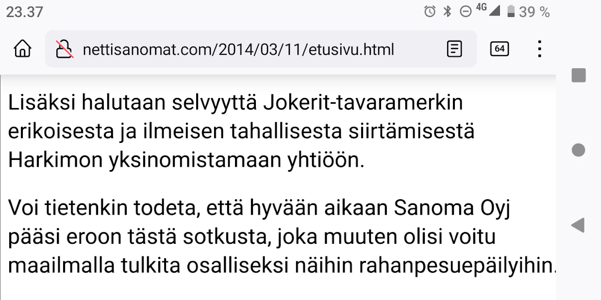 12.fi http://www.12.fi 1999- 12tori.fi http://www.12tori.fi 2008- apumiehet.fi http://www.apumiehet.fi 2015- biden.fi http://www.biden.fi 2017- eduskuntatalo.fi http://www.eduskuntatalo.fi 2009- elama.fi http://www.elama.fi 2015- ennustamo.fi http://www.ennustamo.fi 2017- erika.fi http://www.erika.fi 2009- faktaamo.fi http://www.faktaamo.fi 2017- fotomo.fi http://www.fotomo.fi 2017- fy.fi http://www.fy.fi 2009- gagarin.fi http://www.gagarin.fi 2009- helkinginsanomat.com http://www.helkinginsanomat.com 2009- helsinginsanoma.fi http://www.helsinginsanoma.fi 2017- helsinki-areena.fi http://www.helsinki-areena.fi 2013- helsinki-lehti.fi http://www.helsinki-lehti.fi 2018- helsinkilehti.fi http://www.helsinkilehti.fi 2018- helsinkisanomat.info http://www.helsinkisanomat.info 1999- hs24.mobi http://www.hs24.mobi 2012- hs27.com http://www.hs27.com 2009- iltaset.fi http://www.iltaset.fi 2014- infoinfo.fi http://www.infoinfo.fi 2009- infomo.fi http://www.infomo.fi 2017- iske.fi http://www.iske.fi 1999- kansalaisneuvosto.fi http://www.kansalaisneuvosto.fi tulossa kansalaistori.fi http://www.kansalaistori.fi 2014- keskiviikko.fi http://www.keskiviikko.fi 2009- kirkuva.fi http://www.kirkuva.fi 2013- knummi.fi http://www.knummi.fi varattu kuvala.fi http://www.kuvala.fi 2012- kuvasanomat.fi http://www.kuvasanomat.fi 2010- kuvaviikko.fi http://www.kuvaviikko.fi 1999- let.fi http://www.let.fi 2009- maanantai.fi http://www.maanantai.fi 2009- muistamo.fi http://www.muistamo.fi blogi mummi.fi http://www.mummi.fi 2014- n1.fi http://www.n1.fi 2012- nettilehti.com http://www.nettilehti.com 2009- nettimobi.com http://www.nettimobi.com 2009- nettinen.fi http://www.nettinen.fi 2004- nettisanomat.com http://www.nettisanomat.com 1999- nettisanomat.fi http://www.nettisanomat.fi rinnakkais pappa.fi http://www.pappa.fi 2013- per.fi http://www.per.fi 2015- raw.fi http://www.raw.fi 2012- sanaamo.fi http://www.sanaamo.fi 2017- sanala.fi http://www.sanala.fi 2012- sanat.fi http://www.sanat.fi 2009- sanomaatti.fi http://www.sanomaatti.fi 2015- sanomadigi.fi http://www.sanomadigi.fi 2015- sanomahouse.fi http://www.sanomahouse.fi 2015- sanomakonserni.fi http://www.sanomakonserni.fi 2017- sanomamags.com http://www.sanomamags.com rinnakkais sanomamarkkinat.fi http://www.sanomamarkkinat.fi 2015- sanomamobi.fi http://www.sanomamobi.fi 2011- sanomanet.fi http://www.sanomanet.fi 2014- sanomanetti.fi http://www.sanomanetti.fi 1999- sanomapark.fi http://www.sanomapark.fi 2009- sanomasampo.fi http://www.sanomasampo.fi 2014- sanomatori.com http://www.sanomatori.com rinnakkais sanomatori.fi http://www.sanomatori.fi 2009- sanomaviikko.fi http://www.sanomaviikko.fi 2009- sanomo.fi http://www.sanomo.fi 2014- sanonet.fi http://www.sanonet.fi 2014- sanoraama.fi http://www.sanoraama.fi 1999- shit.fi http://www.shit.fi 2012- siivo.fi http://www.siivo.fi 2017- suomisanomat.fi http://www.suomisanomat.fi 2014- tiistai.fi http://www.tiistai.fi 2009- venus.fi http://www.venus.fi 2009- viikko.fi http://www.viikko.fi 2009- viikkosanomat.fi http://www.viikkosanomat.fi blogi vuosi.fi http://www.vuosi.fi 1999- vuosisanomat.fi http://www.vuosisanomat.fi 1999- week.fi http://www.week.fi 2015- wincapita.fi http://www.wincapita.fi 2009- 04.05.2023