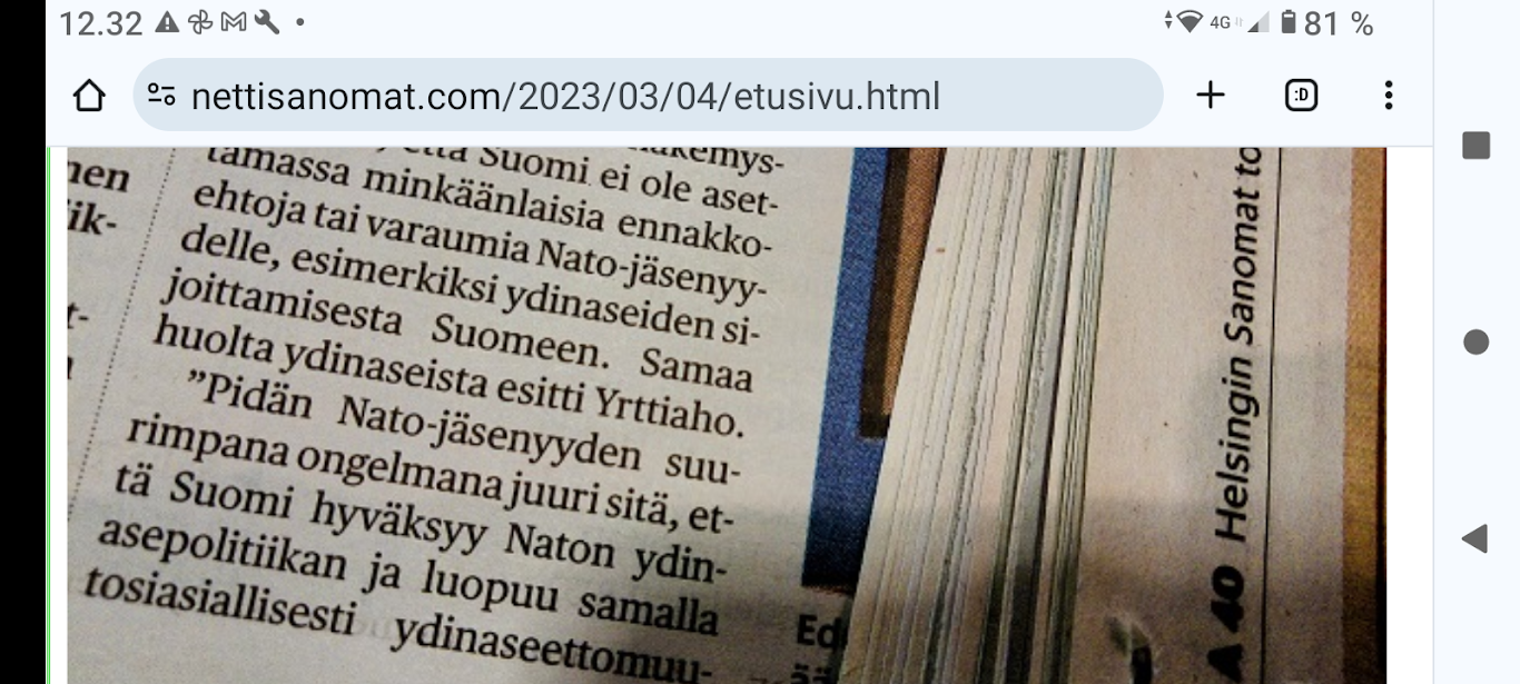 Pääkirjoitus: Ukrainan verinen tie Natoon. Venäjän julma ja verinen hyökkäys naapurimaahansa Ukrainaan jatkuu ja jatkuu. Nyt on menossa jo 168. päivä. Media käyttää tästä sodasta nimitystä "Ukrainan sota". Pikemminkin pitäisi käyttää nimitystä "Venäjän sota". Mitään rauhanneuvotteluja ei vielä käydä. Nato-maat ja Natoon