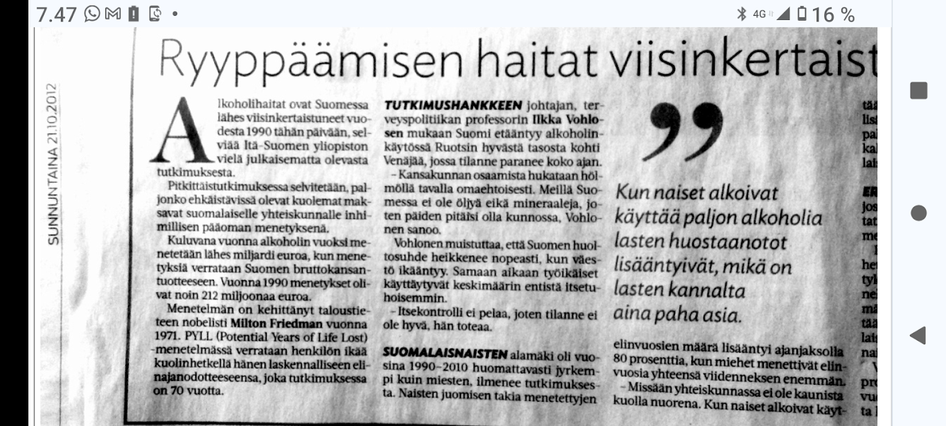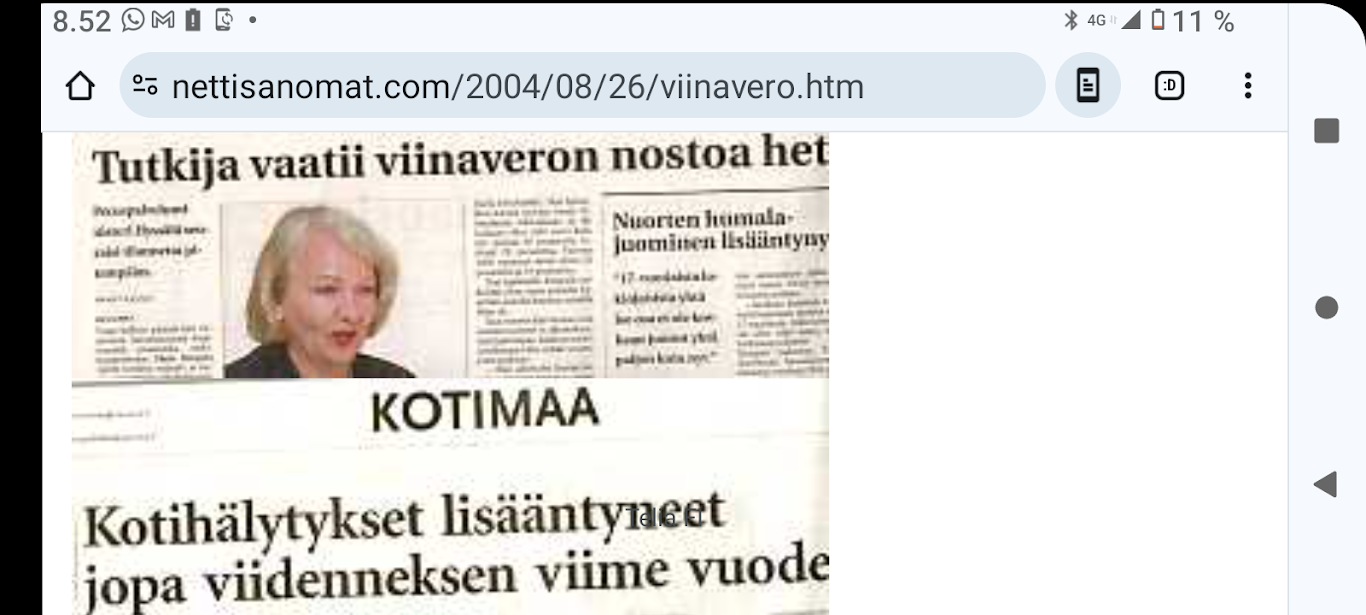 28.3.2024. 3. tuhti 2004. "Meillä on nyt maa, jossa hallitus on edistänyt ja erittäin lämpimästi kannustanut alkoholin nauttimista." - "Meillä on vastuuton alkoholi- 2004. Tutkija vaatii viinaveron nostoa heti. - Kotihälytykset lisääntyneet jopa viidenneksen viimevuodesta