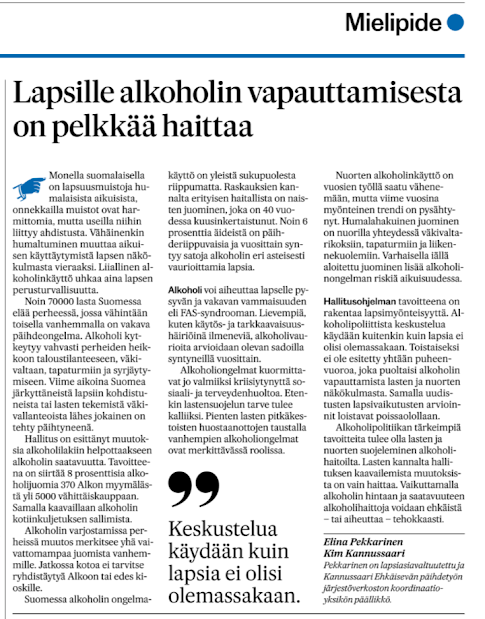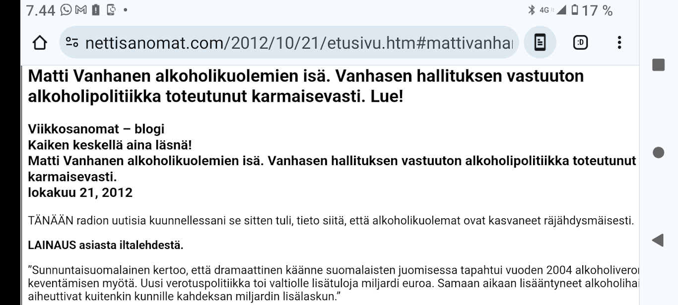 SANOMANETTI - N:o 2900 - 3.4.2024 - Kuvia huhtikuussa. 1.4.2024. Kyyhkynen nokkii jyviä. Uusimaa. Kirkkonummi. Björkdal. - 1.4.2024. "Rauhan ja veljeyden merkkinä." IRR-TV:n pääsiäiskonsertti. - 2.4.2024 Tiistaina. "Tuuli käy heidän ylitseen." Vantaan koulusurman uhrin muistolle. Kuva. Sarja "Tuuli käy heidän ylitseen. Kuvat Pertti Manninen. - 2.4.2024 Tiistaina. Potkulaudat tulevat tännekin. Uusimaa. Kirkkonummi. Keskusta. - Tiistaina. Maailman menoa ja tuloa. Otsikoita. Uusimaa. Kirkkonummi. CM. - 2.4.2024 Tiistaina. Vandaalien jäljiltä. Bussikatoksen molempien päätyjen ikkunalasit on hajotettu, tässä eteläinen. Uusimaa. Kirkkonummi. Jokiniemi. Uimahallin ja koulujen pysäkki. - 3.4.2024 Keskiviikkona. Lumestakin löytää syötävää. Lumimyrskyn jälkeen syöttöpaikalla on vilskettä aamusta iltaan. Uusimaa. Kirkkonummi. Björkdal. Keskiviikko 3.4.2024 08:34 ja 14:28 sekä 17:43 jolloin kyyhkynenkin hetken paikalla viihtyi. Pertti Manninen --- 28.3.2024 Kiirastorstai - Tuhteja lukupaketteja Kiirastorstaina Ilta-Sanomat ja Iltalehti. Uusimaa. Kirkkonummi. Tokmanni torstaina 28.3.2024 11:31. Kuva. Pertti Manninen. 3. tuhti lukupaketti kiirastorstaina 2000. Eikö ahneudelle ole olemassa mitään rajoja Suomessa riemuvuonna 2000? Ahneus tuhoaa yhteisen lepopäivän Piispa Wille Riekkinen ja professori Timo Veijola. Lue! 2004. Tutkija vaatii viinaveron nostoa heti. - Kotihälytykset lisääntyneet jopa viidenneksen viimevuodesta "Viisas hallitus päättää heti viinaveron korottamisesta kymmenellä prosentilla tutkimusprofessori Matti Rimpelä Lue! 2004. "Meillä on nyt maa, jossa hallitus on edistänyt ja erittäin lämpimästi kannustanut alkoholin nauttimista." - "Meillä on vastuuton alkoholi-politiikka, käyttö lisääntyy. On odotettavissa lisää lasten huostaan-ottoja." Professori Jeja-Pekka Roos ja sosiaalityöntekijä, jonka nimi vilahti ruudussa. Lue! 2012. Matti Vanhanen alkoholi-kuolemien isä. Vanhasen hallituksen vastuuton alkoholi-politiikka toteutunut karmaisevasti. Päätoimittaja Pertti Manninen. Lue! 2012. Ryyppämisen haitat viisinkertais-tuivat Suomessa 20 vuodessa. Professori Ilkka Vohlonen. Keskisuomalainen sunnuntaina 21.10.2012. Tero Karjalainen. Lue! 2016. Kauppojen uudet aukiolot pyhätestiin pääsiäisenä. Jorma Rahkonen, Pipsa Olli KESKISUOMALAINEN Talous 17.03.2016 Lue! Kiirastorstaina 28.3.2024 2024. Lapsille alkoholin vapauttamisesta on pelkkää haittaa. Keskustelua käydään kuin lapsia ei olisi olemassakaan. Lapsiasiavaltuutettu Elina Pekkarinen ja ehkäisevän päihdetyön järjestöverkoston koordinaatioyksikön päällikkö Kim Kannussaari. Mielipide. Keskisuomalainen torstaina 28.3.2024. 2024. Pääministeri Petteri Orpo valtiovarain-ministeri Riikka Purra, sosiaali- ja terveysministeri Sanni Grahn-Laasonen opetusministeri Anna-Maja Henriksson ja maa- ja metsätalous-ministeri Sari Essayah kristilliset! Tämä oli 3. tuhti lukupaketti kiirastorstaina 2024. 28.03.2024. --- Kuvat. Etelään. Uusimaa. Kirkkonummi. Veikkola keskiviikkona 27.3.2024 14:50. Kuva Pertti Manninen ohi kiitävänä hetkenä. - Idästä. Yhteishyvä. Ilta-Sanomat. Supo kertoi uusista keinoista. Näin Venäjä painostaa nyt Suomea. - Idässä. Iltalehti. Villi teoria Moskovan iskusta. Näin Putin hyötyy. Näin rappeuttava aivosairaus iskee. - Yhteishyvä. Ilta-Sanomat. Iltalehti. Uusimaa. Kirkkonummi. Veikkola. S-Market keskiviikkona 27.3.2024 14:52. Kuva Pertti Manninen hiukan pysähtyneenä. 26.3.2024. --- Kuvat. Ensimmäiset. Ensimmäiset kurjet. Uusimaa. Kirkkonummi. Kauhala tiistaina 26.3.2024 08:30. Kuva Pertti Manninen. Ensimmäiset joutsenet . Uusimaa. Kirkkonummi. Juusjärvi tiistaina 26.3.2024 13:59. Kuva Pertti Manninen. "Minulle ensimmäiset. Eilen tosin näin kurkiauran ja kuulin ääntelyn täällä Kirkkonummen Bjorkdalissa, mutten kuvaa ehtinyt ottamaan." --- 25.03.2024 - Kuvat. Luonnon salaisuudet Yhteisnäyttely 22.3 - 11.4 Tämä näyttely on koottu Kirkkojärven koulun 7a:n ja 8 lk:n valinnaisryhmien ja Lagstadin koulun valinnaisryhmän (8-9) kuvataiteen töistä. Teemana ovat olleet kasvit ja eläimet. Lagstadin koulun oppilaat ovat toteuttaneet työnsä linokaiverrus-painotekniikalla. Kirkkojärven koulussa työt on tehty ryhmässä maalaamalla erilaisin peitevärein sekä mustalle että valkoiselle paperille. Uusimaa. Espoo. Keskus. Uimahalli - Kuninkaantien lukio maanantaina 25.3.2024 14:06. --- Kuvat Pertti Manninen. 22.03.2024. Kuva. Vielä hanki kantaa. Uusimaa, Kirkkonummi. Lapinkylä perjantaina 22.3.2024 16:33. - Arkisto. 20 vuotta sitten 25.03.2004. SanomaWSOY:n tekemä rikos jäi selvittämättä! Irak-vuoto-asiakirjat olivat Helsingin käräjäoikeuden päätöksen mukaan salaisia. Ilta-Sanomat julkisti niitä kuitenkin neljään eri kertaan.--- 21.03.2024. Poliitikko Helsingin Sanomat keskiviikkona 20.3.2024. Arja Alho 70 vuotias. Arja Alho jaksaa yhä rauhan asiaa. "Militaristisina aikoina se ei toden totta ole valtavirtaa." Tulossa! - Pääkirjoitus. Pysäyttäkää Stubb ajoissa! IL:n tiedot: Alexander Stubb allekirjoittaa sopimuksen Ukrainan aseistamisesta IL torstaina 21.3.2024 17:25. Politiikka. "Tasavallan presidentti Alexander Stubb ja Ukrainan presidentti Volodymyr Zelenskyi allekirjoittavat sopimuksen, jolla Suomi sitoutuu Ukrainan aseistamiseen vuosiksi eteenpäin." Pääkirjoitus. Pysäyttäkää Stubb ajoissa! Mikäli presidentillä on valta ja oikeus kirjoittaa tällainen sopimus, niin lakia pitää kiireen vilkkaa muuttaa. Sopimushan on käytännössä sodanjulistus Venäjälle. Diplomaattiset suhteethan katkaistiin heti kolmen päivän jälkeen Venäjälle sen hyökättyä Ukrainaan 24.2.2022. Silloin hallitus ja presidentti Sauli Niinistö päättivät aseiden viemisestä sotaan käyvään maahan, antoivat luvan Suomen määräysvallassa olleiden tykkien lähettämisestä sotatoimialueelle. Nyt nykyinen presidentti Alexander Stubb menee militarismissaan vielä pidemmälle, sitoo Suomen vuosiksi sotaan. 