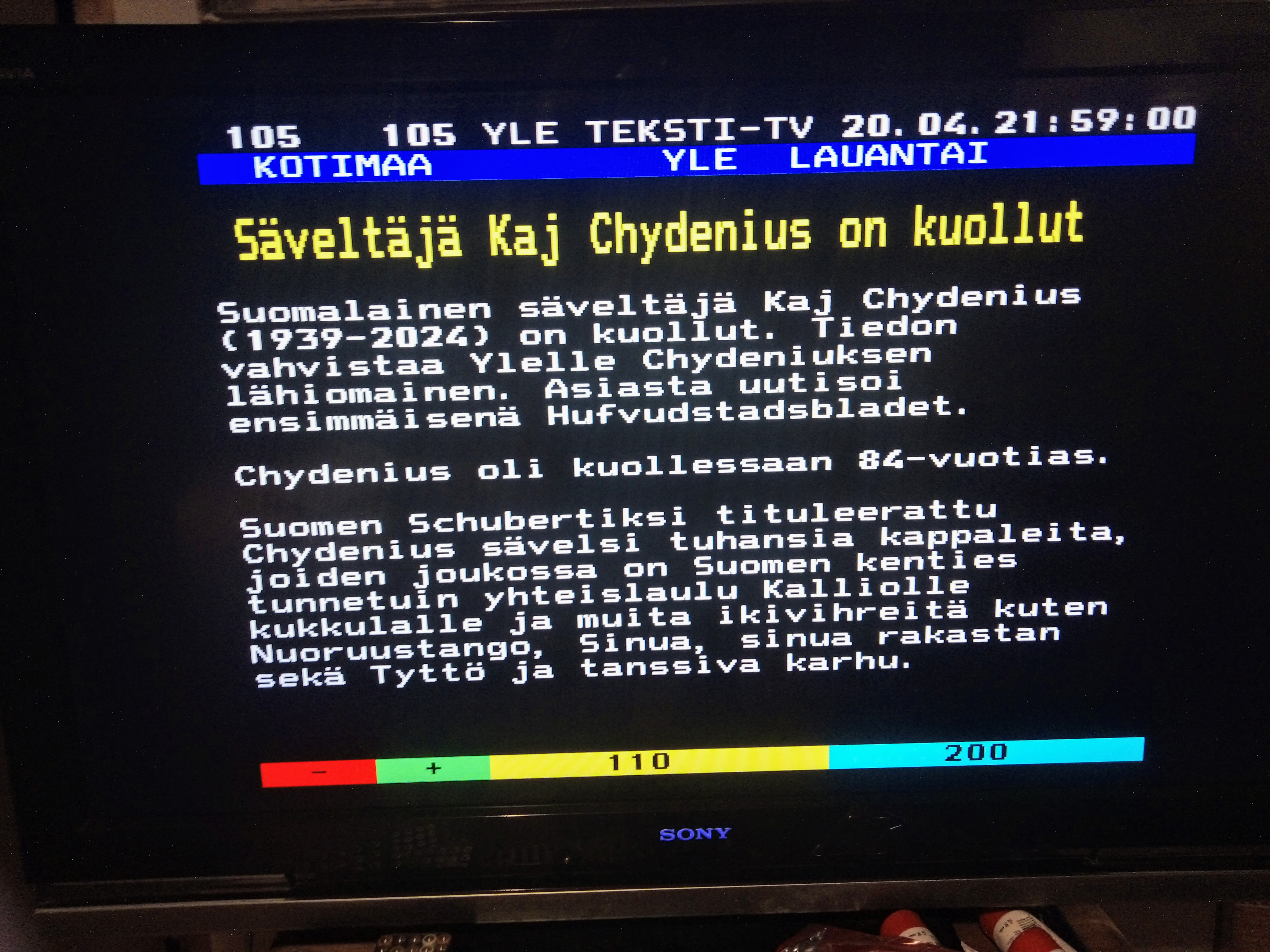 SANOMANETTI - N:o 2905 - 27.04.2024 - Kunnian polut. Liputus veteraaneille. Lauantaina 27.4.2024 15:33. Uusimaa. Kirkkonummi. Veikkola. Kuva Pertti Manninen. - Arkisto 21 vuotta sitten: Torstaina 24.04.2003. Paths of Glory. Laukaa-Konnevesi torstaina 24.04.2003. Torstaina 24.04.2003. Paths of Glory. Kuvan unelmoinut Stanley Kubrickin elokuvan mustavalkoisesta sanomalehtikuvasta Pertti Manninen. Katso myös kuva: Stanley Kubrick ohjaamassa kauhuelokuvaa Hohto vuonna 1979. Arkisto 21 vuotta sitten. ---Takatalvi Kuvat . Cadillac 1956 ja Audi 2024. Kuvat Pääkirjoitus. Pysäyttäkää Stubb ajoissa! Lue! Naakat - Sale. Suomi - Oi maamme - Fratelli d'Italia - Kurkia pellolla - Näin on ... - Kokoontumista - Fasaani ja sepelkyyhky - Iloa ja surua. Kuvat 21.04.2024. - Kuvat - Takatalvi. Hiukan täydennystä perjantaina 19.4.2024. Uusimaa. Kirkkonummi. Veikkola. Kuva Pertti Manninen. 21.4.2024. - Takatalvi Lauantaina 20.4.2024 10:05. Lauantaina 20.4.2024 10:06. Lauantaina 20.4.2024 10:08. Lauantaina 20.4.2024 10:24. Lauantaina 20.4.2024 10:36. Lauantaina 20.4.2024 10:42. - Säveltäjä Kaj Chydenius on kuollut ... sävelsi tuhansia kappaleita, joiden joukossa on Suomen kenties tunnetuin yhteislaulu Kalliolle kukkulalle ja muita ikivihreitä kuten Nuoruustango, Sinua, sinua rakastan sekä Tyttö ja tanssiva karhu. Yle teksti-tv 20.04. 21:59:00. -Sunnuntaina 21.4.2024 17:27. Sunnuntaina 21.4.2024 17:27. Uusimaa. Kirkkonummi. Björkdal. Kuvat Pertti Manninen. --- 17.4.2024. Autot 1956 ja 2024. - 1956. "Presidentti Kekkonen poistuu kirkosta jumalanpalveluksen jälkeen ja astuu komeaan Cadillaciin adjutanttien seistessä ryhdikkäästi auton avoimen oven vieressä." Muistikuva 42 vuotta myöhemmin. 1.4.1998. Pertti Manninen: 3 rullaa, 32 kuvaa, 13-vuotiaan koulupojan ensimmäiset valokuvat. Helsinki, Kallio 1956. galleria/vanhat/1956/kallio/ - 2024. Tasavallan presidentti Alexander Stubb valitsi autokseen panssaroidun Audin. Osakuva Iltalehdessä 13.4.2024 julkaistusta kuvasta, joka kertoi verollepanosta. Hymyt poiminut Pertti Manninen. --- 13.04.2024. Kuvia. Naakat. Toinen naakka vaihtaa viereisen kaupan katolle. Uusimaa. Kirkkonummi. Tori. Kirjasto. Tiistaina 9.4.2024 12:28. Kuva Pertti Manninen. Sale. Suomi. Mikael Agricolan päivä, suomen kielen päivä. Lippu ei liehu nyt. Uusimaa. Kirkkonummi. Tori. Tiistaina 9.4.2024 13:26. Kuva Pertti Manninen. Oi maamme Kohta maaleja tehdään. Suomi- Italia: 2-1!. Uusimaa. Helsinki. Olympiastadion. Yle suora. Tiistai 9.4.2024 19:11. Kuvat Pertti Manninen. Fratelli d'Italia Kurkia pellolla. Kurkipari valitsemallaan pellolla hiukan paikkaansa muuttaen. Uusimaa. Kirkkonummi. Lapinkylä. Keskiviikko 10.4.2024 12:28. Kuvat Pertti Manninen. Näin on ... Näin Suomi varautui kulisseissa Venäjän uhkaan. - Näin paljon suosikkituotteesi hinnat ovat nousseet. Ilta-Sanomat. Iltalehti. Keskiviikko 10.4.2024 14:52. Uusimaa. Kirkkonummi. Veikkola. S-Market. Kuva Pertti Manninen. Kokoontumista seuraten. Kurkien pyörintää ennen matkan jatkamista. Uusimaa. Kirkkonummi. Björkdal. Keskiviikko 10.4.2024 16:5. Kuva Pertti Manninen. Fasaani ja sepelkyyhky samalla apajalla. 17:08 19:42. Joitain murusia vielä maastakin löytyy. Uusimaa. Kirkkonummi. Björkdal. Keskiviikko 10.4.2024. Kuva Pertti Manninen. Iloa ja surua. 7-vuotias adoptiolapsi vuosien odotuksen jälkeen. - Näyttelijä Maria Aro on kuollut. Uusimaa. Kirkkonummi. Munkinmäki. Tokmanni. Torstai 10.4.2024 10:19. Kuva Pertti Manninen. - 13.4.2024. Runoilija Pentti Saaritsa kuollut. 107 YLE TEKSTI-TV 12.04.19:10:0 KOTIMAA YLE PERJANTAI Runoilija Pentti Saaritsa kuollut Runoilija ja suomentaja Pentti Saaritsa on kuollut 82-vuotiaana sairaalassa Helsingissä. Helsingin Kalliossa kasvanut Saaritsa teki läpimurtonsa runoilijana ja suomentajana 1960-luvulla. Hän oli suomentajana latinalaisamerikkalaisen kirjallisuuden asiantuntija. Saaritsan laajaan tuotantoon kuuluu yli 20 runoteosta, lähes sata suomennettua teosta ja useita satoja laulutekstejä ja laulujen käännöksiä. Hänet on palkittu sekä kääntäjien että kirjallisuuden valtionpalkinnoilla. 110 200 Kuva: "Tuuli käy heidän ylitseen. Sarja "Tuuli käy heidän ylitseen. Kuvat Pertti Manninen. Pentti Saaritsa Nettisanomissa. Nettisanomat Keskiviikko 2007-05-30. Claes Andersson 70 v. (s. 1937-05-30) Terapeuttinen luovuus Kun ihminen särkyy ajatukset kaikkoavat hänestä kuin kohmeiset varpuset. Siemenet valuvat hänestä ja hän kovertuu tyhjäksi. Se käy niin hitaasti ettei hänen äitinsäkään ehdi huomata mitään. Me huomaamme sen vasta kun hänen silmänsä ovat poissa, katse hyytynyt. Vielä vähän aikaa hän kulkee edelleen kuin liikkeen omalla voimalla. Hän se oli, hän se oli jossa kerran piili ilon rakkauden yhteenkuuluvaisuuden kaikki mahdollisuudet. Runo Claes Anderssonin kokoelmasta Runoja meren pohjalta, WSOY 1996. Käännös Pentti Saaritsa. /2007/05/30/etusivu.htm Lauantai 2010-03-13 klo 11:29 TV1 lähettää suoraa kuvaa Säätytalolta Helsingistä. jossa pidetään parhaillaan Talvisodan päättymisen 70-vuotispäivänä juhlatilaisuutta. Puhujana näyttää olevan Ohto Mannisen näköinen mies, toivottavasti näkökuva on oikea. Talo ja sali on remontoitu komeaksi. Aikoinaan ennen remonttia pidimme siellä useita työpaikan kokouksia kun pomolla, Tieteellisten kirjastojen atk-yksikön johtajalla, Seppo Vuorisella, oli silmää käyttää hyväkseen vanhoja arvokkaita tiloja. Täällä muuten pidettiin myös sotasyyllisyysoikeudenkäynti, joiden tuomioiden purkamista nyt vaaditaan tai ainakin esitetään. Pääministeri Martti Vanhasen mielestä kunniaa ei tarvitse palauttaa, koska sitä ei koskaan ole poisotettukaan. Onhan sekin selitys, mutta väärä epäoikeudenmukainen tuomio jää sitten voimaan. Onko sekään oikein? Olen muuten puristanut yhden tuomitun kättä, kun vielä 60-luvun alussa Helsingin yliopiston rehtorina ollut Edvin Linkomies toivotti kaikki uudet ylioppilaat kädestä pitäen yliopistoon. Meillä piti olla
