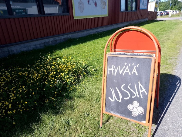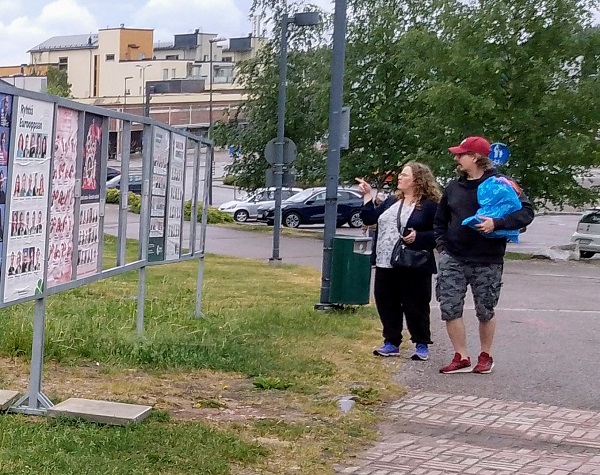 Kirkkonummen punaisella torilla Eurovaalien sloganit ja naakkakin tänään.