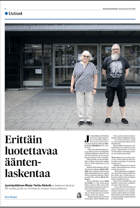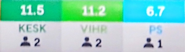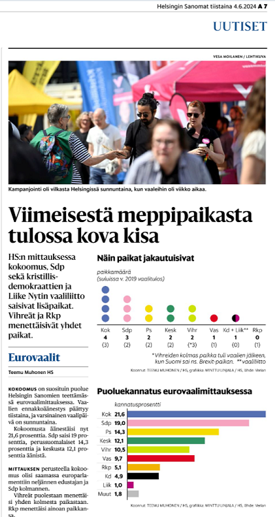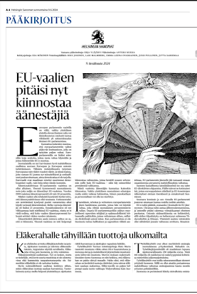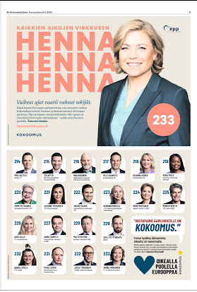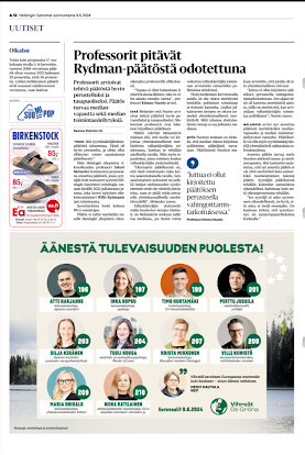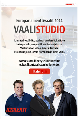 "HS:n mittauksessa kokoomus, SDP sekä kristillisdemokraattien ja Liike Nytin vaaliliitto saisivat lisäpaikat, Vihreät ja RKP menettäisivät yhdet paikat." "Näin paikat jakautuisivat. Kok 4 (3), SDP 3 (2), Ps 2 (2), Kesk 2 (2), Vihr 2 (*3), Vas 1 (1), Kd+Liik** 1 (0). RKP 0 (1) Puoluekannatus eurovaalimittauksessa. "Tutkimuksen virhemarginaali on noin 2,5 prosenttiyksikköä suurimpien puolueiden kohdalla joten tuloksiin sisältyy luonnollisesti epävarmuutta." " Kamppailu viimeisistä paikoista on mittauksen perusteella tiukka. Viimeisessä paikassa on kiinni vihreät ja toiseksi viimeisessä kokoomus. RKP:n eniten ääniä kerännyt ehdokas olisi ensimmäinen ulos jäävä. Toisena ulos jäisi vasemmistoliiton toiseksi eniten saava ehdokas." Pääkirjoitus. Tavallisesti näissä galluppien otsikoissa unohdetaan tutkimukseen luonnostaan sisältyvät virhemarginaalit herttaisen herttaisesti. Tähän syyllistyvät tavallisesti kaikki tiedotusvälineet. Kun nyt kerrankin sattui kohdalle otsikko: Viimeisestä meppipaikasta tulossa kova kisa (HS 4.6.2024), joka todella kertoi kaiken, toisin sanoen viimeinen paikka tai pikemminkin pari- kolme viimeistä paikka ratkeavat mahdollisesti hiuksen hienoilla eroilla, on sitä kehuttava. Tähän sitten pohdintaa, joka ehkä itse tekstissä on sitten suoraviivaistettu. Kun oletetaan, että kaksi prosenttia annetuistä äänistä menee hukkaan heti kättelyssä (Muut),. niin ihan varmaan meppipaikkaan tarvitaan 6,53 prosenttia annetuista äänistä. Suomessa kuitenkin lasketaan paikat vertailuluvuilla, eli vaaliliiton äänimäärä jaetaan sitten luvuilla 2, 3 ja 4 jne, jolloin siitä viimeisestä sitten ihmetellään kenelle se osuu. Jos nyt kuitenkin selostustekstissä otettaisiin huomioon virhemarginaalitkin, niin HS:n tutkimuksenkin mukaan kannatusprosentit ovatkin vaihteluvälein ilmaistuina: Koko äänestyspotti on tietenkin jaettava, mutta yksittäisen puolueen tulos voi olla tietenkin ala- tai ylärajalla tai tietenkin näistäkin poikkeava, koska vaaliput lasketaan vasta sunnuntaina 9.6.2024 klo 20 jälkeen ja tulosta julistetaan varmaankin sitten tuntia myöhemmin. Viimeisestä meppipaikasta tulossa kova kisa! Pääkirjoitus. Pertti Manninen. Lauantai 8.6.2024 10:34. |