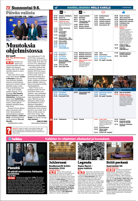 SANOMANETTI - N:o 2929 - Sunnuntai 30.06.2024 - Extra! Puheentunnistuksen tekstiä Pajusen ja Heikkisen ohjelmasta 28.6.2024. Sarjassa Epätäydellinen maailma. - Arvopohjainen realismi - Stubb muutti puhettaan Ukrainan voitosta - näin hän selittää MTV:llä (IL) - Lähteet: Ukraina tukeen merkittävä käänne Usa:ssa. (IL) - Ukraina ja EU solmivat turvallisuussopimuksen. (IL) - Joukko venäläisiä haluaa väkivaltaisen lopun Putinille. (IL) - Miksi venäläissotilaat tappavat itsensä ja kaverinsa ? (IL) - Mikä ero on DCA:lla ja Natolla? Uutissuomalainen kävi läpi, millaisesta sopimuksesta eduskunta pian päättää. (Keskisuomalainen) - Rölli ja metsän henki. (2002). "Elokuva saa katsojan pohtimaan hyvän ja pahan olemusta - iästä riippumatta." (Keskisuomalainen. Marko Ahonen.) - Stubb armahti huumerikollisen. Näin hän oli puhunut armahdusoikeuden käytöstä ennen presidentinvaaleja. (HS) - Ukrainan sota. Suomi toimittaa Ukrainaan uuden 159 miljoonan euron tukipaketin. (HS, kuvassa Häkkänen) - Tuomiot. Päätekijöille pitkät tuomiot. Oikeuspiti Dödspartrulleniin kytkeytynyttä Suomen ... (HS, kuvassa paketteja). - Arvopohjainen realismi - Koonnut Pertti Manninen. --- Lauantai 29.06.2024 - Kuvat - Heurekan astronautit: Akseli, Frans ja Lasse. Tiedekeskus Heurekan reissulta tiistaina 25.6.2024. Kuvat lähetti Lasse M. --- Sunnuntai 23-06-2024 - Arvopohjainen realismi (Stubb) - JUHANNUKSEN JÄTTILEHTI Tv-ohjelmat, lisäristikot, juhannusvisa... ILTALEHTI alma Petteri Orpon erikoishaastattelu JUHANNUS PERHEEN KANSSA KESÄRANNASSA Ex-pääministerin tavanneet ulkomaalaiset kertovat TÄLLAINEN SANNA MARIN ON KULISSIEN TAKANA "Yksi heikkous" IL:n suuri kysely TÄLLAISTA ON SUOMALAISTEN SEKSIELÄMÄ Ukrainassa taistellaan suomalaisten opeilla "PELASTANUT MONTA HENKEÄ" Juha Miedon, 74, OHJEET STRESSIN POISTOON Helmi Loukasmäki, avoimena JATKUVA VERTAILU ARMIIN TURHAUTTAA TESTASIMME MAKULONKEROT JA UUDET GRILLIMAKKARAT Mervi Kallio, 47, PALJASTAA HUIMAN KUNTONSA SALAISUUDEN SUOMEN SUURIN UUTISMEDIA ILTA-SANOMAT PERUSTETTU 1932 160 sivua! JUHANNUSJÄTTI MÖKKIEN MAHTAVAT MUODONMUUTOKSET JULKKISTEN IHANAT HÄÄKUVAT Vihkiminen vuoren huipulla: poliisit juhliin, kimppu unohtui ... Yhdessä 35 vuotta TEEMU AVAUTUU RAKKAUDESTA SIRPAAN Kirsi Alm-Siira Juhannuksen- vietto mullistui Suuret tietovisat: 150 kysymystä Tonnin ristikko Rakkaushoroskooppi Li Andersson Brysseliin TYTÄR VAIKUTTI ISOON PÄÄTÖKSEEN Tällaista on elämä 60000 €/kk -eläkkeellä OSTA MYÖS ... Arvopohjainen realismi (Stubb) --- Lauantai 22.06.2024 - Juhannus - Arkisto. Kuva vuodelta 1960 (n.). - Kivisaaren juhannuskokko "65 vuotta sitten". Kivisaari. Helsinki. Vuonna 1960 (n.). Ullakolta löytyneestä paperikuvasta keskiviikkona 2008-06-18. Sinistys ja kontrasti perjantaina 2011-06-24. Pertti Manninen. Isonnettuna 2014-06-21. --- Perjantai 21.06.2024. - Kuvia aatonaattona 20.6.2024. 09:15 Hyvää Jussia! RMV-korut. Munkinmäentie. Kirkkonummi. Uusimaa. 12:36 Hyvää lomaa! Uimahalli. Gesterbyntie. Kirkkonummi. Uusimaa. 14:04 Hyviä lukuhetkiä! City Market. Kirkkonummi. Uusimaa. 16:02 Hyvää satoa! Oitmäki. Kirkkonummi. Uusimaa. 20:24 Käsi kädessä Poika pitelee tanskalaisen pelaajan kättä lujasti astuessaan kansallishymnin kuulemiseen. Ylen kuva. Frankfurt. Saksa. Kuvat Pertti Manninen. --- Torstai 13.06.2024. Arkisto. Kuva. 2003 tammikuu. Stanley Kubrick ohjaamassa kauhuelokuvaa Hohto vuonna 1979. Alunperin mustavalkoisen kuvan tunnelman luonut Pertti Manninen. - Shining (Hohto) maanantaina 03.02.2003 MTV3:ssa. - Hohto ***** Stanley Kubrickin Hohto (The Shining, 1980) keräsi kovasti kehuja, mutta kirjailija Stephen King ei elokuvasta innostunut. Varmaankin siksi, että Kubrick otti suuria vapauksia alkuperäisteoksen suhteen. Tarina on hämäävän yksinkertainen. Jack Torrance (Jack Nicholson) perheineen saapuu talvivahdiksi suljettuun erämää hotelliiin, Hohto on hieno kauhuelokuva, joka toimii vielä paremmin sekoamisen ja hulluuden kuvauksena. Marko Ahonen. Päivän tv-vinkit. Keskisuomalainen torstaina 13.6.2024. --- Maanantaina 10.6.2024. Illan jännittävin minuutti. Kuvat. Petteri Orpo Annika Saarikko Riikka Purra Sofia Virta Antti Lindtman Li Andersson Li Andersson Kuvat sunnuntaina 9.6.2024 19:59:14 - 20:00:22 MTV3:n suorasta lähetyksestä. Pertti Manninen. ENNAKKOÄÄNET 00:58 - 00:38 - 00:21 - 00:17 - 00:09 - 00:01 - 00:00. - 25,3 KOK 4 --- 18,3 VAS 3 --- 15,6 SDP 2 --- 11,5 KESK 2 --- 11,2 VIHR 2 --- 6,7 PS 1 --- 5,6 RKP 1 --- 4,0 KD 0 --- 0,5 LIIK 0. - Kuvissa puolueiden puheenjohtajat H-hetkellä. --- Sunnuntai 09.06.2024. - Meidän poikamme maailmalla. Jesse Joronen ja Joel Pohjanpalo ennen peliä ja sitten juhlittuina. Joukkuekuva ennen ensimmäistä ottelua torstaina 30.5.2024 23:38 ja voiton huuman kultatuoli- ja halauskuvat maanantaina 3.6.2024 00:30. Kuvat Iltalehden lähetyksestä Pertti Manninen. - EU-vaalit. Sivuja kolmesta lehdestä vaalipäivänä. Keskisuomalinen, Helsingin Sanomat ja Iltalehti. --- Lauantai 08.06.2024 - Kuva. Tuossa! EU-vaalit 2024. Tuossa! Uusimaa. Kirkkonummi. Kirkkotori. Torstaina 6.6.2024 11:41. Pertti Manninen. - Kerrankin kunnollinen otsikko! Lue! Helsingin Sanomat tiistaina 4.6.2024. Uutiset. Viimeisestä meppipaikasta tulossa kova kisa. Eurovaalit. Teemu Muhonen HS. "HS:n mittauksessa kokoomus, SDP sekä kristillisdemokraattien ja Liike Nytin vaaliliitto saisivat lisäpaikat, Vihreät ja RKP menettäisivät yhdet paikat." - Pääkirjoitus. Kerrankin kunnollinen otsikko! Tavallisesti näissä galluppien otsikoissa unohdetaan tutkimukseen luonnostaan sisältyvät virhemarginaalit herttaisen herttaisesti. Pääkirjoitus. Pertti Manninen. Lauantai 8.6.2024 10:34. - Kaksikymmentä vuotta sitten. Torstai 10.6.2004. Etusivu ja HS-Gallupin kritiikki. --- Tiistai 04.06.2024 - nettisanomat. Extra! "Paul Wolfowitz". Kuva: Pertti Manninen. Photograph. ... - Wolfowitz 2003 - Putin 2022 - Netanjahu 2023 ... --- Sunnuntai 02.06.2024 Kuva. Tammi ponnistaa
