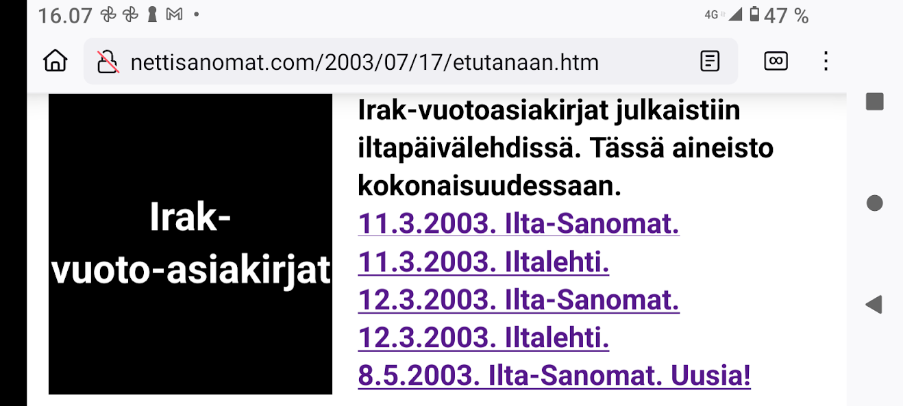 | Tällaista otsikkoa en ole nähnyt ... Toinen mielenkiintoinen seikka lienee myös jäänyt kertomatta ... Ilta-Sanomat jaksaa vielä hiukan pyristellä ... Vielä ennen Irak-vuodon vapauttavaa tuomiota SanomaWSOY:ssä ... Paavo Lipponen ei ole ainakaan vielä joutunut selvittämään ... Demokraattisessa valtiossa selvitys näistä asioista kuuluisi tehdä ... Ilta-Sanomien päätoimittaja Antti-Pekka Pietilälle sopii luettavaksi ... Mitkään kampanjat eivät pystyneet murtamaan ... Pääkirjoitus. |
