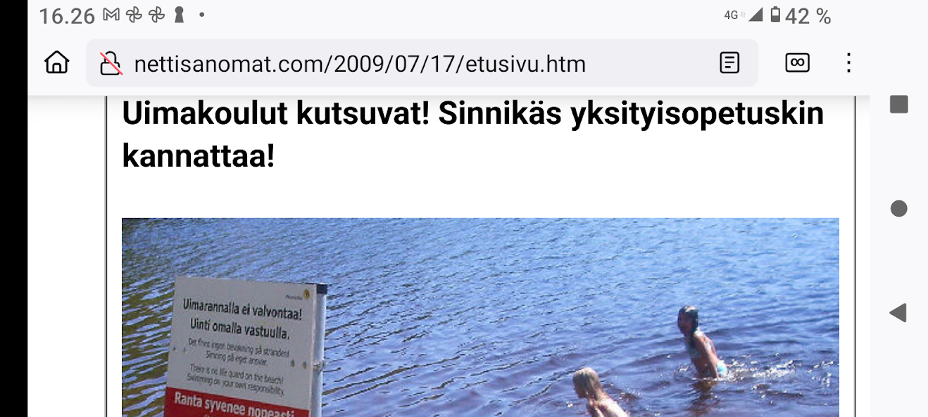 Lopuksi maanpinnalle tai pikemminkin veden. Kesän hyvä teko - opeta lapsi uimaan. Tämä on aina ajankohtainen ja nettisanomissa näille ohjeille on linkki lähes joka sivulta, siis tuhansia linkkejä, tuhansien järvien maassa. Pertti Manninen, torstaina kesäkuun 3. päivänä 2004, nettisanomat, nettisanomat.com ja nettisanomat.fi 03.06.2004. |