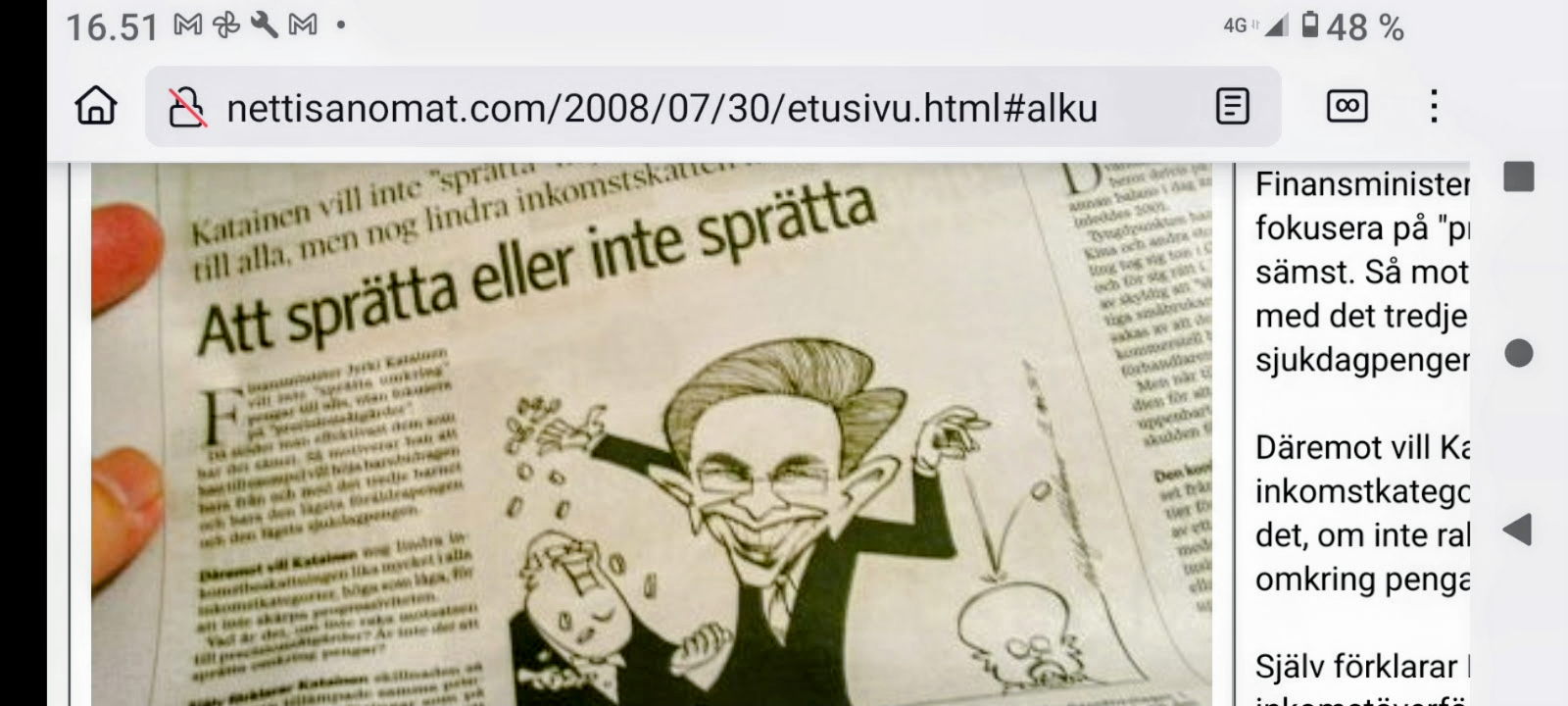 | Tällaista otsikkoa en ole nähnyt ... Toinen mielenkiintoinen seikka lienee myös jäänyt kertomatta ... Ilta-Sanomat jaksaa vielä hiukan pyristellä ... Vielä ennen Irak-vuodon vapauttavaa tuomiota SanomaWSOY:ssä ... Paavo Lipponen ei ole ainakaan vielä joutunut selvittämään ... Demokraattisessa valtiossa selvitys näistä asioista kuuluisi tehdä ... Ilta-Sanomien päätoimittaja Antti-Pekka Pietilälle sopii luettavaksi ... Mitkään kampanjat eivät pystyneet murtamaan ... Pääkirjoitus. |