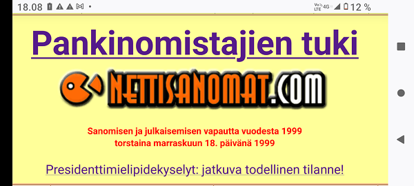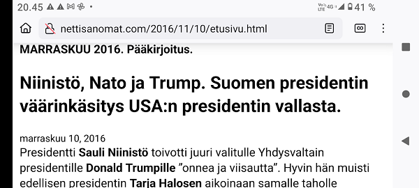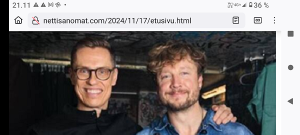 SANOMANETTI - N.o 2964 - Maanantai 18.11.2024 - "18.11." 1999-2024, linkit ja tekstit.. --- SANOMANETTI - N.o 2963 - Sunnuntai 17.11.2024 - Kuva. Minä . Minä ja Samu. Presidentti Alexander Stubb piipahti Samu Haberin keikalle Tavastia-klubille perjantaina 15.11.2024. Osa IS:n julkaisemasta Haberin kuvasta. Pertti Manninen. - Arkisto. Kuva. 2013 "Jyrki, Robin ja Minä". "A fantastic #Robin Concert. - Osasuurennos Alexander Stubbin keskiviikkona 2013-03-13 julkaisemasta kuvasta. --- SANOMANETTI - N.o 2962 - Lauantai 16.11.2024 - Kuva. Tärkeä hetki. Maamme. Suomen jalkapallonuorukaiset ja pienemmätkin pojat kuuntelevat ja laulavatkin Maamme-laulua ennen pelin alkamista. Suomi - Norja 5-1! Ylen lähetyksestä perjantaina 15.11.2024 18:43. Kuva Pertti Manninen. Lisää kuvia tulossa! --- SANOMANETTI - N.o 2961 - Perjantai 15.11.2024 - Kuva. Superkuun sijaan hirvet ja peurat. Kuu ei ollut noussut tässä kohtaa vielä näkyviin, mutta tulipahan tilalle kuitenkin aikamoinen joukko muuta illan punassa. Uusimaa. Kirkkonummi. Kauhala. Vesterkulla.. Perjantai 15.11.2024 16:15. Kuva Pertti Manninen. --- SANOMANETTI - N:o 2960 - Torstai 14.11.2024 - Kuva. Näyttelystä poistuu Kalle Kettunen ja toverinsa kera Kirkkonummen kirjaston Porkkala-salista torstaina 14.11.2024 12:50. Kuva Pertti Manninen. - 13.11.–7.12.2024 Kirkkonummen Taideyhdistys Kyrkslätts Konstförening Kutsunäyttely – Inbjuden konstnär Irma Kanon Öljyvärimaalauksia ja kollaaseja Oljemålningar och kollage. --- SANOMANETTI - N:o 2959 - Keskiviikko 13.11.2024 - . Kuva. "Det är aldrig försent att börja Leva ett riktigt liv ... Kommande evenemang Kyrkslätts Seniorer r.f. 13.11. -80+ dagen firas i Odd Fellow Logen kl. 10:00. Bild Pertti Manninen. Mera bilder och trubadurens namn på väg. --- SANOMANETTI - N:o 2958 - Sunnuntai 10.11.2024 - T R I U M P H - ILTA-SANOMAT Vaaliextra 2024 Historiallinen paluu TRUMPIN VOITON VAIKUTUS SUOMEEN Nato, Venäjä, talous ... Niinistö paljastaa; Tällainen Trump on kahden kesken Asiantuntijat: Näihin Harris kompastui ILTALEHTI Trump kommentoi heti sotaa IL-analyysi TÄLLAISEN TARJOUKSEN PUTIN SAA Kaikki USA:n vaaleista Teemu Selänteeltä viesti suomalaisille 10 helppoa vinkkiä Näin voit saada 200 euroa lisää kuussa Keikka peruttiin yllättäen Danny pääsee leikkaukseen Prinssi Andrew'n kotikartano hajoaa käsiiin Pahasti velkaantunut Sedu Koskinen siivoaa vessoja Tällaista elämä on nyt - T R I U M P H : Suomi. Uusimaa. Kirkkonummi. Keskusta. Prisma. Torstai 7.11.2024 11:27. Kuva Pertti Manninen. - Isämpäiväkuva - Isänpäiväkuvalinkie2000-2024. --- SANOMANETTI - N:o 2957 - Perjantai 01,11.2024 - Itsenäisyyspäivän juhlat 2024 n. 6.12.. Kyllä itsenäisyyspäivää pitää juhlia ja kunnioittaa itsenäisyyspäivänä 6.12 eikä noin 6.12 Pääkirjoitus - Kuva. Kaksi veteraania. Kuvassa veljekset, veteraanit Erkki ja Terho Manninen Erkin pojan ottamassa kuvassa jouluna 1957. --- Tiistai 29.10.2024 - Hämärtyvässä. Peuroja 16:05. Hirviä 16:06. Uusimaa. Kirkkonummi. Kauhala. Vesterkulla tiistaina 29.10.2024 16:05 ja 16:06. Kuvat Pertti Manninen. --- Nettisanomat N:o 2955 - Torstai 24.10.2024 - Kaikilla ihmisillä on rajansa. Marja Huovila esittelee uutta kirjaansa keskiviikkona 23.10.2024. Kirkkonummen-Siuntion Sydänyhdistys ry, Veikkolan kerho, Kisapolku 1. Kirjallisuus: Kaikilla ihmisillä on rajansa/ Marja Huovila. PIrkko Kautto haastattelee. Kuva Pertti Manninen. Lue kirjan esittely! YK:n päivänä 24.10.2024 Suomessa. Valtiolippu liehuu Paska kiehuu. ILTA-SANOMAT: Ukottelua, kiroilua... Marin ja Niinistö älähtivät kohuväitteistä. ILTALEHTI: Näin Marin koki Niinistön toiminnan kulisseissa. "Se ukko yrittää puuttua joka asiaan. Suomi. Uusimaa. Kirkkonummi. Keskusta. Poliisi 12:44 ja Tokmanni 11:35. Kuvat Pertti Manninen torstaina 24.10.2024. Lue myös! 2020. Toukokuu. Oikeuskansleri Pöysti arvioi Niinistön Nyrkkiä: ”Pandemian tyyppisessä tilanteessa nimenomaan valtionneuvosto on se toimija, joka johtaa yleisesti turvallisuuden ylläpitämistä.” --- Nettisanomat N:o 2954 - Torstai 17.10.2024 - Asunnottomien yötä vietetään 17. lokakuuta YK:n köyhyyden ja syrjäytymisen vastaisena päivänä Helsingissä Kansalaistorilla ja eri puolilla Suomea. Vuoden 2024 teemana on: ”PIILOSSA ASUNNOTTOMANA”. Asunnottomien yö -kansalaisliike - Arkisto 2005. Maanantaina 17.10.2005 klo 08:50 Ylen radion aamulähetyksessä puhutaan asunnottomuudesta. Johdanto ja osa alkupuheenvuorosta puuttuu. Muitakin uutisia lopuksi. --- Maanantai 14.10.2024 - Kuvia lokakuun 14. tienoilla 1999- 2024. --- Maanantai 07.10.2024. - Kuvia lokakuun 7. tienoilla 1999- 2024.- Ydinaseet 1999- 2001. Kirjoituksia aseista ja niiden kannattajista ja vastustajistakin. 1999 - 2000 - 2001. --- Tiistai 01.10.2024 - Liput liehuvat Miina Sillanpään ja kansalais-vaikuttamisen päivänä 1.10. Aamulla Joutsenpari 8:33. ... Päivällä. Ruohonleikkureita 10:01. ... . Iltapäivällä. Naakkoja 15:19. .... Kuvat Pertti Manninen..- Pankit 1999. Kirjoituksia pankeista, omistajista, johtajista ja asiakkaistakin. Linkit 1999: 07-08- 09-10-11-12--- Lauantai 28.09.2024 - Kuvat - Lähtöä odottaen. Joutsenia kerääntyy . - . --- Torstai 19.9.2024 - Taas suomalaisia höynäytettiin. Ei saatu salkkua eikä komissaaria! - .-- 13.09.2024 - Kuvat. Naakka lähtee lentoon. . --- 11.09.2024 - Arkisto: 11.9 syyskuussa 1973 , 51 vuotta sitten, Allende, Chile. Santiago, - Arkisto: 11.9 syyskuussa 2001, 23 vuotta sitten, WTC-tornit, New York. --- Lauantai 07.09.2024 - Huh hellettä syyskuussa 2024 Rasmus nauttii - Pääennustus 24.7.2024: Varapresidentti Kamala Harris, ainakin tällä hetkellä varapresidentti, lyö ex-presidentti Donald Trumpin kanveesiin ja hänet valitaan uudeksi Yhdysvaltain presidentiksi. Virassa oleva presidentti John Biden tyytyy kohtaloonsa ja kaikki huomio USA:ssa keskittyy nyt Harrisin ja Trumpin väliseen kamppailuun tai sotaan. Muut sodat taitavat jäädä unhoon, valitettavasti. 