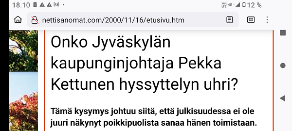 Onko Jyväskylän kaupunginjohtaja Pekka Kettunen hyssyttelyn uhri? Tämä kysymys johtuu siitä, että julkisuudessa ei ole juuri näkynyt poikkipuolista sanaa hänen toimistaan. |