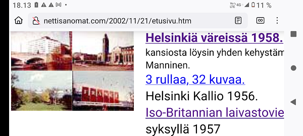 Helsinkiä väreissä 1958. Mustavalkoisten negatiivien kansiosta löysin yhden kehystämättömän diafilmin. Pertti Manninen. 0 1 2 3 4 5 6 7 8 9 10 11 12 (Kadonnut) 13 14 15 16 17 18 19 20 21 22-23 Äiti kotona. 24-29 Äiti ulkona. 30 31 32 33 34 173 Joka torstai Helsinkiä väreissä 1958. Mustavalkoisten negatiivien kansiosta löysin yhden kehystämättömän diafilmin, jonka vuosi on vielä tarkistettava: Ranskan teollisuuden näyttelyn vuonna kuitenkin. Kuvat ottojärjestyksessä kaupunkia kuvaten. Tähtitorninmäellä otin kuitenkin lapsista kaksi kuvaa. Te, jotka kuljitte niihin aikoihin isosiskon kanssa, voitte tunnistaa itsenne. Arvoitukseksi jää mihin kuva numero 12 on joutunut. Pertti Manninen. http://www.nettisanomat.com/2002/11/21/etusivu.htm |