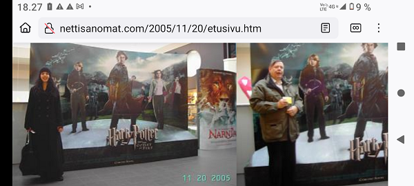 Kuvat 20.11.2005 marraskuun sunnuntaina klo 14:08 ja14:09. "Onnelliset peruutuspaikan saaneet katsojat asettuvat kuvaan Harry Potterin ja ystävien seuraksi juuri ennen päivän ensimmäisen näytöksen alkua." Kuva Pertti Manninen ja Erika Manninen. Jyväskylä, elokuvateatteri Fantasia. Kiitokset kassanhoitajan ystävällisille ohjeille peruutuspaikkojen jonottamisessa. Sarjasta "Ihmisiä", tulossa! http://www.nettisanomat.com/2005/11/20/etusivu.htm |