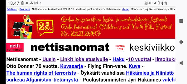 Edellinen - Seuraava - Nettisanomat keskiviikko 2009-11-18 - Vastaava päätoimittaja Pertti Manninen. Yhteys - Sanomisen ja julkaisemisen vapautta vuodesta 1999. |