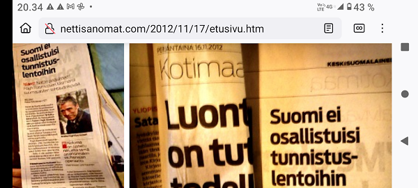 Mahalasku, Islannin ilmavalvonta, Media. Näitä ei päästy tunnistamaan. Tähän ensin joitakin tunnistuskohteita: Sitten mahalaskusta. Helsingin Sanomat, joka hehkutti kuukausikaupalla valvonnan hienoudesta, kuittasi sitten tuloksen lyhyesti Poiminta-otsikon alla, siis ilman mitään otsikkoa, näin: HS. Ulkomaat. Perjantai 2012-11-16. ”Ei tunnistuslentoja Islannissa” ”Naton pääsihteeri Anders Fogh Rasmussen tarkensi torstaina Suomen ja Ruotsin roolia mahdollisessa Islannin ilmavalvontaoperaatiossa. Fogh Rasmussenin mukaaan kyseessä on rauhanajanoperaatio, joka on luonteeltaan harjoituksllinen.” ”Suomi ja Ruotsi eivät osallistuisi tunnistustlentoihin, sillä ne kuuluvat Naton jäsenmaille, Fogh Rasmussen sanoi pääministerin virka-asunnolla Kesärannassa. Pääministeri Jyrki Kataisen mukaan suomalaiset ja ruotsalaiset koneet olisivat todennäköisesti aseistamattomia.” Katainen uskoo, että nämä tiedot helpottavat päätöksentekoa operaatioon osallistumisesta. Hanke on herättänyt Suomessa epäluuloja.” Fogh Rasmussenin mukaan Islanti-operaatiolla ei ole mitään tekemistä Naton jäsenyyden kanssa. Vaikka päätös olisi kielteinenkin, se ei vaikuttaisi Suomen ja Naton suhteisiin. HS Helsingin Sanomat. Ulkomaat. Perjantai 2012-11-16. Vieressä oli pääjuttu ”Venäjän uhittelu ihmetyttää Natoa” . HS-haastattelu. Leo Pugin HS. Alaotsikko: ” Fogh Rasmussen: Venäjä on luonut keintokoisen vihollisen itselleen”. Keskisuomalainen sentään otsikoi ja kertoi, mistä tässä nyt on kysymys: ”Suomi ei osallistuisi tunnistuslentohin.” ”Islanti: Naton pääsihteeri Fogh Rasmussen täsmensi suomalaisten tehtävän kuvaa” ”… Katainen sanoi saaneensa keskustelussa pääsihteerin kanssa tärkeää selventävää tietoa asiasta.” ”- Natossa on ajateltu niin, että tämä on ensinnäkin rauhanajan operaatio. Toiseksi kysymyksessä on harjoitusluontoinen toiminta. Näin ollen tunnistuslennot eivät tulisi kysymyksen. Käytännössä se tarkoittaisi, että Suomi ja Ruotsi harjoittelisivat yhdessä ja myös Norjan kanssa yhteistoimintaa myös ilmavalvonnan alalla.” Keskisuomalainen. Kotimaa. Perjantai 2012-11-16. Helsinki Pekka Pohjolainen/STT. Sitten seuraavana päivänä Keskisuomalainen vielä kertoo Aamulehden jutusta: ”Homma olisi yhteistyössä Ruotsin kanssa vain harjoitustoimintaa. Nato peikko näyttää iskeneen nyt pääministeriinkin (..)” ”Islanti-operaatiota arkijärjellä miettiessä ei voi olla hämmästelemättä, miksi sinne yleeensä pitää mennä lentelemään, jos ensinnnäkään tunnistuslentoja ei tehä, eikä aseitakaan ole mukana. AAMULEHTI” Keskisuomalainen lauantaina 2012-11-17 Lehtiharava-otsikon alla, joka tarkoittaa siis ”Muut lehdet”-otsikkoa. Viikkosanomat. Pertti Manninen. Lauantai 2012-11-17 10:39. http://viikkosanomat.fi/2012/11/17/teksti-mahalasku-islannin-ilmavalvonta-media-naita-ei-paasty-tunnistamaan-nato-jyrki-katainen/ Lue myös! Herroilta, Niinistö ja Katainen, meni pupu pöksyyn Islannin ilmavalvonnassa. Valvonta muuttui harjoitukseksi, ei tunnistustehtäviä. Jyrki Katainen ja Sauli Niinistö. |