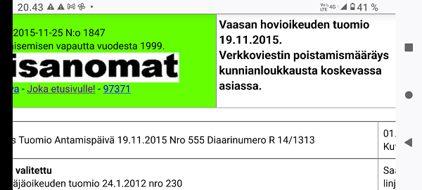 mobi - Keskiviikko 2015-11-25 N:o 1847 Sanomisen ja julkaisemisen vapautta vuodesta 1999. nettisanoma Vaasan hovioikeuden tuomio 19.11.2015. Verkkoviestin poistamismääräys kunnianloukkausta koskevassa asiassa. Vaasan hovioikeus Tuomio Antamispäivä 19.11.2015 Nro 555 Diaarinumero R 14/1313 01.10.2015 Jyväskylässä. Kuvia matkalla. Ratkaisu, josta on valitettu Keski-Suomen käräjäoikeuden tuomio 24.1.2012 nro 230 Käräjäoikeuden ratkaisu ja asian käsittelyn aikaisemmat vaiheet Manninen on valittanut tuomiosta hovioikeuteen, joka on 20.4.2012 antamallaan päätöksellä evännyt Manniselta jatkokäsittelyluvan. Korkein oikeus on 15.11.2012 myöntänyt Manniselle valitusluvan siltä osin, kuin hovioikeus on evännyt Manniselta jatkokäsittelyluvan koskien käräjäoikeuden antamaa määräystä verkkoviestien poistamisesta yleisön saatavilta. Korkein oikeus on 5.12.2014 antamallaan päätöksellä muuttanut hovioikeuden päätöstä siten, että Manniselle on myönnetty jatkokäsittelylupa koskien käräjäoikeuden antamaa määräystä verkkoviestien poistamisesta Mannisen ylläpitämiltä internet-sivustoilta. Korkein oikeus on palauttanut näiltä osin asian hovioikeuteen ja todennut, että asian ratkaistessaan hovioikeuden on lausuttava myös korkeimmassa oikeudessa esitetyistä oikeudenkäyntikuluvaatimuksista. 01.10.2015 Jyväskylässä. Kuvia matkalla. |