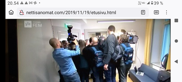Medialiitto? Kuvaajat ja toimittajat pääneuvottelijoiden kimpusssa kuullakseen, ettei mitään ratkaisua ole syntynyt. Kiista kulminoituu 700 postinlajittelijan siirtämisestä Medialiiton työsopimuksen piiriin. Kuva keskiviikkona 19.11.2019 klo 19:32 Ylen Femman uutisista. Pertti Manninen. |