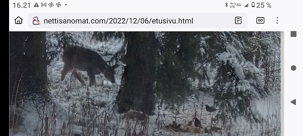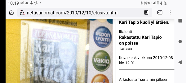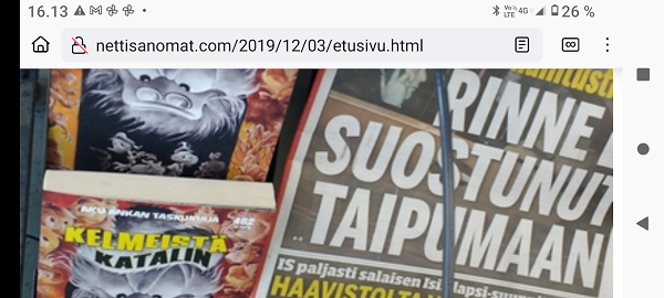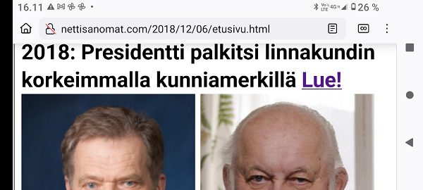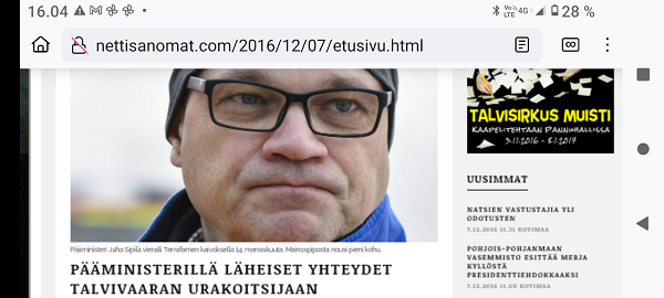 "Taivaallisen rahan aukiolle" johdattava rakennus on juuri purettu autojen paikoitusalueeksi. Lue! 20 vuotta sitten, 8. joulukuuta 1980, hyvästi. Lue! Tuuli käy heidän ylitseen. Kuva Suomalainen sosialisointi Jyväskylässä. Kaavaryöstö etenee. Raportti Itsenäisyyspäivän aattona 2002. Lue! Kaupunkikuvan reunasta löytynyt yksityiskohta, jonka halusin pelastaa. Kuva Sunnuntaina 26. joulukuuta 2004, tapaninpäivänä, kello 08.55 Suomen aikaa avasin television, joka oli jäänyt edellisenä iltana Ruotsin kanavalle. Ruudussa oli tekstiuutisia, joista kävi ilmi, että valtava hyökyaalto on iskenyt Intian valtameren rannikoille. Käänsin ohjelman BBC.News-kanavalle ja siellä oli jo kuvia ja selostusta tapahtuneesta. Kuva Alina Pogotskin - Jean Sibelius viulukilpailun voittaja 2005. Kuva "Paapuuri ja styyrpuuri illan hämärtyessä". Lauantaina 2006-12-02 lasten laivassa tukevasti maalla. Kuva Kaksoset XL-aterialla Kampin Scanburgerissa pitkän linjurimatkan jälkeen. Kuva "Suomalainen todellisuus. Materian totemi houkuttelee asiakkaita 1. adventtina". Extra! Nettisanomien sivu toukokuulta 2000: Kauppojen sunnuntaiaukiolojen lisäys. Lue! "Tämä tarjous ei toistu?". Suomi mukana jossakin aikaisemmassa EU:n huippukokouksessa edustajinaan pääministeri Matti Vanhanen (vasemmalla takana) ja tasavalla presidentti Tarja Halonen (oikealla edessä). Kuva Yletv2:n uutislähetyksesstä, jossa kerrottiin edustusasiasta ristiriitaisia näkemyksiä. Kuva Päivän puheenaiheet Ilta-Sanomat Kari Tapio kuoli yllättäen. Iltalehti Rakastettu Kari Tapio on poissa Tänään Kuva "Kyyhky ja tähti". Keski-Suomi. Jyväskylä. Kauppakatu. Keskiviikko 2011-11-30 klo 11.42. Kuva "Presidentiksi tultuaan Niinistö on ottanut myös julkisuudessa kantaa Talvivaaran tilanteeseen. Huhtikuussa Niinistö totesi Kalevalle, ettei pohjoisen kaivoshankkeiden valvontaa ole tarpeen lisätä, ja että alan lainsäädäntö on ajantasalla. Hän kertoi tuolloin näkevänsä kaivosteollisuuden "uutena Nokiana". Lue! Sattumalta lähdin matkaan ja sattumalta sain Ilta-Sanomat luettavakseni lauantaina 2013-11-30. Yhdessä kuvassa hän on sellaisena kuin hänet muistan. Olimme porukan kanssa Tampereella ja Pyynikin portaita laskeuduimme. Ja nyt sattumalta muistan, taas. Lue! "Viimeinen kuva" eli selfie ellei peräti selfish! PS. Viimeinen kuva tarkoittaa tämän pokkari Ricoh PX:n simahtamista suolaisessa merivedessä, vaikka kamera myyntihetkellä olikin "waterproof". Kuva Peuroja takapihalla. Kirkkonummi. Lapinkylä. Kuvat PÄÄKIRJOITUS. PÄÄMINISTERI JUHA SIPILÄ EI OIKEASTI HALUA KARISTAA JÄÄVIYSEPÄILYJÄ HARTEILTAAN. Niin kauan kuin pääministeri Juha Sipilä haluaa salata omistuksensa VAKUUTUSKUORIIN, niin ei ole mahdollisuutta selvittää onko hän jäävi osallistuessaan päätöksiin valtion rahojen myöntämisessä erilaisille yrityksille. Tämä Terrafame-case oli joko vahinko tai sitten koepallo tuleville suunnitelmille ja toiminnoille. Lue! Kysely: ”Herra tasavallan presidentti, kuinka te kehtaatte nostaa Euroopan investointipankista 3000 euron kuukausieläkettä?”(Sauli Niinistölle). Lue! Hallituksen puheenjohtaja Antti Aarnio-Wihuri on saanut vankilatuomion törkeästä veropetoksesta 1990-luvulla, josta tietoja on vaikea löytää. Google-haulla löytyi kyllä tietoa asiasta, kun osasi etsiä myös "veropetoksella". Lue! Kelmeistä katalin! Rinne ei suostunut taipumaan. Ilta-Sanomat tiistaina 03.12.2019 14:20. Lehtitelineessä suoraan ovesta sisääntullessa. Kirkkonummi. Lidl. Kuva Suomi24. Keskustelusta. LAINAUS HS: Ohisalon kohdistuva uhka ei pidä paikkaansa. Anonyymi 11.12.2020 23:14 ... Kukakohan mahtoi syöttää medialle väärää tietoa asiasta? LAINAUS LOPPUU Lue! Kaksi viikkoa myöhemmin ... Hallitus nyt maskissa eduskunnan kyselytunnilla torstaina 2.12.2021. Kuvat Illan hämärtyessä peura on löytänyt lintujen ruokintapaikan ja käyttää hyväkseen tarjoilua. Lue! Pääkirjoitus. Viimeinen itsenäisyyspäivä ilman ydinaseita? Lue! Päivän kookkain, lintu. Fasaani. Uusimaa. Kirkkonummi. Björkdal. Kuva Itsenäisyyspäivän juhlat 2024 n. 6.12. Kyllä itsenäisyyspäivää pitää juhlia ja kunnioittaa itsenäisyyspäivänä 6.12 eikä noin 6.12. Presidentti Stubb on nyt tehnyt päätöksen, että elossa oleville veteraaneille ja lotille järjestetään juhlat 4 päivää aikaisemmin 2.12.2024. Lue!
