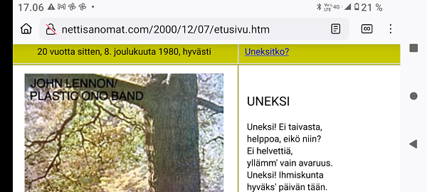 20 vuotta sitten, 8. joulukuuta 1980, hyvästi. "Uneksi! Ei taivasta, helppoa, eikö niin? Ei helvettiä, yllämm' vain avaruus. Uneksi! Ihmiskunta hyväks' päivän tään. Lue! Sorvola. Kaupunkilaispoika hiihtolomalla 1957 Sorvolan talossa. Lieto, Yliskulma. Kuvat: Pertti Manninen. Kuvatekstit alkuperäisestä negatiivikirjasta. Vain yksi filmirulla oli mukana. Kuvat Suomalainen sosialisointi Jyväskylässä. Kaavaryöstö etenee. Raportti Itsenäisyyspäivän aattona 2002. Lue! Linnan juhlat 06.12.2003. Kuudettakymmentä käyvä ukkomies kolmikymppisen neitosen kimpussa! Nykyaikaista mediamenoa iltapäivälehtien etu- ja takapuolesta niiden kertoessa ukkomiehen onnesta. Alaston raportti. Sunnuntaina 26. joulukuuta 2004, tapaninpäivänä, kello 08.55 Suomen aikaa avasin television, joka oli jäänyt edellisenä iltana Ruotsin kanavalle. Ruudussa oli tekstiuutisia, joista kävi ilmi, että valtava hyökyaalto on iskenyt Intian valtameren rannikoille. Käänsin ohjelman BBC.News-kanavalle ja siellä oli jo kuvia ja selostusta tapahtuneesta. Kuva John Lennon Double Fantasy Yoko Ono. 08.12.2005 joulukuun torstaina klo 21.47. "Double Fantasy". Kuva ja rajaus Pertti Manninen SVT4:n kuvasta. Kuva Kuva. Helsinki kasvaa rajusti pohjoiseen pitkin Mannerheimintietä. Ruskeasuon bussivarikkoa on purettu ja tonttimaa odottaa täyttäjiään. Porakone rei'ittää kalliota Pasilan orren rakentamiseksi. Pyramiditalo on Pikku-Huopalahden portinvartija. Helsinki sunnuntaina 2006-11-26 aamulla hämärässä ennen yhdeksää. Pertti Manninen. Luistinrata harmaassa sateessa Helsingin rautatientorilla. Helsinki. Kansallisteatteri (Aleksis Kiven patsaan takana), asuintalo (Pepsi), Hotelli (entinen SOK:n pääkonttori), Casino, Fennia, liiketalo (Finnkino, Suomi-yhtiöt, aikoinaan Nokia Oy.n pääkonttori). Kuva viime lauantaina 2007-12-08 klo 12.50 bussin 75 sateen piiskaamasta ikkunasta matkalla Malmille. Pertti Manninen. Kuva "Kerro minulle keitä kutsuit Nobel-juhlaan, niin minä kerron millainen olet." Julkisuudessa liikkuneiden tietojen mukaan tasavallan presidentti Tarja Halonen ei saanut kutsua, sensijaan pääministeri Matti Vanhanen ja ulkoministeri Alexander Stubb saivat. Muiden kutsuttujen ja kutsumattomien arvailemiseksi Nettisanomat on hiukan raapaissut arkistoaan. Lue! Rauhan Nobel-palkinto 2009. "För Alfred Nobel: skål!" (Käännös). SVT1. Torstaina 2009-12-10. Kuva: Pertti Manninen SVT1:n lähetyksestä torstaina 2009-12-19 klo 23:46 (Suomen aikaa). "Rasmus katselee lintuja ja välillä kirskuttaa". Kuva tiistaina 2010-12-07 klo 11.11. Pertti Manninen Veteraani Viljo Hutri: Meillä on nyt menossa hyvä aika. Tikkakoskelainen sotaveteraani Viljo Hutri, 90, ei epäröi, kun häneltä kysyy, mikä Suomessa on parasta. Itsenäisyyspäivänä 6. joulukuuta 2011 UUSI AALTO Keskisuomalaisen välissä. Julkaisijana Kokoomus. Gloria. Laulutuokio kauppakeskuksessa. Jyväskylä Forum. Perjantai 2012-12-07 19:26 - 20:01. Pimeydestä valoon - Gloria-kuorolaulu - "Oikeus olla tähti"- kehitysvammaisten seinäkalenterin talvikuvat - Kauppakassit - Iceland. Kuvat: Pertti Manninen. Video Gloria-laulusta (2:30). Kuvat! Iltalehti.fi lauantaina 2013-12-07: Hurjat kustannukset. ”Juttua muokattu: Mellakoitsijoita kuvaili rosvojoukoksi poliisipäällikkö Markku Luoma, ei ylikomisario Harri Nojonen kuten jutuussa aiemmin väitettiin”. Viikkosanomat joulukuu 8, 2013 Iltalehti kertoi seuraavana päivänä, että tamperelainen poliisipäälikkö luonnehti mielenosoitusjoukkoa rosvojengiksi tai rosvojoukoksi. Lehti joutui sitten oikaisemaan tietonsa, koska luonnehtija olikin poliisimestari tai päinvastoin. Uutiskuva tulossa loppuun. Tampere-talon väkeä hän ei luonnehtinut mitenkään, puhui ilmeisesti juhlijoista. Tietenkin hän puhui niinkuin oikeaksi koki. Tämä rosvojoukko piti ilmeisesti sitten juhlakansaa rosvojoukkona. Olihan se juuri viikolla päättänyt leikata vanhustenhoidosta 300 miljoonaa ja esittänyt muitakin köyhiin kohdistuvia leikkauksia, siis kipeimmin tuntuvia. Esimerkiksi jotain hammashoidon huonontamista, siis ei oikeutta päästä kunnalliseen hammashoitoon jne. Tänään muuten tuli aamulla radiosta tutkimustulos, jonka mukaan piilevät hammastulehdukset altistavat aivoverenvuodoille. Nämä rosvot saavat siis juhlia poliisipäällikön suojeluksessa. ... Lue! "Viimeinen kuva" eli selfie ellei peräti selfish! PS. Viimeinen kuva tarkoittaa tämän pokkari Ricoh PX:n simahtamista suolaisessa merivedessä, vaikka kamera myyntihetkellä olikin "waterproof". Kuvat Peuroja takapihalla. Kirkkonummi. Lapinkylä. Kuvat Juha Sipilä avasi jälleen omistuksiaan: ”Useilla suomalaisilla on rahasto-osuuksia, niin minullakin” Ilta-Sanomat. Julkaistu: 9.12. 22:00. Päätöntä menoa. Sdp:n Jutta Urpilainen vauhdittamassa kokoomuksen presidenttiehdokas Sauli Niinistön kampanja-avausta. joulukuu 8, 2017. Niin meni kanavatkin sekaisin, että Ylen illan uutislähetyksen kuviin jäi toisen kanavan tekstit. Kuvat puhukoot puolestaan Sdp:n entisen puheenjohtajan päättömästä touhusta. Viikkosanomat Pertti Manninen perjantaina 08.12.2017 klo 21:24. Kuvat Ministeri Anne Berner ei valvonut. Hurmahenkisyyttä tietojen luovuttamisessa. "Kokonaisarvion selitys". Katri Kulmuni facebookissa eilen ja tänään tiistaina 10.12.2019. 2020. Joulukuu. Sotalaivat kalastuksen tukena. ”Kallista kalastusta” sanoi ministeri jo edellisen konfliktin sattuessa. Viikkosanomat-blogi Joulukuu 13, 2020. Hallitus maskissa 2:ssa eri aitiossa eduskunnan kyselytunnilla torstaina 9.12.2021 puhemiehen molemmin puolin. Perhe- ja peruspalveluministeri Krista Kiuru, SDP vastaa puheenjohtaja Sari Essayahin, KD kysymykseen soteaikataulun realistisuudesta. Kuvat Kuusi kuvaa Kökkelissä. Rintamalle lähtöä odottaen. - Lähettipojan kuolema. - Sota on loppunut, rauha alkanut. Tuntematon sotilas. Edvin Laine 1955. Yle Teema keskiviikkona 6.12.2023. Kuvat Pertti Manninen. - Niil saa raappi syämisekki valmiiks. Kaikki saateri s