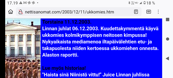 Viime aikoina. Marraskuun lopussa 2024. Lukijan kuva Perjantaina 22.11. "Menin siitä tänäänkin ohi, ei ollut ruuhkaa!" Lue! "... sitä ei kerrottu että samalla päivämäärällä kun Suomi liittyi Natoon suomesta tuli ydinasevaltio ..." Lue! B-52 voi kantaa yli 30 tonnin pommikuormaa. Kuva: Ilmavoimat. Lue! Pääkirjoitus puhe tekstiksi-ohjelmalla lauantaina 30.11.2024, ap 8:00- 8:12. Lue! Viime aikoina. Joulukuun alussa 2024. Kyllä itsenäisyyspäivää pitää juhlia ja kunnioittaa itsenäisyyspäivänä 6.12 eikä noin 6.12. Presidentti Stubb on nyt tehnyt päätöksen, että elossa oleville veteraaneille ja lotille järjestetään juhlat 4 päivää aikaisemmin 2.12.2024. Lue! Linnan koskettavat veteraanijuhlat. Näin presidentit kunnioittivat veteraaneja. Kuva Lapin kansa 2024 Lapin sota Teemalehti 50 vuotta Lapin sodasta 1955-1945 Syksyistä synkin. 214000 saksalaista sotilasta. 103900 evakkoa. 14900 tuhottua rakennusta. 4500 haavoittunutta suomalaista. 1300 kaatunutta suomalaista. 1000 kaatunutta saksalaista. 675 tuhottua siltaa. 7 kuukautta. Lue! ![]() Itsenäisyyspäivän lukupaketti! Kuva Itsenäisyyspäivän jättilehti. Kuva Presidentti Sauli Niinistön suuri unelma murskaksi. Lue! |