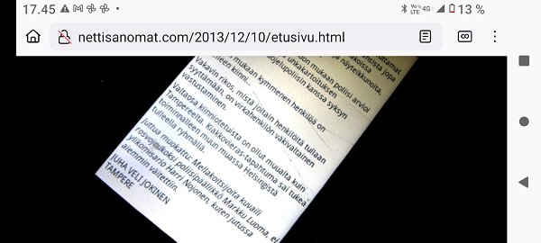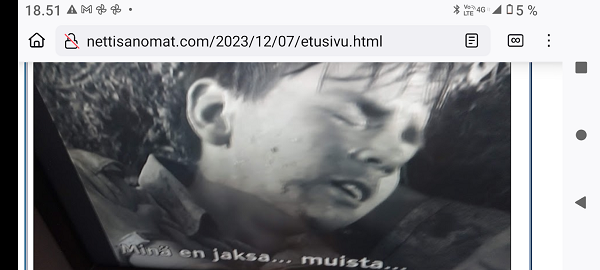 SANOMANETTI - N.o 2981 - Lauantaina 21.12.2024. - Kuvat. Punatulkku vielä marjoja pihlajastakin löytää Vilskettä ruokintapaikalla. Lauantai 21.12.2024 10;22 ja 10:27. Uusimaa. Kirkkonummi. Björkdal. Kuvat Pertti Manninen. --- SANOMANETTI - N.o 2980 - Perjantaina 20.12.2024.- Kuvat . Isäntä ja isännän varjo. "Rasmus on nousssut pöydälle auringon lämpöön, kun oikea isäntä yrittää hörppiä päiväkahviaan." Perjantai 20.12.2024 12:27. Uusimaa. Kirkkonummi. Björkdal. Kuvat Pertti Manninen. . - "Hullutus". Tähtien sota ei ole leikkiä, sota ei koskaan ole leikkiä, se on hullutus ... 14.12.1985. PUHEENVUORO KIRKKONUMMEN TALOUSARVIOKOKOUKSESSA LAUANTAINA JOULUKUUN 14. PÄIVÄNÄ 1985. Pertti Manninen. .--- SANOMANETTI - N.o 2979 - Tiistaina 17.12.2024. - "Uimahalli". 14.12.1985. Pertti Manninen. SKDL:n VALTUUSTORYHMÄN PUHEENVUORO KIRKKONUMMEN TALOUSARVIOKOKOUKSESSA LAUANTAINA JOULUKUUN 14. PÄIVÄNÄ 1985. - Jälkisanat 22 vuotta myöhemmin. Vappuna, Suomalaisen työn päivänä 2008-05-01. Pertti Manninen. - Kirkkaan päivän kuvia 10.12.2024 13:43 Uimahallin kahvilassa. - Kirkkonummen uimahalli on Kirkkonummella sijaitseva uimahalli, joka vihittiin käyttöön vuonna 2001. Wikipedia. --- SANOMANETTI - N.o 2978 - Maanantaina 16.12.2024. - Arkisto - 25 vuotta sitten 16.12.1999. Milloin tehdään viimeinen painokone? "Kokonaan ilman painettua tekstiä selviytyvä sukupolvi on jo lähellä ellei jo kasvamassa." Lue! - Milloin ihminen vapautuu rattaiden syövereistä? "Tällä menolla on siis vastattava: ei koskaan, mikä on kyllä hirveää." Lue! - Bergerac oikaisee: Hannes Kulvik operoi Jerseyn saarilla, ei Cayman-saarilla. Kuva: "Rahatukku vaihtaa omistajaa". Lue ainutlaatuinen kirje! Lue! - Lasten päivä 4.10.1999 Kuva - Tare on poissa. Kuva. -25 vuotta sitten 16.12.1999. --- SANOMANETTI - N.o 2977 - Sunnuntaina 15.12.2024. - Kuva. Tammen tikkaaja tuli taas 15.12.24. Pari päivää pikkutikka on taas käynyt tammea nakuttelemassa. Uusimaa. Kirkkonummi. Björkdal. Sunnuntai 15.12.2024 11:45. Pertti Manninen. - Murhia alkuillan aluksi ja iloksi! Tänään 17:30 Yle TV1 Murhia ja kantrimusiikkia ... MTV3 Murha Helsingörissä ... Kuva lauantaina 14.12.2024 17:46. Pertti Manninen.- Arkisto 2001. Ei mitään uutta auringon alla. 19.4.2001, siis jo 23 vuotta sitten: Kuolema keinutuolissa. Tappaako Raid? Näemmekö liikaa murhia, tappoja ja väkivaltaa kodeissamme? Tappamista iltojemme iloksi ja viihteeksi kaikilta kanavilta. Tavallinen television katsoja on voimaton kaikilta kanavilta tulevan tappamisen tulvassa. Nyt kun kuolemanrangaistuksen kannatus Suomessa on juuri julkaistun gallupin mukaan hämmästyttävän korkea, pitää kysyä, onko tällä tappamistulvalla vaikutusta jo aikuisiinkin katsojiin? Tulevaisuuden ja lapsiemme tähden kanavien pitäisi pohtia olemassaolonsa tarkoitusta. Pääkirjoitus. Pertti Manninen. 19.04.01. --- SANOMANETTI - N.o 2976 - Torstaina 12.12.2024. - Kaunialan sairaalassa vietettiin tänään viimeistä joulujuhlaa. MTV Uutiset torstaina 12.12.2024. Joulujuhlaperinne jo lähes 50 vuotta Kaunialan sairaalassa vietettiin tänään tunteikkaat viimeiset joulujuhlat. Sairaalan toiminta lakkaa alkuvuodesta kun hyvinvointialueet eivät enää tilaa sen sairaala ja kuntoutuspalveluita. Juhlia ehdittiin järjestää useina vuosikymmeninä. Porilaisten marssi soi Anu Korhonen: 1946 perustetun Kaunialan sairaalan joulujuhlaperinne on kestänyt jo lähes 50 vuotta. Tunnelma juhlassa oli jälleen käsin kosketeltava. Lucia-kulkue Yrjö Laurila: Herkkä ja lämminkin, sydämellinen omalla tavallaan ja Isänmaallinen ennen kaikkea, tuo mieleen kyllä elettyä 99 vuotta. Anu Korhonen: Haikean sävyn juhliin tuo se että joulujuhlat järjestettiin tänään viimeistä kertaa. Kaunialan sairaalan toiminta lakkaa kun hyvinvointialueet eivät enää tilaa sen sairaala- ja kuntoutuspalveluja. Kaunialassa on nyt 70 asukasta. Toiminta tulee jatkumaan ympärivuorokautisen ryhmän hoivakodissa, jossa on 24 asiakaspaikkaa. Välähdyksiä kuntotustoiminnasta Minna Lindfors, virikeohjaaja Kaunialan sairaala: Mulla on surku siitä että sotainvalidit, sotaveteraanit ja lotat joutuvat vaihtamaan kotia. Osa on sanonut että mieluummin he vaihtaisi sinne taivaan kotiin. Kutsuvieraat ruokapöydässä. Anu Korhonen: Tasavallan presidentti Alexander Stubb kiitti maamme kunniakansalaisia juhlapuheessaan. Alexander Stubb: Me suomalaiset olemme sitkeä, sisukas ja sivistynyt kansa. Te tiedätte tämä omakohtaisesti, nyt on meidän nuorempien polvien tehtävä huolehtia Suomen turvallisuudesta. Teemme tätä työtä joka päivä mielessämme teidän uhrauksenne. Lapset laulavat Santa Luciaa. Videon tekstin purkanut Pertti Manninen oikeenkuulemisvarauksin. - Presidentti Alexander Stubb ja puolustusministeri Antti Häkkänen veteraanien seurana kahvipöydän antimia nauttimassa. Kuva MTV Uutisten sivulta perjantaina 13.12.2024 09:28. - --- --- --- Lauantai 20.07.2024 - MUISTA LIIVIT! - Kesän hyvä teko: Opeta lapsi uimaan! --- Maanantai 15.07.2024 - Maailman menoa n. heinäkuun 15. 1999 - 2024 ---- Sunnuntai 14.07.2024 - Salamurhayritys. - --- Sunnuntai 07-07-2024 - Eino Leino 146-vuotta. - Eino Leinon palkinto runoilija Sirpa Kyyröselle. --- Sunnuntai 30.06.2024 -Pääkirjoitus. 2001 - 20 VUOTTA SITTEN: LASKU. ASIANAJOTOIMISTO PEKKA MONONEN KY Vantaa 31.5.2001. --- Torstai 09.05.2024. Helatorstai. - Kuva Kissa ahdingossa. --- SMILE from MODERN TIMES - "Förbjud atomvapnen". 1957 KUVA --- etusivu - Lauantai 21.12.2024 - Kuvasanomat - Sanomatori - Viikkosanomat - Härkää sarvista - 12.fi - N:o 2981. - Sivu 2024-12-21 , nettiin 2024-12-21 20:31, linkkejä 2024-12.21. "Haukkaavan logon" teki Jaikon kurssilla 1999 Mika. Ensimmäisen kerran logo oli lehdessä tortaina 30.9.1999. Pari vuoden jälkeen se korvautui steriilillä kirjainlogolla. Nyt se on taas mukana!