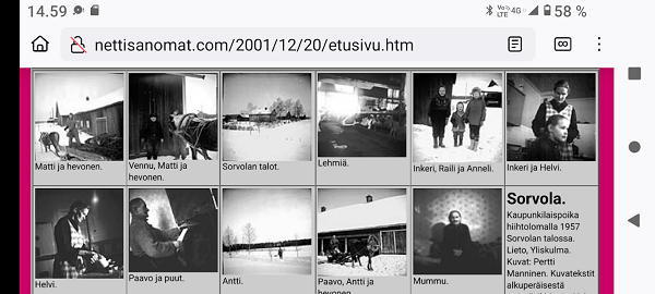 Joulupöytä on katettu. kuva: Laura Manninen, Iitti 1996. Kuva Sorvola. Kaupunkilaispoika hiihtolomalla 1957 Sorvolan talossa. Lieto, Yliskulma. Kuvat: Pertti Manninen. Kuvat Muistoja. "Tähtipojat". Vuonna 1958 koulun joulujuhlissa esiintyivät luokkatoverini Antero Siljola ja Seppo Kiviniemi sekä K.K. ja joku muu vanhan negatiivikirjan merkintöjen mukaan. Kuva Hyvää Joulua ja Onnellista Uutta Vuotta 2004! 10 kuvaa 3 perheestä 43 vuoden takaa Helsingin Kalliossa Jouluna 1957. Kuvat Sunnuntaina 26. joulukuuta 2004, tapaninpäivänä, kello 08.55 Suomen aikaa avasin television, joka oli jäänyt edellisenä iltana Ruotsin kanavalle. Ruudussa oli tekstiuutisia, joista kävi ilmi, että valtava hyökyaalto on iskenyt Intian valtameren rannikoille. Käänsin ohjelman BBC.News-kanavalle ja siellä oli jo kuvia ja selostusta tapahtuneesta. Suomessa asuva tyttäreni soitti muutamaa minuuttia myöhemmin ja kertoi, että poikani on soittanut hänelle Thaimaasta. Poikani ja hänen vaimonsa voivat hyvin, he ovat olleet tapahtuman aikaa sisämaassa. Lisäksi tyttäreni kertoi, että puhelusta kävi ilmi rannoilla olevan paljon ruumiita pitkin ja poikin. Samassa BBC News lähettää kuvia Phuketista ja lopetamme puhelun ja ryhdymme katsomaan tahoillamme suoraa raporttia paikasta, jossa siis poikani majailee. Pertti Manninen. Tuuli käy heidän ylitseen. Kuva: Pertti Manninen. Kuva 21.12.2005 joulukuun keskiviikkona klo 11.28. Kuva. "Kuu keskellä kirkasta päivää eli talvipäivän seisaus: tästä päivä pitenee". Pertti Manninen. Sarjasta "Taivaan alla", tulossa. Kuva Kuva. 24.12.2005 klo 13.12. "Kaupunkikuusi Jalavatiellä jouluaattona". Pertti Manninen. Helsinki. Linja 10. Kuva. Kuvia. Hetkiä Helsingissä jouluaattona 2005. Kuvat Melkein valkea joulu. Lunta on satanut sentin ja pikkupakkanen on valkaissut puut. Kuva eilen aatonaattona sunnuntaina 2007-12-23 klo 13.40. Keski-Suomi. Laukaa. Vuojärvi. Pertti Manninen. Kuva Kuvia tiistaina 2008-12-23 läheltä ja kauempaa. Laukaa. Peurunka. Kuvat: Pertti Manninen klo 17:55 - 20:25 Laukaasta 20:45-20:57 maailmalta SVT1-kanavalta. Kuvat Rälläkkä eli Pelastusarmeijan joulupata - Kissa ihmettelee lunta - Joulupukki kylän raitilla eli Rami K. matkalla tupiin. Näillä kuvilla Nettisanomat toivottaa lukijoilleen hyvää joulua ja onnellista uutta vuotta. Joulun rauhankin kuvista voi löytää, jos haluaa ne sillä tavalla nähdä. Pertti Manninen. päätoimittaja. Kuvat Joulurauhaa toivottaa Vaihmalan Hovi Hotelli-ravintola Vaihmalan Hovi Vaihmalantie 144, 37500 Lempäälä Kuva "Joulukiireet". Keski-Suomi. Jyväskylän seutu. Laukaa. Pelloskuja. Torstai 2011-12-22 klo 11:45. Pari astetta plussan puolella vuoden pimeimpänä päivänä. Mobikuva: Pertti Manninen. Kuvat Nettisanomat ja Sanomanetti sekä kumppanit toivottavat lukijoilleen rauhallista joulua! 95066. "Kauppakadun tähti". Jyväskylä. Sunnuntai 2012-12-23 17:11. Kuva: Pertti Manninen. Kuvat! Joulukuu 2013. "Unelma valkeasta joulusta" - "Ja aamulla ..." "Valoa jouluyössä" "Parasta joulupöydässä" Kuvat jouluaattona keskiviikkona 24.12.2014 klo 12:07 - 14:43 - 23:01. Pertti Manninen. Kuvat