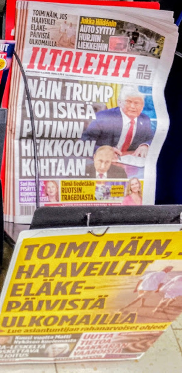 Sanomanetti nro 3013 - Perjantai 14.02.2025. - KUVAT. Avajaiset Lidlissä. Torstaina 13.2.2025 Kirkkonummen Lidl muutti jonkun sata metriä lähemmäksi valtatietä ja saman verran kauemmaksi asutuksesta. Vielä matka taittuu hyvin kävellenkin ja autotkin mahtuivat parkkiin, kun viereisen pari viikkoa sitten avatun Puuilon paikatkin olivat käytettävissä. Aurinkokin pilkahti hetkeksi jäätyneestä "joesta" heijastuen. Käyttötavaratkin tarttuivat matkaan ... ... niinkuin kahvipaketitkin ja pullat ja muut. Paulig Juhla Mokka 4 x 7,99 31.96, 2 kpl 7 eurolla -17,96. Uusimaa. Kirkkonummi. Munkinmäki. Torstai 13.2.2025 11:05- 11:28. Kuvat Pertti Manninen. - Alkukuun luettelo 3.2-14.2.2025. ----- Sanomanetti nro 3012 - Torstai 13.02.2025 - LÄHI-ITÄ yle uutiset Yle.fi - Powell: Yhdysvaltain keskuspankilla ei ole kiire laskea ohjauskorkoaan. - Stubb ja Valtonen lähtevät Müchenin turvallisuuskonferenssiin. - Orpo ei. - Myös Israel varoittaa aselevon mahdollisesta raukeamisesta. - Donald Trump Yhdysvaltain presidentti. - Ja jos heitä ei palauteta, kaikkia heitä, ei tipoittain yksi, kaksi kolme tai neljä kerrallaan... - Zelenskyi: Eurooppa ei pysty turvaamaan Ukrainaa ilman Yhdysvaltoja. - Kiina on valmis jakamaan tekoälysaavutuksiaan, sanoo maan varapääministeri. - Venäjä: Sukeltajat eivät havainneet öljyvuotoa Koala-tankkerissa. - Sanoisin, että heidät pitää vapauttaa lauantaihin klo 12 mennessä. Lauantaina kello 12. Sen jälkeen sanoisin, että helvetti pääsee irti. - Jomaa Abu Kosh Rafah Gaza - Mikä helvetti. Pahempi kuin, mitä meillä jo on? Pahempi kuin tappaminen ja tuho, kaikki rikokset ihmisyyttä vastaan, joita - Tukholmassa junaliikenne pysähtyi laajan sähkövian vuoksi. - Gazan kaistalla on tehty? Missään muualla maailmassa ei ole sellaista. - Vanhojen asuntojen kauppa piristyi. - yle uutiset Yle.fi Yle Areenasta keskiviikkona 12.2.2025 8:14 alkaen Yle TV1:n tiistain 11.2,2025 20:30 uutislähetyksestä. Kuvat Pertti Manninen. ----- Sanomanetti nro 3011 - Maanantai 10.02.2025 - Arkisto. 20 vuotta sitten 10.2.2005. - Torstaina 10.02.2005. Kontrasteja. Pääkirjoitus. Kontrasteja ulkona ja sisällä. Ihmismielessä ja fyysisessä todellisuudessa. Elämän raadollisuudessa. ... Kuva Suomesta pakkaspäivänä auringon lämmittäessä lauantaina 29.01.2005. Pertti Manninen. - "Terveisiä Tukholmasta." Aftonbladet-lehteä selaillen. Kuvat. - Maanantai 10.2.2025 - Det är dags för Tv-nytt, god kväll. Thomas von Bogulawski Yle Pekka Lundmark lämnar Nokia, där han varit vd sedan 2020. Hotard har över 25 års erfarenhet av ledande roller i teknologibolag. Just nu leder han AI- och datacenter- verksamheten Pekka Lundmark fortsätter vid Nokia som Hotards rådgivare till årets slut. Timing är aldrig perfekt, det som är positivt för Nokia är att marknaden har börjat återhämta sig. Pekka Lundmark lämnar Nokia amerikan ny vd Pekka Lundmark avgående vd, Nokia 13 kuvaa Yle tv nytt 1.2.2025 17:56. Foto Pertti Manninen. - Aekisto. Maanantai 31.10.2022 Pääkirjoitus: Pekka, syntipukki. Hullunkurinen vastuunkantaja Fortumin entinen toimitusjohtaja Pekka Lundmark. LINKKI. ----- SANOMANETTI - Sanomanetti nro 3010 - Torstai 06.02.2025 - 3010. numero! - Saamelaisten kansallispäivä 6.2. - Arkisto 11.2.2012. Miksi olette niin hienoina tänään? - Nyt on saamelaisten syntymäpäivä. - Kuva 6.2.2025. Uusimaa. Kirkkonummi. Uimahalli ja Jokiniemen koulu. Torstaina 6.2.2025 13:14. Pertti Manninen. - Juttu 25.4.2023. "Liputus on arvokas tapa osoittaa kunnioitusta historiaa ja kulttuuria sekä sen monimuotoisuutta kohtaan." Kemin kaupunginhallitus päätti maanantaina, että kaupungin 15 vuotta vanhat liputusohjeet päivitetään. https://yle.fi/a/74-20028858 - "ENSISIJAINEN ISKUJEN KOHDE!" - ---- SANOMANETTI - Sanomanetti nro 3009 - Keskiviikko 05.02.2025 - J.L. Runeberg 221. Tänään liputetaan J. L. Runebergin kunniaksi. Uusimaa. Kirkkonummi. Uimahalli. Keskiviikko 5.2.2025 12:52. Pertti Manninen. Laajenna! 42 WIBRA - Ruotsi shokissa Ilta-Sanomat Selitys Trumpin yllättäville päätöksille Näin löydät kaupasta halpaa ruokaa Iltalehti Näin Trump voi iskeä Putinin heikkoon kohtaan Toimi näin, jos haaveilet eläkepäivistä ulkomailla. Uusimaa. Kirkkonummi. Lidl. Keskiviikko 5.2.2025 13:14. Pertti Manninen. Paloitteluun! - Uniapnea - mikä se on? Terveydenedistäjä Päivi Ronkainen. Uusimaa. Kirkkonummi. Kirkkonummen-Siuntion sydänyhdistys ry. Keskustan kerho. Blomma. Juhlatila. Luostarinportti 2. Keskiviikko 5.2.2025 14:30. Pertti Manninen. .- Palanen kuvasta: E. J. LÖFGREN.: JOHAN LUDVIG RUNEBERG. Öljymaalaus 1861. Helsingin Yliopisto. Lue! ----- SANOMANETTI - Sanomanetti nro 3006 - Maanantai 27.01.2025. - Tänään on kulunut päivälleen tasan 80 vuotta, kun Neuvostoliiton puna-armeija vapautti ja avasi Auschwitzin keskitysleirin. - Arkisto, Nettisanomat 20 vuotta sitten 27.1.2005. - 27.01-päivälle on annettu nimeksi vainottujen päivä, kaikkien vainottujen ja tapettujen muistolle. Emme saa unohtaa yhtäkään, emme saa hyväksyä tappamista. - Ihmiskunnan vastuu. nettisanomat.com 06.09.01. - chaplinpuhediktaattori.htm - Kuva: Hannah kuuntelee Hynkelin puhetta. .----- SANOMANETTI - Sanomanetti nro 3005 - --- --- --- ---- SMILE from MODERN TIMES - --- etusivu - Perjantai 14.2.2025 - Kuvasanomat - Sanomatori - Viikkosanomat - Härkää sarvista - 12.fi - N:o 3013. - Sivu 2025-02-14 ja 2025-02-15, nettiin 2025-02-15 15:39, linkkejä 2025-02-15. "Haukkaavan logon" teki Jaikon kurssilla 1999 Mika. Ensimmäisen kerran logo oli lehdessä tortaina 30.9.1999. Pari vuoden jälkeen se korvautui steriilillä kirjainlogolla. Nyt se on taas mukana!