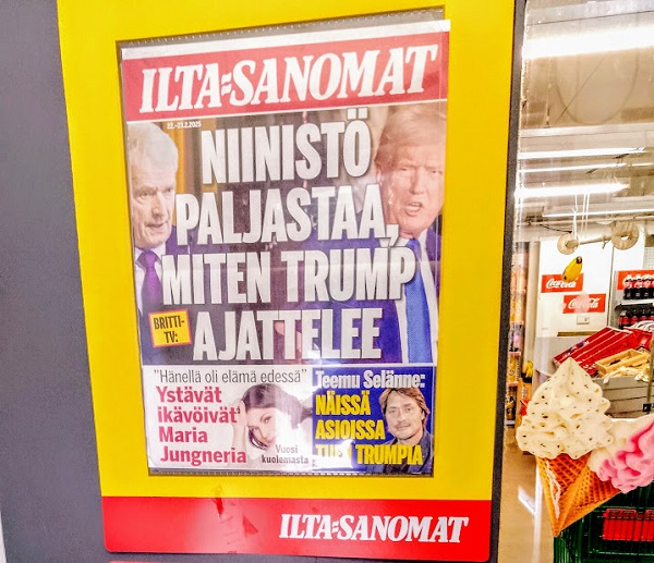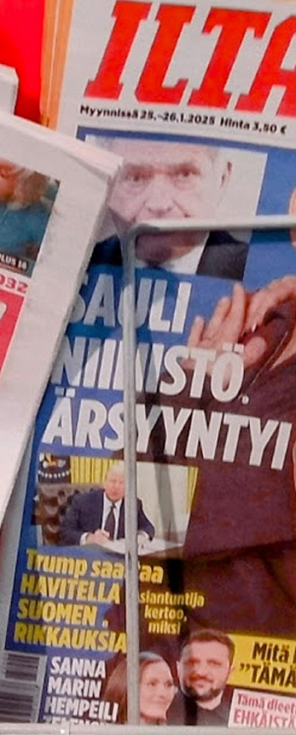 | Sauli Niinistö psykologina. Helmikuussa 2025. Ilta-Sanomat 22.-23.2.2025. Niinistö paljastaa miten Trump ajattelee.Uusimaa. Kirkkonummi. Lapinkylän kyläkauppa. Sunnuntai 23.2.2025 14:52. Kuva Pertti Manninen. |