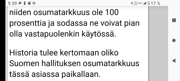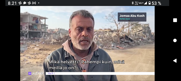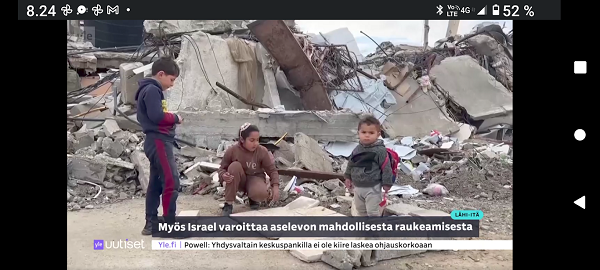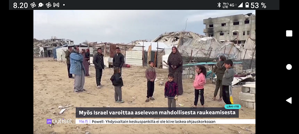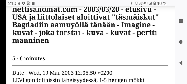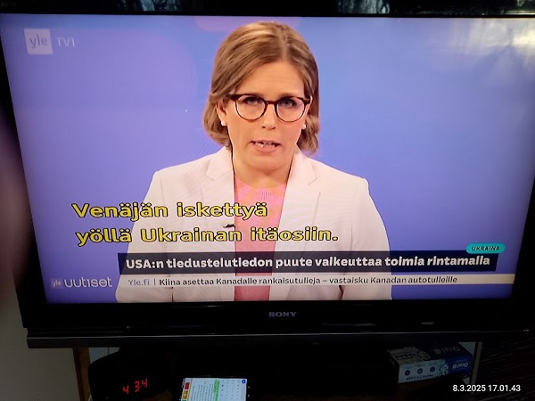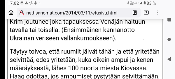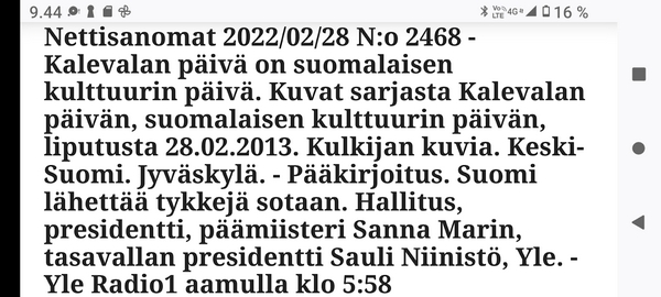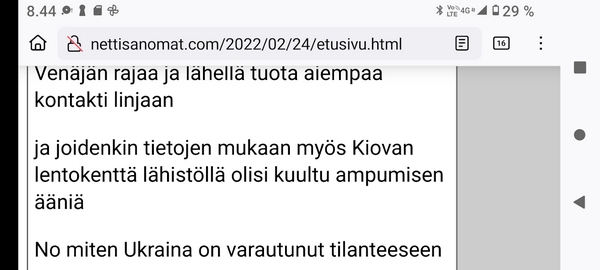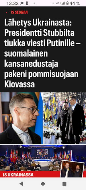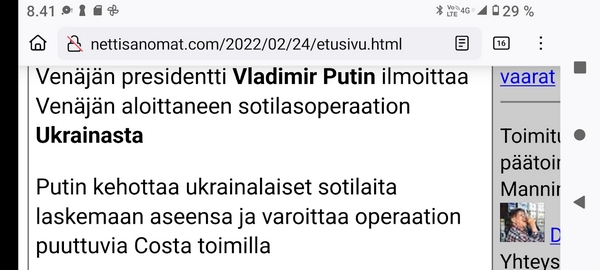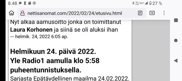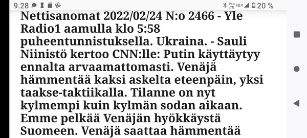24.2.2022. Torstai N:o 2466 Edellinen - Seuraava Muista rokotus! Torstai 2022-02-24 22 vuotta sitten. Tsetsenia: Äidit hakevat varusmiespoikiaan pois sodasta. Arkisto 29.10.1999. Lue! Helmikuun 24. päivä 2022. Yle Radio1 aamulla klo 5:58 puheentunnistuksella. Tässä Radio 1 ja Maaria Holma Huomenta että on torstai 24 helmikuuta Viron itsenäisyyspäivä Matti Matias Matias ja maksa ja ortodoksisen kalenterin mukaan Johannes Juhani Juha Juho Jouni Jussi ja Jukka Onnea kaikille merkkipäivän viettäjille aurinko nousee Helsingissä 734 Oulussa 747 08.02 ja aurinko laskee Helsingissä 1734 Oulu 1717 Utsjoella 16.50 Kello on kohta 6 uutiset ja sitten jatketaan aamu soitetaan ensin aikamerkki --- helmik. 24, 2022 5:58 ap. Tässä Yle Uutiset kello kuusi uutiset toimittaja Pietu Heiskanen Hyvää huomenta Venäjän presidentti Vladimir Putin ilmoittaa Venäjän aloittaneen sotilasoperaation Ukrainasta Putin kehottaa ukrainalaiset sotilaita laskemaan aseensa ja varoittaa operaation puuttuvia Costa toimilla Putin ilmoitti asiasta puheessa joka esitettiin samaan aikaan kun YK turvallisuusneuvosto on pitänyt omaa hätäkokous on Ukrainan tilanteesta Itä Ukrainan separatistit pyysivät apua Venäjältä Yhdysvaltojen mukaan esitetty avunpyyntöön esimerkki yrityksestä lavastaa tekosyy joka oikeuttaisi Venäjän sota toinen Ukrainassa livistää raportoi kirjeenvaihtajamme Suvi Turtiainen Mikä tilanne on tällä hetkellä Nokia näyttää siltä että Venäjän välinen Putin on tämä hyökkäyksessä Ukrainaan vastaan taloissa on aloittamassa uuden sodan Euroopassa tässä vaiheessa räjähdyksen ääni ja on raportoitu eri puolilla ukrainaa pääosin itäisessä osassa ukrainaa Silminnäkijä kertoo serimedia lähteelle että kaukaisia räjähdyksen ääniä on kuultu myös pääkaupungissa Kiovassa ja Vaikuttaa siltä että reunuksia on kuultu myös harkovan lähistöllä ja Harkova on Ukrainan joukkue polkupyörän hallussa vaikka Harkova sijaitseekin tuolla Ukraina koodit rajan tuntumassa lähellä Venäjän rajaa ja lähellä tuota aiempaa kontakti linjaan ja joidenkin tietojen mukaan myös Kiovan lentokenttä lähistöllä olisi kuultu ampumisen ääniä No miten Ukraina on varautunut tilanteeseen tapahtui selvä muutos ihan nytten oikeastaan vuorokaudesta tiistai-iltana presidentti zelensky kutsui reserviläisiä palvelukseen kutsui Koskinen vaiheessa 250 000 reserviläistä ja eilen tehtiin monia liikkeitä sen että Ukraina Ukraina alettiin valmistelemaan sotaa varten tänne tuli voimaan nytten viime yönä puoliltaöin poikkeustila lisäksi Ukraina parlamentissa alkoi edistyä laki joka liittyy hidden oikeuteen kantaa asentaa ja käyttää asetta itsepuolustukseen ja täällä villissä myös kuulin eilen illalla myöhään että ihmisiä pyydetään nyt luovuttamaan verta elikkä selvästikin tämä käänne osattiin nähdä koska valmistautuminen tapahtui aivan selvästi alettiin valmistautua selvästi aiempaa jämäkämmin nytten ihan ihan --- helmik. 24, 2022 5:59 - 6:03 ap. On kuultu räjähdyksiä kertovat muun muassa uutistoimisto AP ja Britannian yleisradioyhtiö BBC räjähdyksistä on tullut raportteja myös muualta maasta biisin mukaan sosiaalisessa mediassa on kerrottu räjähdyksistä mun mustasukkainen puoliso sijaitsevasta maan toiseksi suurimmassa kaupungissa harkovassa ja maan eteläosassa vuodesta että Yhdysvallat liittolaisineen vastaamaan Venäjä toimii yhtenäisesti ja päättäväisesti venäja on yksin vastuussa ihmistä kuulemista ja kärsimyksestä Hän totesi vain aikoo pitää myöhemmin tänään puheen jossa kertoo Venäjälle hyökkäyksestä koituvista seurauksista Marine oli eilen valmis keskustelemaan puolustusmateriaalin toimittamisesta ukrainalle hallitusohjelman mukaan Suomi ei ja asennusta tai muuta puolusti materiaalia konfliktialueelle mutta Marine mukaan tilanne on Ukrainan kohdalla erilainen --- helmik. 24, 2022 6:03 - 6:04 ap. Anime kansainvälisenä yhteistyönä Tuominen ja mä hyvin erilainen tilanne ja uhka on todella se että venäläiset laajentaa Aggressio kanta yökkää sotilaallisesti Ukraina ei tässä tilanteessa Ilman muuta meidän pitää yhdessä osoittaa tukea Ukrainan pääministeri Sanna Marin vuorokauden aikana iPhone 11 Laukaa sekä tuulista lämpötila on ollut neljästä pohjoisen miinus 10 pakkasasteeseen Osaan suomea on annettu tuulivaroitus maan länsiosassa jalkakäytävät on ovat Keski päivästä alkaen erittäin liukkaita --- helmik. 24, 2022 6:04 ap. Nyt alkaa aamusoitto jonka on toimittanut Laura Korhonen ja siinä se oli aluksi ihan --- helmik. 24, 2022 6:05 ap. Helmikuun 24. päivä 2022. Yle Radio1 aamulla klo 5:58 puheentunnistuksella. Sarjasta Epätäydellinen maailma 24.02.2022. Sivun otsikko ![]() Nettisanomat 2022/02/24 N:o 2466 - Yle Radio1 aamulla klo 5:58 puheentunnistuksella. Ukraina. - Sauli Niinistö kertoo CNN:lle: Putin käyttäytyy ennalta arvaamattomasti. Venäjä hämmentää kaksi askelta eteenpäin, yksi taakse-taktiikalla. Tilanne on nyt kylmempi kuin kylmän sodan aikaan. Emme pelkää Venäjän hyökkäystä Suomeen. Venäjä saattaa hämmentää tahallisesti. yle, Iltalehti, Uusi Suomi. Linkki 29.9.1999 Kysymys nuorelle sotilaalle: Ajankohtainen kakkonen Ylen TV2 tiistaina 26.10.1999 YK:n rauhanviikolla. Linkki 30.9.1999 Aikamme ilmiöitä. Mitä isot edellä, sitä pienet perässä: Nato näytti mallia Venäjälle. Vain yksi ero: Natolla oli Serbiassa ultrauusimmat täsmäaseet ja Venäjällä on Tshetsheniassa patavanhat räiskepyssyt. Siviileihin osuminen on varmaakin varmempaa. Maailman Valuuttarahasto senkun lähettää lisää rahaa Venäjälle! Nettisanomat torstaina syyskuun 30. päivänä 1999 http://www.nettisanomat.com/1999/09/30/n999etusivu.htm http://www.nettisanomat.com/1999/09/30/n999etusivu.htm 24.2.2022. Torstai