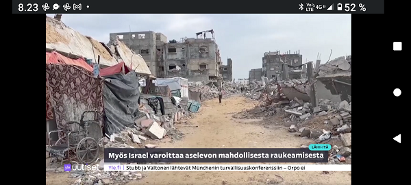 Helmikuun 27. päivä 2022. Suomi tarvitsee Saksan kannan kertoakseen Virolle, voiko Viro antaa suomalaisten Viroon myymät tykit Ukrainalle. Ylen tietojen mukaan Suomelle on vahvistettu, että Saksan ratkaisu on myönteinen. Saksan kanta ei ole vielä virallisesti saapunut Suomelle. Ulkoministeriö antoi aiemmin lausunnon, että sillä ei ole mitään tykkien luovutusta vastaan. Ylen tietojen mukaan puolustusministeriö on samalla kannalla. Tämä tarkoittaa, että puolustusministeriö tulee tekemään myönteisen päätöksen Viron vientiluvasta, Ylelle kerrotaan." Pääkirjoitus. Olisi lupa vaikka Paavilta, niin Suomen hallitus pääministeri Marinin johdolla ja tasavallan presidentti Sauli Niiistö siis katsovat sopivaksi lähettää Suomen päätösvallassa olevia aseita sotatoimialueelle. Maailma on raaka. Tappaminen kuitenkaan lopu tappamalla ja näillä Niinistön ja Marinin lähettämillä aseilla sitten tapetaan venäläisiä sotilaita ja varmaan myös ukrainalaisiakin ja siviiliväestöä. Ei niiden osumatarkkuus ole 100 prosenttia ja sodassa ne voivat pian olla vastapuolenkin käytössä. Historia tulee kertomaan oliko Suomen hallituksen osumatarkkuus tässä asiassa paikallaan. Pääkirjoitus. Pertti Manninen sunnuntaina 27.2.2022 11:39. Lainaus ja kuva Ylen artikkelista: Venäjän hyökkäys |