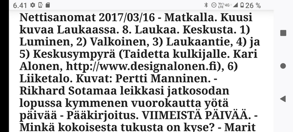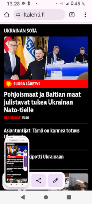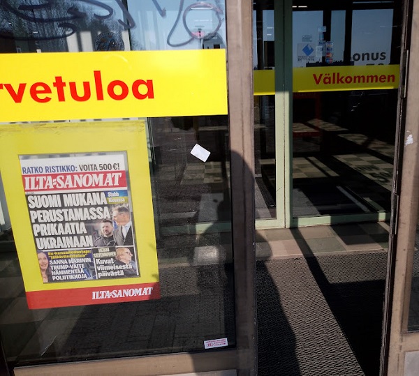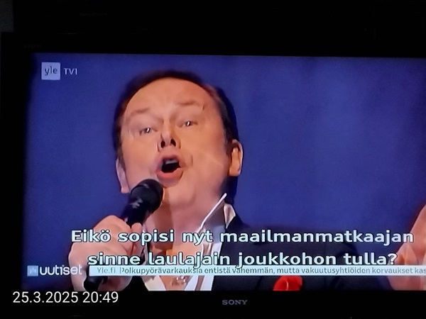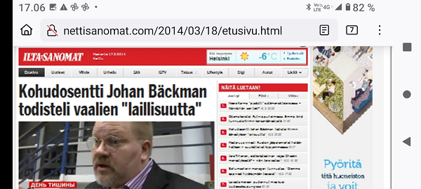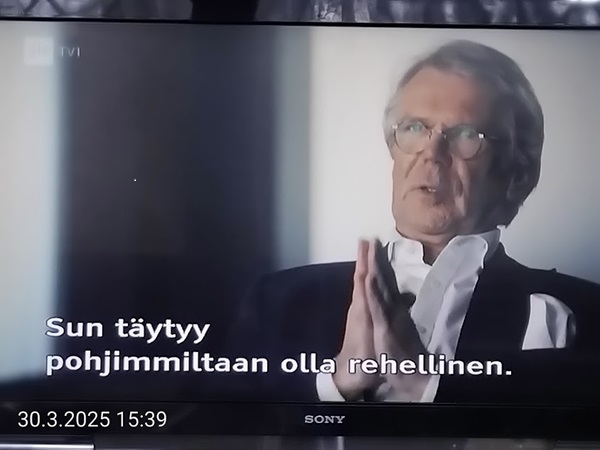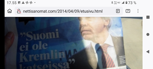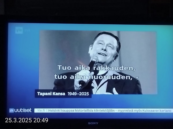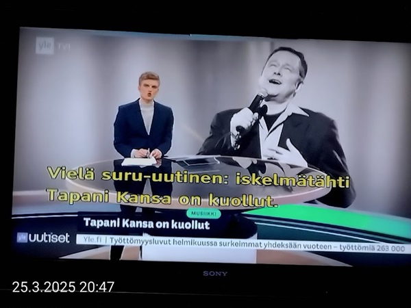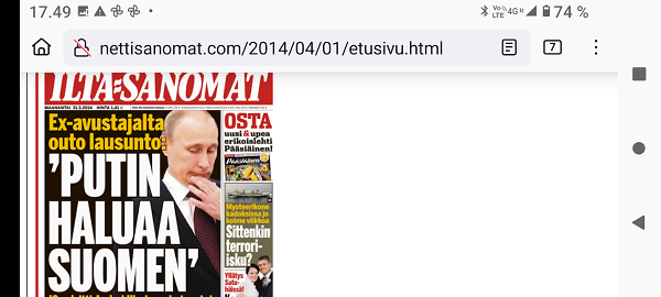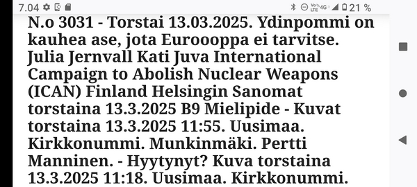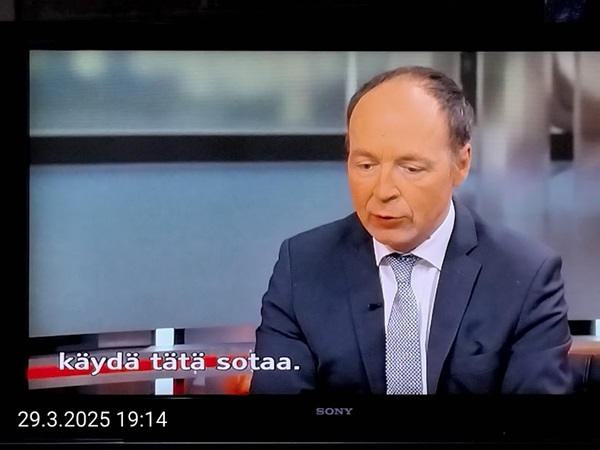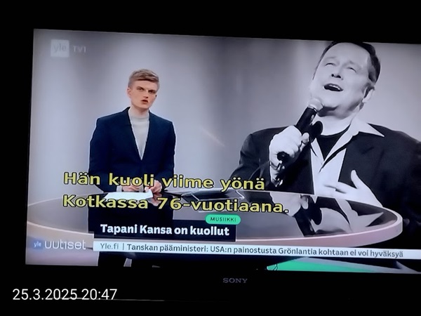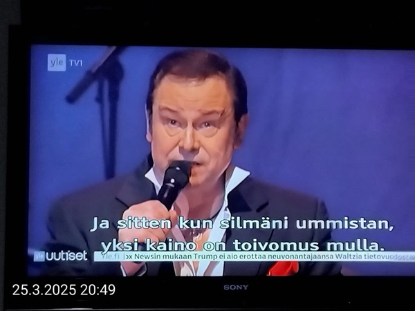 Sanomanetti nro 3041 - Keskiviikko 02.04.2025 - Kuuma päivä. Keskiviikko 2.4.2025. - 10:55. Rasmus-kissa viihtyy aurinkoisessa häkissään. 11:12. Keltaiset puskevat ruskean läpi. 12:55. Vauhtia ja kuntoa! 13:14. Presidentti soittaa pian toiselle presidentille saatuaan luvan kolmannelta presidentiltä. 14:07. Mittari ei valehtele, 24 astetta! (Mantan MAINIOT Ristikot MAINION MUHKEA! JA KEITTIÖ | KYLPYHUONE KOTI FALO KOTIMAINEN ASSEM KLASSINEN KAUSIOPAS 2025 KKPUSLIIGA + PUKKI PALASI KOTIN HJK:n supertäh 6 MUKANA NA Lääkäri: MONI USKOA HELPPO KEINO BOLE KOHENTAA UNTA IN UUTISMEDIA ILTA-SANOMAT OSTA uusi Tv-lehti Kreml: PUTIN HALUAA PALAUTTAA SUHTEET SUOMEEN Osta uusi Tv-lehti! IS:n vaalitentti RAJUJA YHTEEN-OTTOJA Alue-ja kunta-vaalit NAMA EHDOKKAAT ON TUOMITTU RIKOKSESTA ►Tarkista oman Iltalehden jättiselvitys ehdokkaasi tilanne ILTALEHTI PUTINILTA YLLÄTTAVA LINJAUS SUOMESTA Näin kommento Janne Ahonen: Professori: TATA ROLF NAIN SUOMIS ILTA-SANOMAT KREML: PUTIN HALUAA PALAUTTAA SUHTEET SUOMEEN PUHAKAN VANHEMMILLA YKSI TOIVE NORDMOLLE Janne Ahonen: ERO! Selska Voita 1000€ 5e Isoäidin Sanahaut 68 sivua Helpot ja hauskat! PALKINNOT INTERNS YLI 650 EUROA! DAI 52 BIGTINOT & SUDOKUT @Ristikot 3/200 Voit kans ristik Volta 400 MN S Y MUKANA MYÖS RISTINNT & SUDOKUT 15 ANNIINA VALTONEN v Lähtöpasie Ylen suosikki-ohjelmasta KUNINGATAR ENA Sarja ilahduttaa kuninkaallis-Janeja Harjaa tähdittava Iltalehden jättiselvitys Nämä ehdokkaat ON TUOMITTU RIKOKSESTA Tarkista oman ehdokkaasi tilanne ALUE- JA KUNTAVAALIT Yleinen Tuore tutkimus Tarja Halonen, 81, kertoo sydänvika VOI OLLA LUULTUA VAARALLISEMPI ILTALENTI. TÄLLAINEN ISOÄITI OLEN MUISTA MYÖS Viva SANOMAT UT 2.4.2025 13:14. (Teksti kuvasta-ohjelmalla!) Uusimaa. Kirkkonummi. Björkdal - Lapinkyläntie - Veikkola - Björkdal. Kuvat Pertti Manninen. ----- Sanomanetti nro 3040 - Tiistai 01.04.2025 - Aprillia! 1.4.2025. - Kuva. Uusimaa. Kirkkonummi. Keskusta. Tori. Kirjastotalo Fyyri vasemmalla ja kellotapuli ja kivikirkko ylhäällä. Tiistai 1.4.2025 10:19. Kuva Pertti Manninen. keskelle. KIRKKONUMMI KUNTAVAALIEHDOKKAAT Keskustan kuntavaaliehdokkoat Kilkonummella HUOLETONTA ARKEA KAIKILLE, EI HARVOILLE Kuntavaalit Kikkonummi Kommunavalet i Kyrkslätt ÄÄNESTÁ SUOMI TERVEEKS SDP Kaiken voi tehdä reilummin. ARKI RATKAISEE 112 113 SUVI 94 95 96 97 98 ANNA RIKU CALJANDER SEA 99 100 101 102 103 114 115 MINNA 116 JOHANNA 120 121 122 123 124 SAARA RAIJA MIISA SANNI JAPPINEN 128 129 MILA KANTINKOSKI KARKINEN RONJA 130 131 SANTERI KONTINEN SOILE KORTESALMI MER 104 105 106 107 108 136 137 138 LOKSTROM PAULA OITTINEN 109 110 111 Keskusta BEERSPREVARDAG FÖR ALLA, INTE FÖR DEFA A NORRY FREELIFE FOR ALL, NOT FOR THE FEN V vasemmisto vänstern Mer rättvisa i allt. K 1.4.2025 10:19 يو 13 139 MAAR ARIT ORKO 145 PEKKA TANEN HANNE 146 147 KARI HENRY (Teksti kuvasta-ohjelmalla!) ----- Sanomanetti nro 3039 - Maanantai 31.03.2025 - Finanssigangsteri ja veropakolainen Björn Wahlroos 2025. "Sun täytyy pohjimmiltaan olla rehellinen." Yle. Raha-Suomi sunnuntaina 30.3.2025 15:39. Kuva Pertti Manninen. - Arkisto 8.5.2008. Kuvat - "Lokki" 2008. "Sirkka Hämäläinen". 1992. "Pupu". 2008. "Nalle Björn Wahlroos". 1992 - Arkisto.2008. Pääkirjoitus. Mistä ahneus alkoi? Suomen Pankin pääjohtaja Sirkka Hämäläinen, Veronmaksajien pelastaman pankin johtaja Björn Wahlroos. - Legenda: "Jos sä olet niin helvetin fiksu, niin miksi sä olet niin helvetin köyhä." Henrik Kuningas. -Suomen taloushistorian kavalin ja peitellyin pelastusoperaatio, Suomen Yhdyspankin omaisuuden siirtäminen turvaan. Aivoina Björn Wahlroos ja Ahti Hirvonen.- Alho- Sundqvist II: Ministeri Tuomioja armahti ex-ministeri Suomisen pääministeri Lipposen ja ministeri Niinistön hymistessä taustalla.- Kauppa- ja teollisuusministeriön kansliapäällikkönä oli tapahtumahetkellä Bror Wahlroos ja Suomen Yhdyspankin eräänä johtajana hänen poikansa Björn Wahlroos. - -Aho - anteeksiantamaton amatööri? "Hallitus, jossa Esko Aho oli pääministeri hoiti pankkien omistajien asiat hyvin ja pankkien asiakkaiden, tavallisten suomalaisten asiat hyvin huonosti ja epäoikeudenmukaisesti. - Jukka Kilpi. Etiikka puoltaa vapautusta ylivoimaisista veloista. Linkki. - Pankkikuvat Timo Erkki-Heinon ohjelmasta "Pankkiryöstö" vuodelta 1992. - Seppo Konttinen Ylen Talousarvio-lähetyksessä perjantaina 14.05.2004. Ohjelman nimi oli Pankkivangit. ----- Sanomanetti nro 3038 - Lauantai 29.03.2025 - Kuvasarja. Rauhankyyhkyt vs. Sotahaukka. ... että venäläiset näkevät, että voimme jatkaa tukea loputtomiin. Jussi Halla-Aho. Kuvasarja Uusimaa. Kirkkonummi. Björkdal. Perjantai 28.3.2025 14:46. Kuva: Pertti Manninen. mtv3. Uutisextra. Lauantai 29.3.2025 19:14. Kuva: Pertti Manninen. ----- Sanomanetti nro 3037 - Torstai 27.03.2025. - Kuva. Viimeiset pallot. Uusimaa. Kirkkonummi. Björkdal. Torstai 27.3.2025 6:30. Kuva: Pertti Manninen. ----- Sanomanetti nro 3036 - Tiistai 25.03.2025. - Kuvat. - Mustat linnut. Vielä suru-uutinen: iskelmätähti Tapani Kansa on kuollut. Hän kuoli viime yönä Kotkassa 76-vuotiaana. Pitkän uran tehnyt laulaja oli yksi Suomen kirkkaimmista tähdistä. . Ja sitten kun silmäni ummistan, yksi kaino on toivomus mulla. Eikö sopisi nyt maailman- matkaajan sinne laulajain joukkohon tulla? Oi niitä aikoja, oi niitä aikoja, ne tahtoisin niin elää uudelleen. Tuo aika rakkauden, tuo aika nuoruuden, ne tahtoisin niin elää uudelleen. (Aplodeja.) Jäiden lähtöä odottaen ... Uusimaa. Kirkkonummi. Tiistai 25.3.2025 16:17 Björkdal. Vitträsk 15:54. yle tv1. Tiistai 25.3.2025 20:47- 20:49. Kuvat: Pertti Manninen. ----- Sanomanetti nro 3035 - Maanantai 24.03.2025. - Kuvat. - Kyyhkyt. Varis ja tintti. Kottarainen. Uusimaa. Kirkkonummi. Björkdal. Maanantai 24.3.2025. - Kuvat. Kananmunien vienti USA:han pitäisi nähdä mahdollisuutena, katsoo MTK:n kananmuna-valtuutettu. yle tv1. Maanantai 24.3.2025 21:57. ----- Sanomanetti nro 3034 - Sunnuntai 23.03.2025. - Kuv