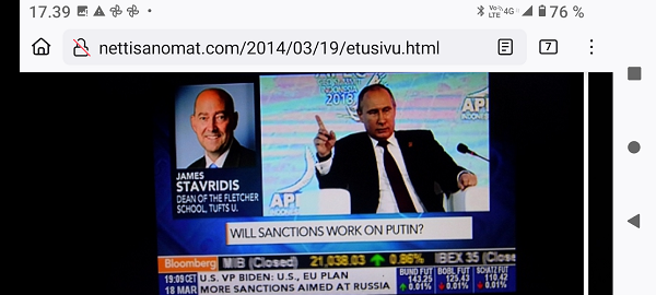 | 11 vuotta sitten. Krim ja Suomikin 11.3. - 9.4.2014 11.3.2014 "Krim joutunee joka tapauksessa Venäjän haltuun tavalla tai toisella. (Ensimmäinen kannanotto Ukrainan veriseen vallankumoukseen). Täytyy toivoa, että ruumiit jäivät tähän ja että yritetään selvittää, edes yritetään, kuka oikein ampui ja kenen määräyksestä, lähes 100 nuorta miestä Kiovassa. Haag odottaa, jos ampumiset pystytään selvittämään." Viikkosanomat. Pertti Manninen. Tiistai 2014-03-11 klo 01:54. http://www.nettisanomat.com/2014/03/11/etusivu.html Jäädytetäänkö Harkimonkin rahavarat? Rahanpesuepäilyt liippaavat läheltä. Kauppalehti Maanantai 10.03.2014 klo 18:33: LAINAUS Hartwall Areenan omistaja ukrainalaisten hampaissa. ”Hartwall-areenan ja Jokereiden miljardööriosakkaan Gennadi Timtšenkon ja hänen ruotsalaisen liikekumppaninsa Torbjörn Törnqvistin öljy- ja kaasukauppayritystä Gunvor Groupia epäillään Ukrainassa Putinin rahanpesijäksi. http://www.nettisanomat.com/2014/03/11/etusivu.html 18.3.2014 ILTA-SANOMAT Maanantai 17.3.2014 19.3.2014 1.4.2014 http://www.nettisanomat.com/2014/04/01/etusivu.html 9.4.2014 Kuvat Pertti Manninen. Krim ja Suomikin 11.3. - 9.4.2014 Pääkirjoitus. |