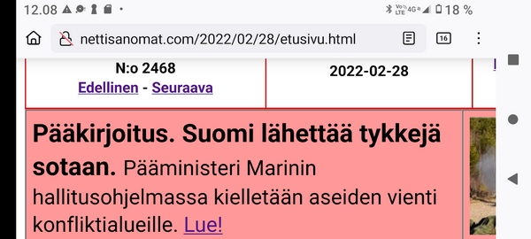 http://www.nettisanomat.com/2022/02/28/etusivu.html N:o 2468 Edellinen - Seuraava Muista rokotus! Maanantai 2022-02-28 http://www.nettisanomat.com/2022/02/28/etusivu.html http://www.nettisanomat.com/2022/02/28/etusivu.html#sunnuntai20220227kuva http://www.nettisanomat.com/2022/02/28/etusivu.html#maanantai20220228kuvakokonaan Sivun otsikko 28.2.2022. Maanantai |