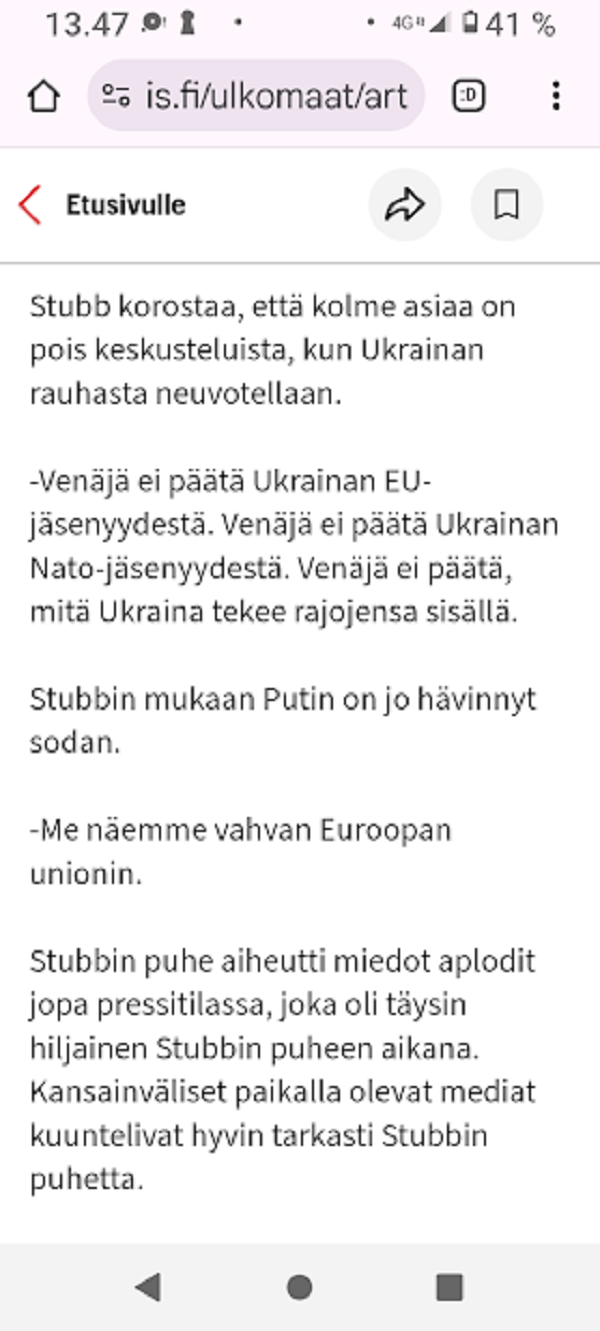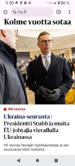 STOPP STUBB! ![]() Kolme vuotta sotaa - Presidentti Stubb ja muita EU-johtajia vierailulla Ukrainassa - Suomi osallistuu Ukrainan uuden taisteluprikaatin perustamiseen - Pohjoismaat ja Baltian maat julistavat tukea Ukrainan Nato-tielle - Lähetys Ukrainasta: Presidentti Stubbilta tiukka viesti Putinille Stubb korostaa, että kolme asiaa on pois keskusteluista, kun Ukrainan rauhasta neuvotellaan. Venäjä ei päätä Ukrainan EU-jäsenyydestä. Venäjä ei päätä Ukrainan Nato-jäsenyydestä. Venäjä ei päätä, mitä Ukraina tekee rajojensa sisällä. Stubbin mukaan Putin on jo hävinnyt sodan. - Me näemme vahvan Euroopan unionin. |