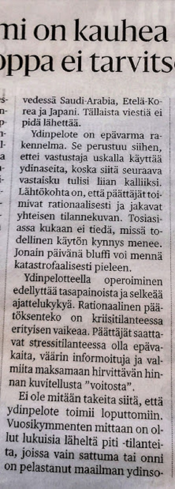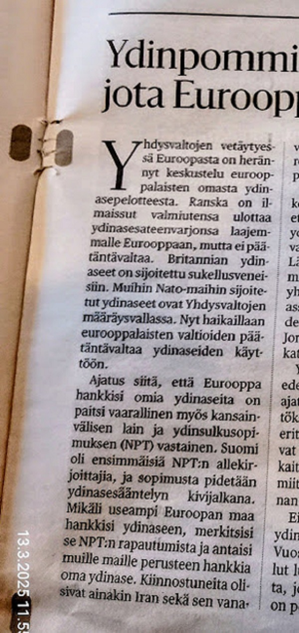 Ajatus siitä, että Eurooppa hankkisi omia ydinaseita on paitsi vaarallinen myös kansainvälisen lain ja ydinsulkusopimuksen (NPT) vastainen. Suomi oli ensimmäisiä NPT:n allekirjoittajia, ja sopimusta pidetään ydinasesääntelyn kivijalkana. Mikäli useampi Euroopan maa hankkisi ydinaseen, merkitsisi se NPT:n rapautumista ja antaisi muille maille perusteen hankkia oma ydinase. Kiinnostuneita olisivat ainakin Iran sekä sen vanavedessä Saudi-Arabia, Etelä-Korea ja Japani. Tällaista viestiä ei pidä lähettää. Ydinpelote on epävarma rakennelma. Se perustuu siihen, ettei vastustaja uskalla käyttää ydinaseita, koska siitä seuraava vastaisku tulisi liian kalliiksi. Lähtökohta on, että päättäjät toimivat rationaalisesti ja jakavat yhteisen tilannekuvan. Tosiasiassa kukaan ei tiedä, missä todellinen käytön kynnys menee. Jonain päivänä bluffi voi mennä katastrofaalisesti pieleen.Ydinpelotteella operoiminen edellyttää tasapainoista ja selkeää ajattelukykyä. Rationaalinen päätöksenteko on kriisitilanteessa erityisen vaikeaa. Päättäjät saattavat stressitilanteessa olla epävakaita, väärin informoituja ja valmiita maksamaan hirvittävän hinnan kuvitellusta ”voitosta”. Ei ole mitään takeita siitä, että ydinpelote toimii loputtomiin. Vuosikymmenten mittaan on ollut lukuisia läheltä piti -tilanteita, joissa vain sattuma tai onni on pelastanut maailman ydinsodalta. Kuten YK:n pääsihteeri Antonio Guterres on todennut: onni ei ole strategia.