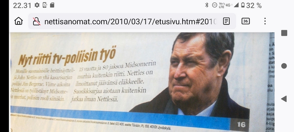Nettles. Keskisuomalainen: Nyt riitti tv-poliisin työ. Keskisuomalainen. Torstai 2010-03-09. Kuva Pertti Manninen. Meille suomalaisille brittinäyttelijä John Nettles on yhä kasarisarjan poliisi Jim Bergerac. Viime aikoina Nettlesiä on työllistänyt Midsomerin murhat, poliisin rooli siinäkin. 18 vuotta ja 80 jaksoa Midsomerin murhia riitti. Nettles on ilmoittanut jäävänsä eläkkeelle. |