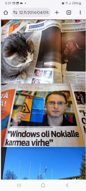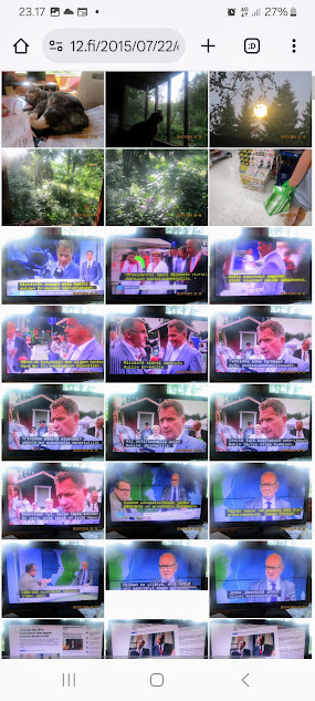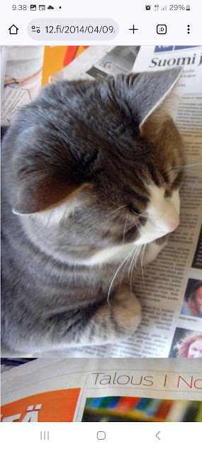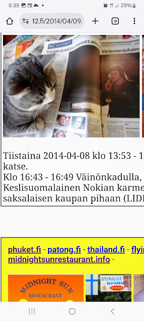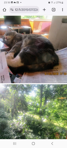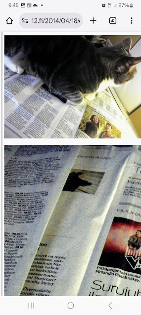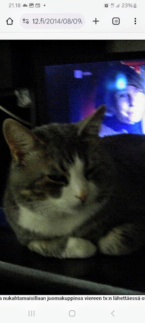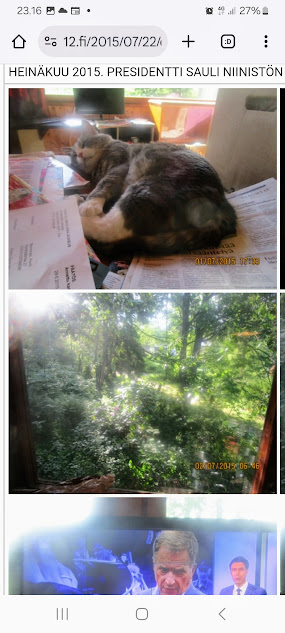 Sanomanetti nro 3100 - Torstai 26.6.2025. - Arkisto. - Rasmuksen matkassa 17 vuotta. Kiitos. Lue! - 2008 - 2009. Täällä - 2010 - 2011. Täällä - 2012 - 2013. - Täällä --- Arkisto. 3.2.2014. Valtiontalolla yllätysten päivä. Vielma voitti kiistan Valtiontalosta. Keskisuomalainen perjantaina 24.01.2014. Kissa: Rasmus. Kuvat: Pertti Manninen. Isonna! - 9.4.2014. "Suomi joutuu muuttamaan tietolainsäädäntöään". Keskiviikkona 09:29 - 15:57 HS tietolainsäädännöstä - Keslisuomalainen Nokian karmeasta virheestä - Agricolan muistamista Laukaan kunnantalolla - Pinkki mopo kaartaa saksalaisen kaupan pihaan (LIDL). Kuvat: Pertti Manninen. Keski-Suomi. Jyväskylä ja Laukaa. Isonna! - 18.4.2014. "... kun Rasmuskin siinä oleili hollilla." Keskisuomalaisen ja muidenkin lehtien tv-kriitikko Marko Ahonen kirjoitti Pitkäperjantain tv-ohjelmista otsikolla "Surujuhla ilman surua". Hän vei kynän kädestäni. Kun aamulla tutkailin ohjelmistoa niin Helsingin Sanomista kuin Keskisuomalaisestakin, niin en mitään löytänyt. Ajattelin mielessäni, miksi ei voitaisi esittää joka pääsiäinen Pasolinin "Matteuksen evankeliumia", jonka olen nähnyt vuosikymmenten aikana ainakin kymmenen kertaa. Kanavia Ylelläkin on ihan riittävästi saada se johonkin rakoseen sovitettua, mielestäni. Päätin sitten yrittää etsiä sen jostakin kätköstä, DVD:n olen hankkinut joku vuosi sitten jostain alennusmyynnistä. Ohjelmakarttaa aikani tutkisteltuani, pääsin sitten sivun eteenpäin ja hämmästykseni oli suuri: toimittaja Marko Ahonen kirjoitti samasta aiheesta ja eihän siinä sitten kannattanut kuin kiireesti kuvata sivu, kun Rasmuskin siinä oleili hollilla. Myöhemmin hain paremman kameran ja tallensin artikkelin. Kuvat perjantaina 2014-04-18 klo 07:05 ja 07:15. - 24.7.2014. "Väsähtänyt kissa nauttii olostaan isännän uudella vuoteella." Kuvaviikko keskiviikosta 09.07.2014 alkaen. Perjantai 11.07. Väsähtänyt kissa nauttii olostaan isännän uudella vuoteella. Sunnuntai 13.07. Gaza palaa Sataman kahvilan terassin ruudussa. Suomalainen Vilja ei varmaankaan oikeasti ollut harmistunut päästeessään MM-loppuotteluun. Kuvat: Pertti Manninen. Laukaa. - 24.7.2014. "Kissa pöydällä! Rasmus raapii ikkunaa päästäkseen sisätiloihin." Kuvaviikko keskiviikosta 09.07.2014 alkaen seuraavan viikon perjantaihin 18.07.2014. Torstai 17.07. Kissa pöydällä! Rasmus raapii ikkunaa päästäkseen sisätiloihin. Torstai 17.07. Kissa pöydällä! Rasmus raapii ikkunaa päästäkseen sisätiloihin. Perjantai 18.07. Ravikuningas viettää eläkepäiviään Laukaan vihreällä niityllä. Kuvat: Pertti Manninen. Laukaa. -l 9.8.2014. "Rasmus-kissa nukahtamaisillaan juomakuppinsa viereen tv:n lähettäessä ohjelmaa Tove Janssonin elämästä tutun musiikin soidessa." Tove Jansson 100 vuotta tänään. Kuva: Rasmus-kissa nukahtamaisillaan juomakuppinsa viereen tv:n lähettäessä ohjelmaa Tove Janssonin elämästä tutun musiikin soidessa. Perjantaina 08.08.2014 klo 18:46. Kuva: Pertti Manninen. Isonna! Katso myös! Joulukuu 2013. "Unelma valkeasta joulusta" - "Ja aamulla ..." Kuvat Mitäs tämä on? - Mutta peikko kulta, miten sait nelosen käytöksestä? Kuvasarja - 29.1.2015. "Rasmus jää kotiin nukkumaan." Matkalla Suomessa keskiviikkona 28.01.2015 Keski-Suomesta Pirkanmaalle 0-kelissä. Rasmus jää kotiin nukkumaan - Koulutytöt vetävät reppupulkkiaan - Mies ja makkaramainos. Kuvat: Pertti Manninen 2015-01-28 keskiviikkona 09:10 - 12:42 matkalla Laukaasta ensin Koivurannan bussilla Jyväskylään ja sitten 9-tietä pitkin Tampereen Kalevaan. Matka jatkui sitten Tampereen Hervannan kautta Loimaalle ja Humppilaan ja takaisinkin lähtöpisteeseen, mutta se on jo sitten ihan oman tarinansa. - 22.4.2015. "LEHTIKATSAUS." HUHTIKUU 2015. LEHTIKATSAUS. VAALIT. ÄÄNEKOSKI. KUVAT Tiistai 21.04.2015. ISO NRO - METRO Kuvat: Pertti Manninen 2015-04-22 aamulla. ISONNA! -l 19.6.2015. "Rasmus-kissakin on erityisen kiinnostunut tästä otuksesta, jonka hän näkee ensimmäistä kertaa elämässään." KESÄKUU 2015. "KUN PEURA KESKEYTTI ILLAN UUTISLÄHETYKSEN ..." KUVASARJA. Ylen uutislähetyksessä torstaina 18.06.2015 valtiovarainministeri Alexander Stubb kertoo Kreikan taloustilanteesta ja ex-pääministeri Esko Aho Venäjän kaupasta yleensä ja maa-alueiden kaupasta. Kuvatekstit ovat samaan aikaan lähetetystä toisesta ohjelmasta, jossa kerrotaan uusista energiamuodoista ja niiden kehittämisestä. Tykkikuva muistuttaa Waterloon taistelun 200-vuotispäivästä ja kirjakuvat Akateemisen kirjakaupan myymisestä Bonnierille. Peura saapuu ikkunan alle ja kiinnittää kaiken huomion tässä uudessa ympäristössä. Rasmus-kissakin on erityisen kiinnostunut tästä otuksesta, jonka hän näkee ensimmäistä kertaa elämässään. Uutislähetys jatkuu Juhannuksen liikenteestä kertovalla jutulla. Kuvat: Pertti Manninen. Uusimaa. Kirkkonummi. Kauhala klo 20:35 - 20:52. ISONNA! https://www.nettisanomat.com/2015/06/19/etusivu.html 20.6.2015. "JUHANNUSAATTONA ENNEN ILTAA." KESÄKUU 2015. JUHANNUSAATTONA ENNEN ILTAA. 39 KUVAA. Kuvat: Pertti Manninen. Ilta-Sanomat ja Iltalehti torstai 18.06.2015. Uusimaa. Kirkkonummi. Lapinkylä ja ympäristö perjantai 19.06.2015 klo 05:06 - 14:08. ISONNA! - 7.22.2015. "KISSAN NIMI ON RASMUS, JOKA NUKAHTAA PAPEREIDEN PÄÄLLE JA KATSELEE KUUTA." HEINÄKUU 2015. PRESIDENTTI SAULI NIINISTÖN SELITYS, MIKSEIVÄT VENÄLÄISET PÄÄSSEET ETYK-JUHLAKOKOUKSEEN JA MUITAKIN KUVIA. 24 KUVAA. KISSAN NIMI ON RASMUS, JOKA NUKAHTAA PAPEREIDEN PÄÄLLE JA KATSELEE KUUTA. Kuvat: Pertti Manninen Ylen uutislähetyksestä teksteineen. Uusimaa. Kirkkonummi. Lapinkylä keskiviikko 01.07.2015 ja torstai 02.07.2015. ISONNA! - 8.8.2015. Rasmus väsähtää telakkauutisiin. Kuva. Pertti Manninen tiistaina 2013-01-15 09:13. HS: Telakalle haetaan pikaratkaisua- Keskisuomalainen: Telakkateollisuuden pelastajaa ei tunnu löytyvän. HEINÄKUU 2015. JUHLAA. TYÖTÄ JA HISTORIAAKIN ERÄÄNÄ HELLEPÄIVÄNÄ 04.0
