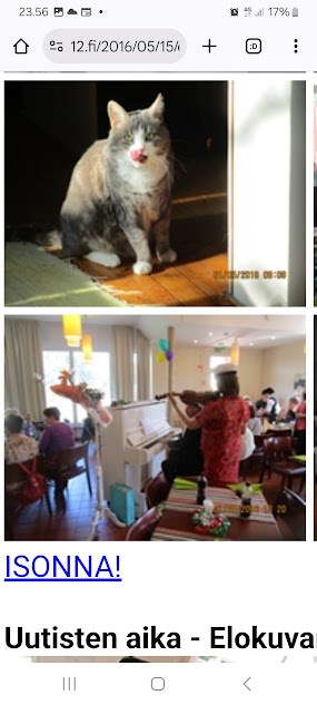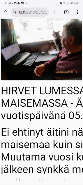 Sanomanetti nro 3101 - Lauantai 28.6.2025. - Arkisto. - Rasmuksen matkassa 17 vuotta. Kiitos. Lue! 5.3.2016. HIRVET LUMESSA UUDESSA MAISEMASSA. "Poika ja Rasmus-kissa ihailevat harvemmin ohi loikottavia hirviä." HIRVET LUMESSA UUDESSA MAISEMASSA - Äidin 100-vuotispäivänä 05.03. Ei ehtinyt äitini nähdä tätä maisemaa kuin sielunsa silmillä. Muutama vuosi kuolemansa jälkeen synkkä metsä hakattiin kokonaan pois ja niin maisema avartui ja ilta-aurinkokin paistaa kesällä myöhään yöhön. Kaivon rengas on jäänyt muistuttamaan menneestä, isästäkin, ja varastokin on rakennettu myöhemmin. Poika ja Rasmus-kissa ihailevat harvemmin ohi loikottavia hirviä, peurojahan kulkee päivittäin puhumattakaan pienemmistä. (Lapsenlapsi syleilee mummiaan lähtiessään kotimatkalleen tämän 90-vuotispäiviltä.) Kuva Kuvat: Pertti Manninen helmikuun sunnuntaina 21.02.2016 klo 11:09. ISONNA! - 15.5.2016. VAPPUNA 2016. Ruoan aika, - Soiton aika, VAPPUNA 2016. Marssin aika, 3 kuvaa - Lakin aika, 3 kuvaa - Ruoan aika, 4 kuvaa - Soiton aika, 2 kuvaa - Lasten aika, 2 kuvaa - Uutisten aika 1, 14 kuvaa - Elokuvan aika, 11 kuvaa - Uutisten aika 2, 14 kuvaa - Laulun aika, 1 kuva. HOTELLI NUUKSIO, pianoa soitti Jyrki Niskanen. Kuvat 30.04.2016 - 02.05.2016. Pertti Manninen. ISONNA KUVAT! - 19.11.2017. Arkisto 2015. "KISSAN NIMI ON RASMUS, JOKA NUKAHTAA PAPEREIDEN PÄÄLLE JA KATSELEE KUUTA." Arkisto 2015. HEINÄKUU 2015. PRESIDENTTI SAULI NIINISTÖN SELITYS, MIKSEIVÄT VENÄLÄISET PÄÄSSEET ETYK-JUHLAKOKOUKSEEN JA MUITAKIN KUVIA. KISSAN NIMI ON RASMUS, JOKA NUKAHTAA PAPEREIDEN PÄÄLLE JA KATSELEE KUUTA. Kuvat: Pertti Manninen Ylen uutislähetyksestä teksteineen. Uusimaa. Kirkkonummi. Lapinkylä keskiviikko 01.07.2015 ja torstai 02.07.2015. ISONNA! --- 2008 - 2009. Täällä - 2010 - 2011. Täällä - 2012 - 2013. Täällä - 2014 - 2015. Täällä - 2018- 2019. Täällä - - - - - -- - - - - ---- SMILE from MODERN TIMES - --- Sivu2 - Lauantai 28.6.2025. - Kuvasanomat - Sanomatori - Viikkosanomat - Härkää sarvista - 12.fi - N:o 3101 - 2025-06-28 ja 2025-06-30, nettiin 2025-06-30 09:47, linkkejä 2025-06-30. "Haukkaavan logon" teki Jaikon kurssilla 1999 Mika. Ensimmäisen kerran logo oli lehdessä tortaina 30.9.1999. Pari vuoden jälkeen se korvautui steriilillä kirjainlogolla. Nyt se on taas mukana!